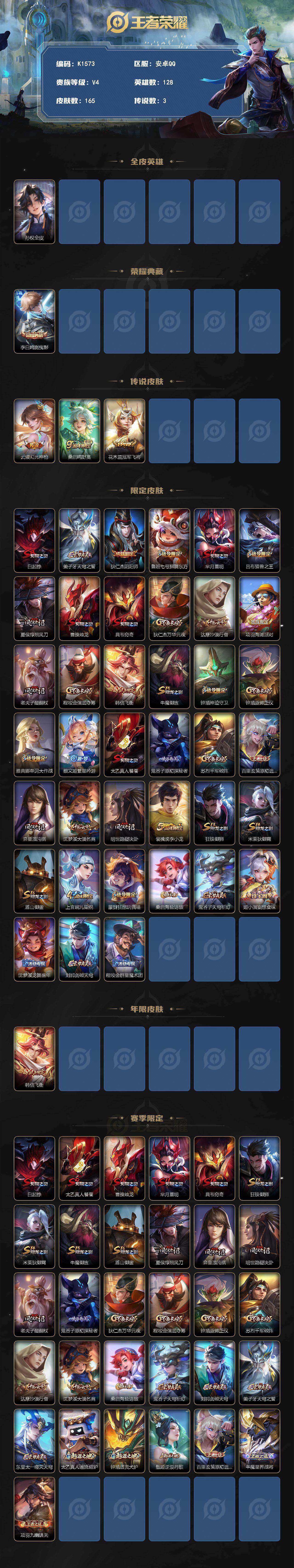 安卓Q-V4-永恒钻石III段位-128英雄-165皮肤-1典藏皮肤-3传说-3