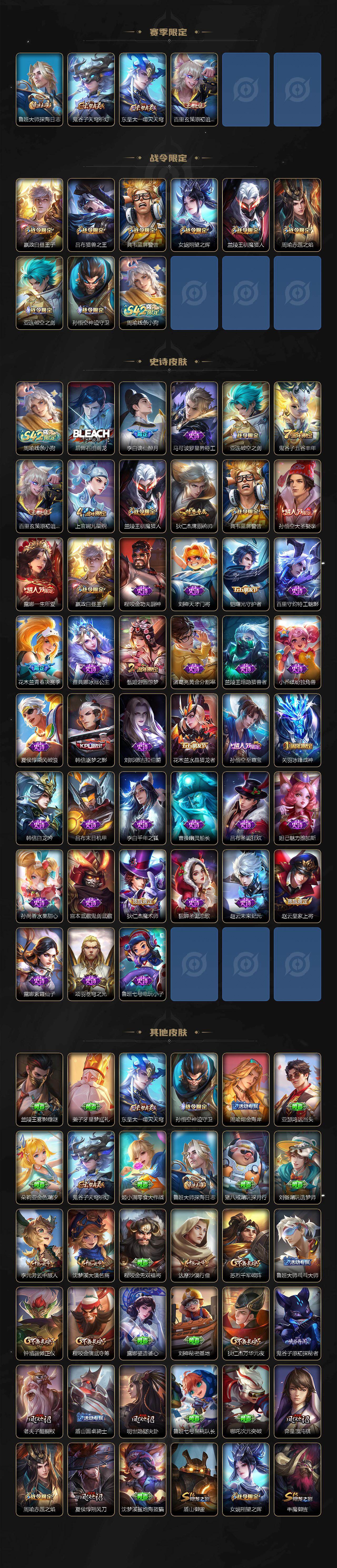 【限定皮肤】:白起狰,李白谪仙醉月,狄仁杰阴阳师,虞姬凯尔特女王,赵云皇家上将,嬴政白昼王子,孙膑妖精王,扁鹊炼金王,芈月重明,吕布猎兽之王,周瑜赤莲之焰,夏侯惇朔风刀,甄姬游园惊梦,曹操烛龙,典韦穷奇,典韦蓝屏警