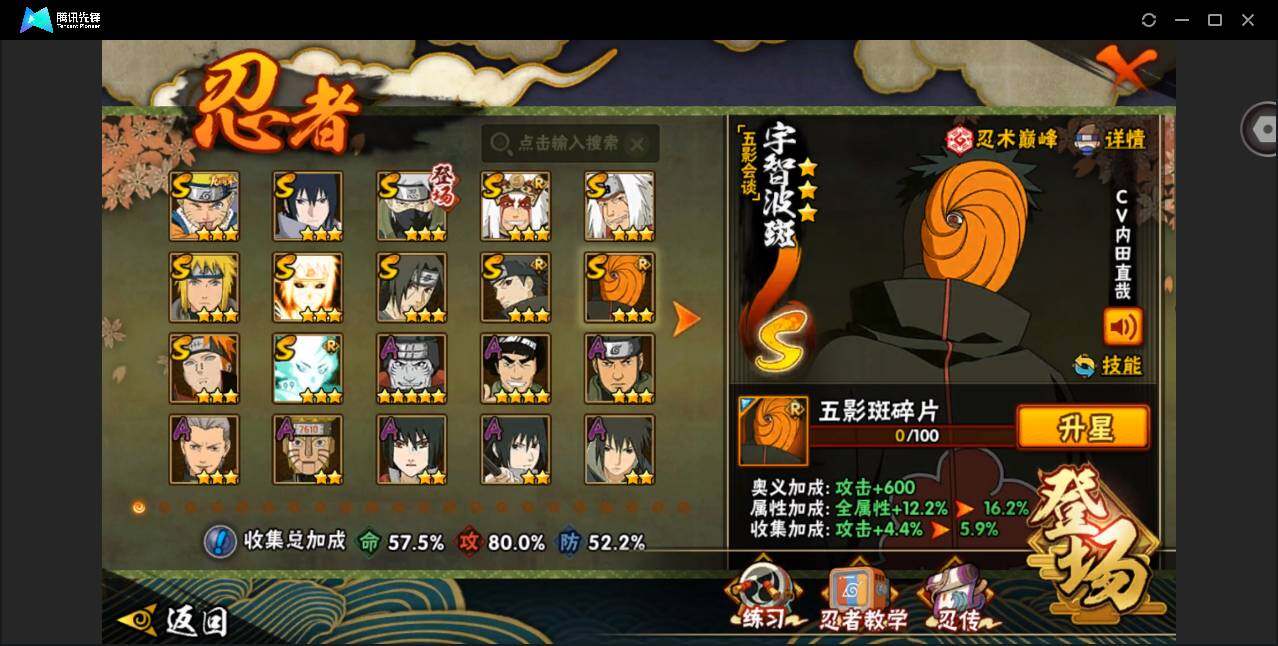 【编号84357 可秒换绑】【店长推荐!极品小号!带有高招s五影斑和高招s传说自来也,还有新出的高招a仙人模式巳月,再是破面带土即将抽出!!】12S级忍者数-28A级忍者数【S级忍者】:宇智波鼬「须佐能乎」(3星),宇智波止水「须佐能乎」(3星),旗木卡卡西「须佐能乎」(3星),自来也「舞之豪杰」(3星),自来也「传说中的三忍」(3星),波风水门(3星),佩恩「天道」(3星),宇智波佐助「永恒万花筒」(3星),大筒木舍人「最终章」(3星),波风水门「九喇嘛连结」(3星),宇智波斑「五影会谈」(3