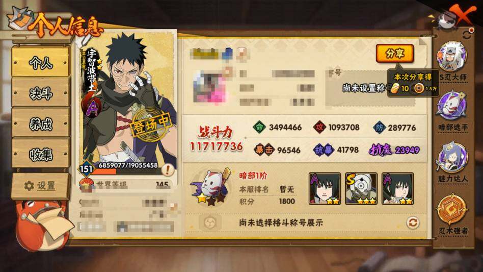 【S级忍者】:长门「秽土转生」(3星),猿飞日斩「秽土转生」(3星),千手扉间「秽土转生」(3星),千手柱间「秽土转生」(3星),宇智波鼬「秽土转生」(3星),宇智波斑「秽土转生·解」(3星),宇智波带土「忍界大战」(3星),艾「忍界大战」(3星),宇智波鼬「须佐能乎」(3星),宇智波止水「须佐能乎」(3星),旗木卡卡西「须佐能乎」(3星),宇智波斑「木叶创立」(3星),罗砂「四代目风影」(3星),自来也「舞之豪杰」(3星),大蛇丸(3星),自来也「传说中的三忍」