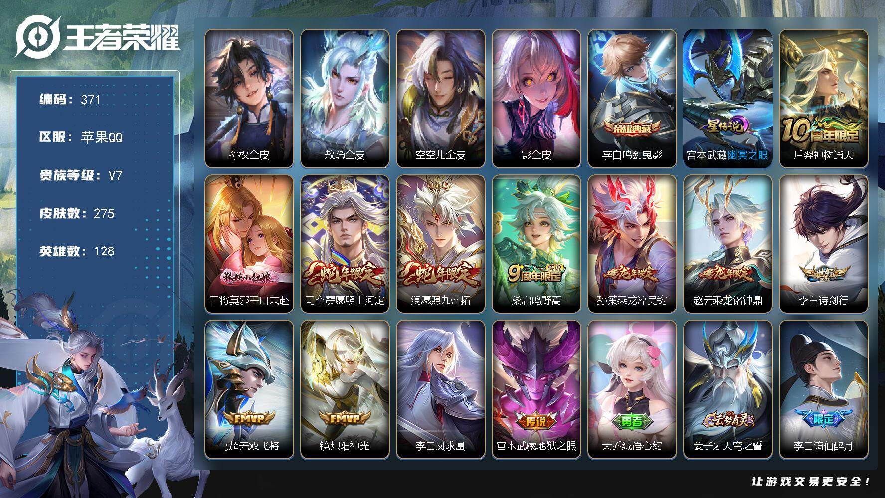 【编号35061,可秒换绑】【极品打野小号,带李白荣耀典藏,,,司空震和澜的蛇年限定,,孙策和赵云的龙年限定,,马超和镜的FMVP,还有最新返厂的凤求凰,,还有许多精品史诗皮李白的谪仙醉月和猴子的至尊宝等,】,苹果Q-V7-最强王者段位-128英雄-275皮肤-1典藏皮肤-12传说-65史诗【英雄全皮】:孙权全皮,敖隐全皮,空空儿全皮,影全皮【荣耀典藏】:李白鸣剑曳影【传说皮肤】:后羿神树通天,干将莫邪千山共赴,司空震愿照山河定,澜愿照九州拓,桑启鸣野蒿,孙策乘龙淬吴钩,赵云乘龙铭钟鼎,李白诗剑