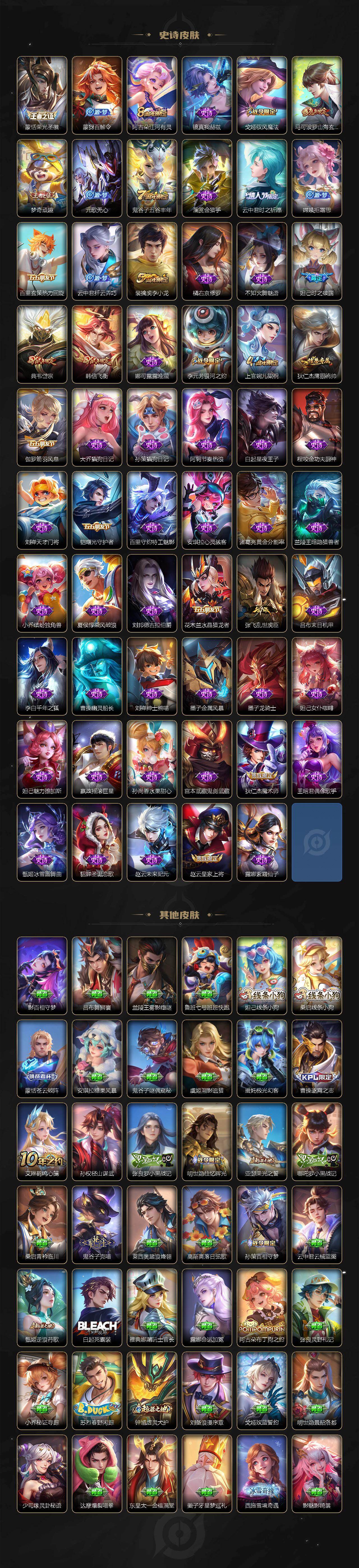 【传说皮肤】:狄仁杰神骥赴朔漠,马超神骥逐星野,澜愿照九州拓,桑启鸣野蒿,云中君群星魔术团,墨子黄金天蝎座,孙策乘龙淬吴钩,赵云乘龙铭钟鼎,澜逐花归海,马可波罗妄想实况,澜电玩雷克斯,曜山海苍雷