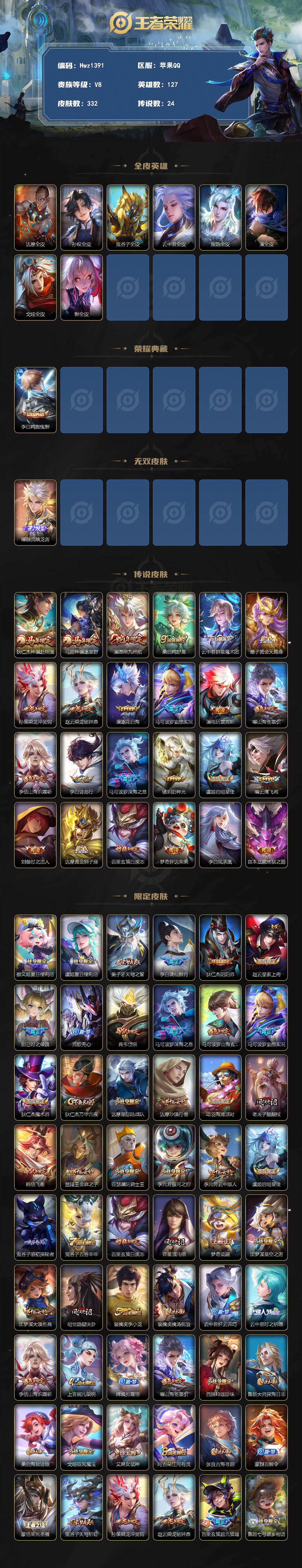 【特价出售】苹果Q-V8-可二次-5市标-17县标-127英雄-332皮肤-1典藏皮肤-1无双-24传说-81史诗(鸣剑曳影、器灵螭龙剑、白虎志、凤求凰)