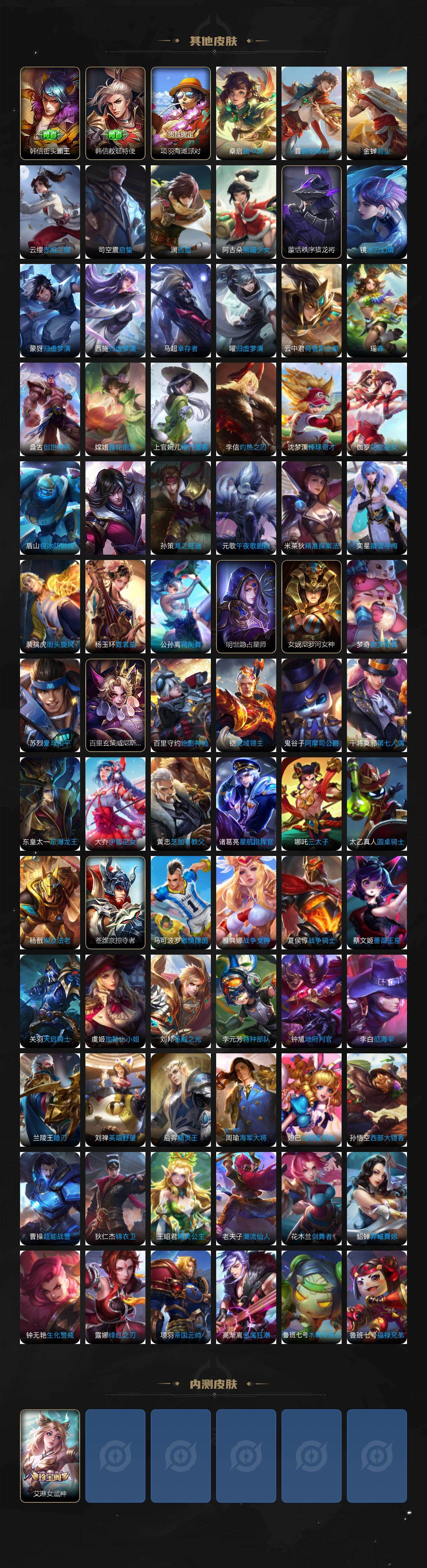 【英雄全皮】:达摩全皮,孙权全皮,鬼谷子全皮,云中君全皮,敖隐全皮,澜全皮,戈娅全皮,影全皮