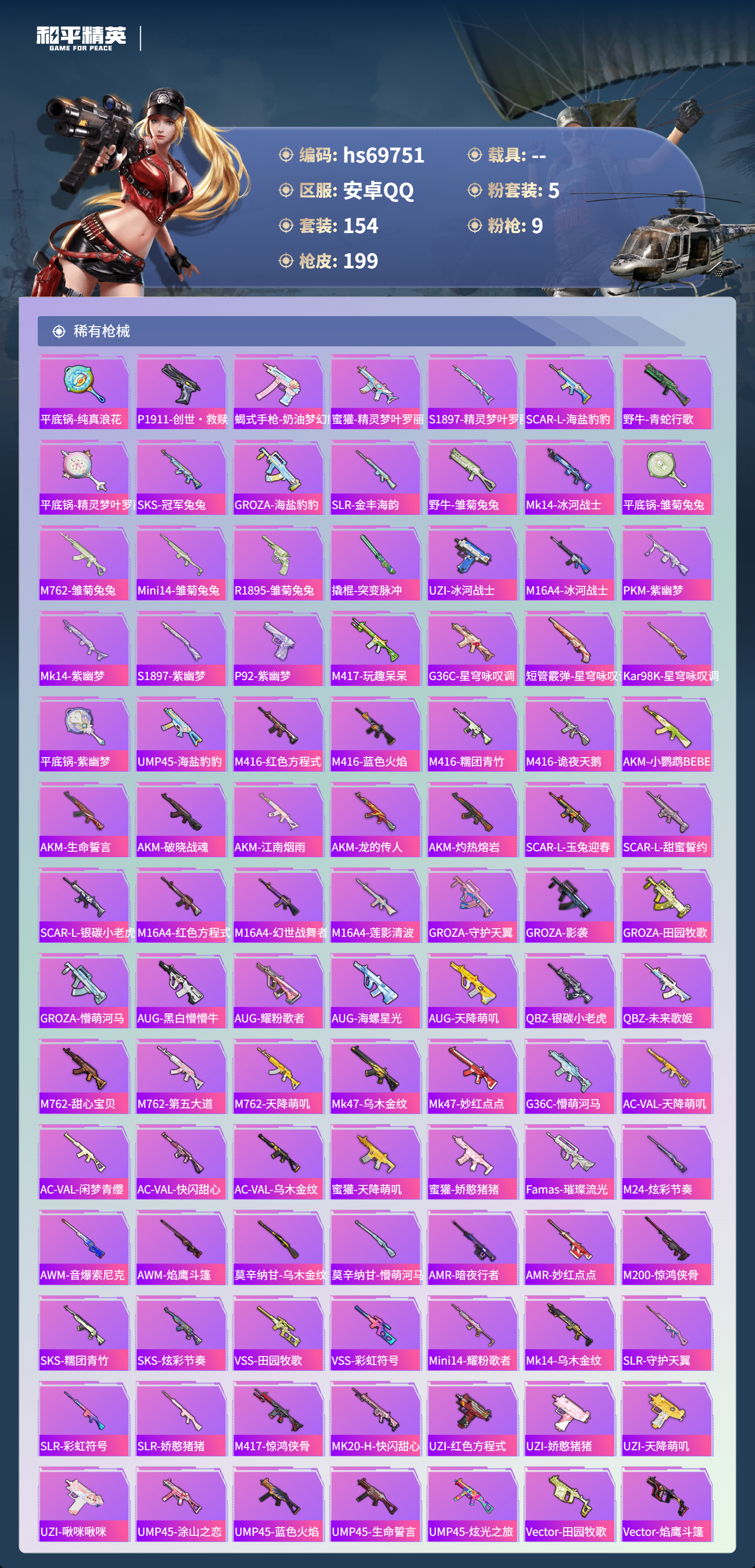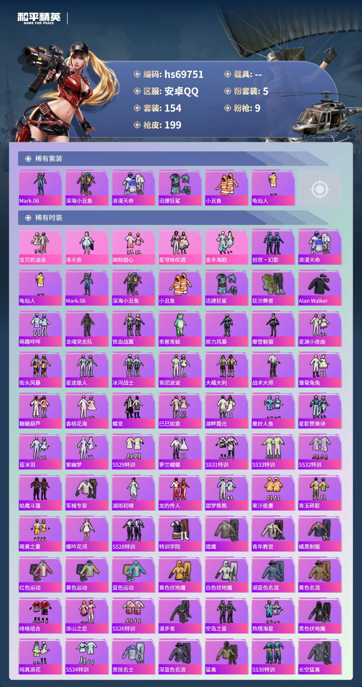 hs69751 安卓手Q-9王牌印记-5粉装-9特效枪-60805热力值-154套装-199枪皮