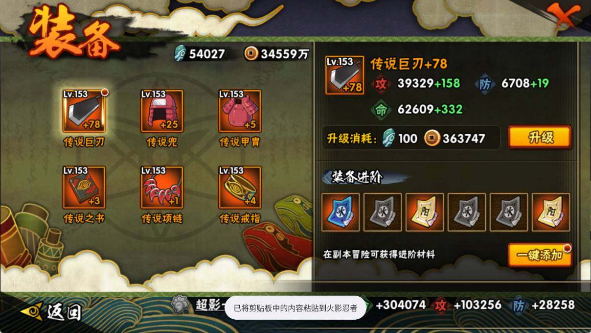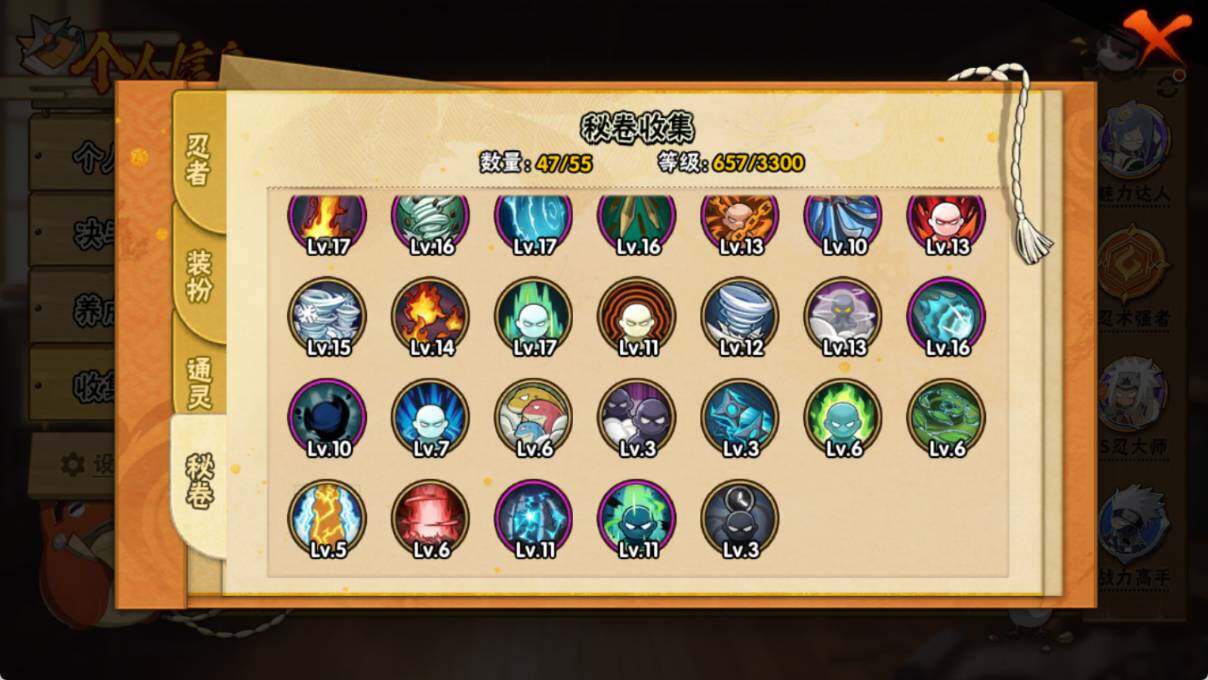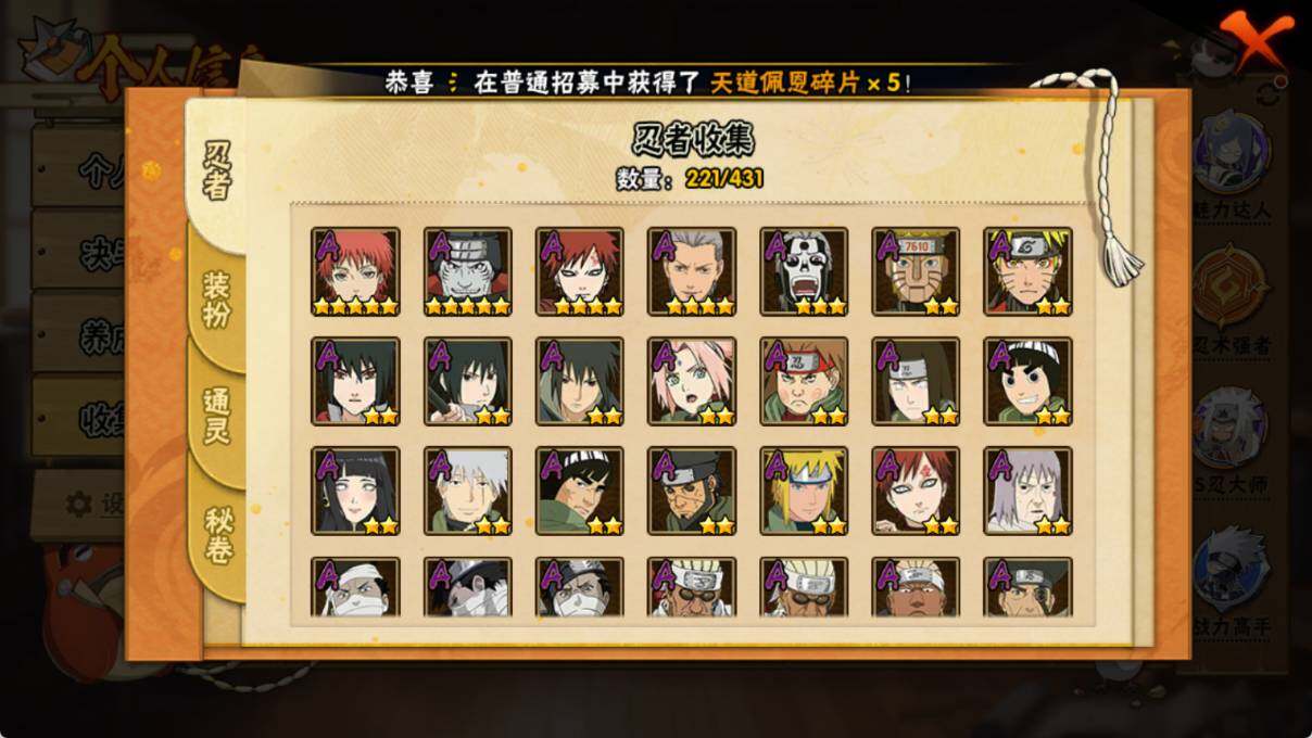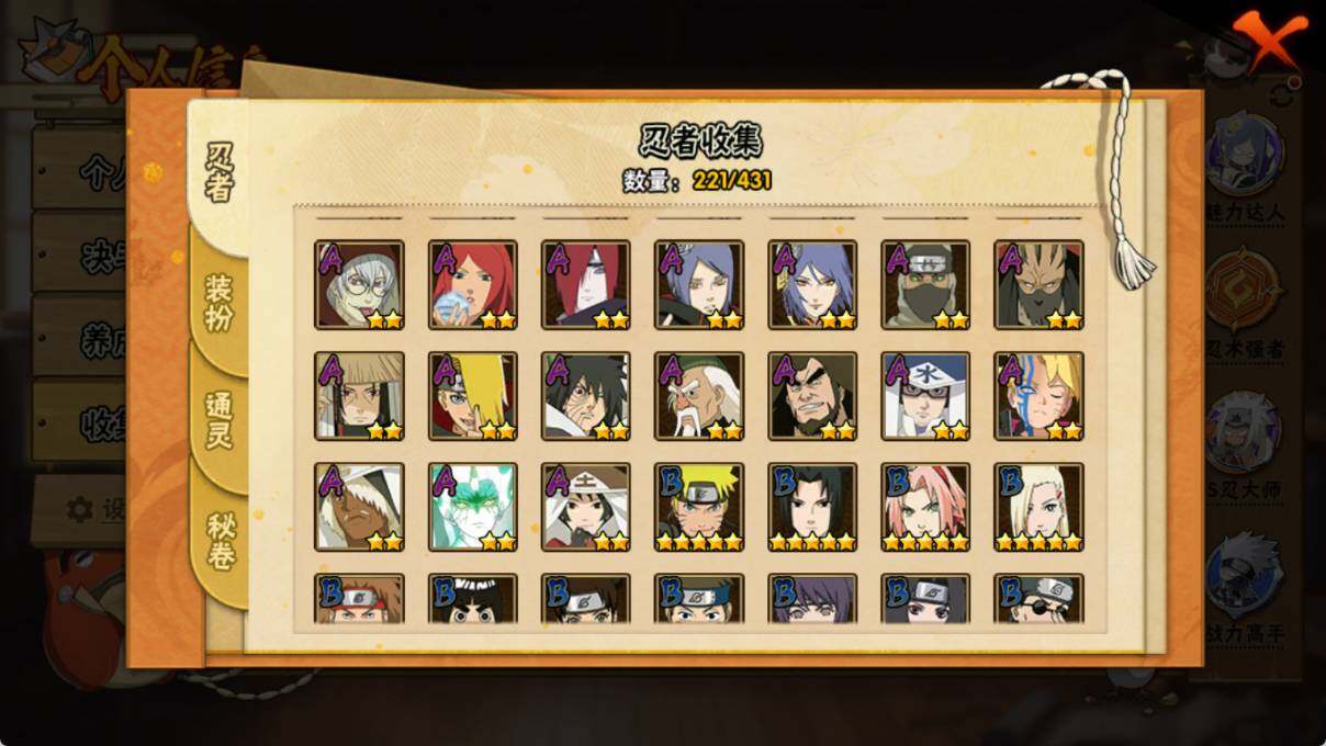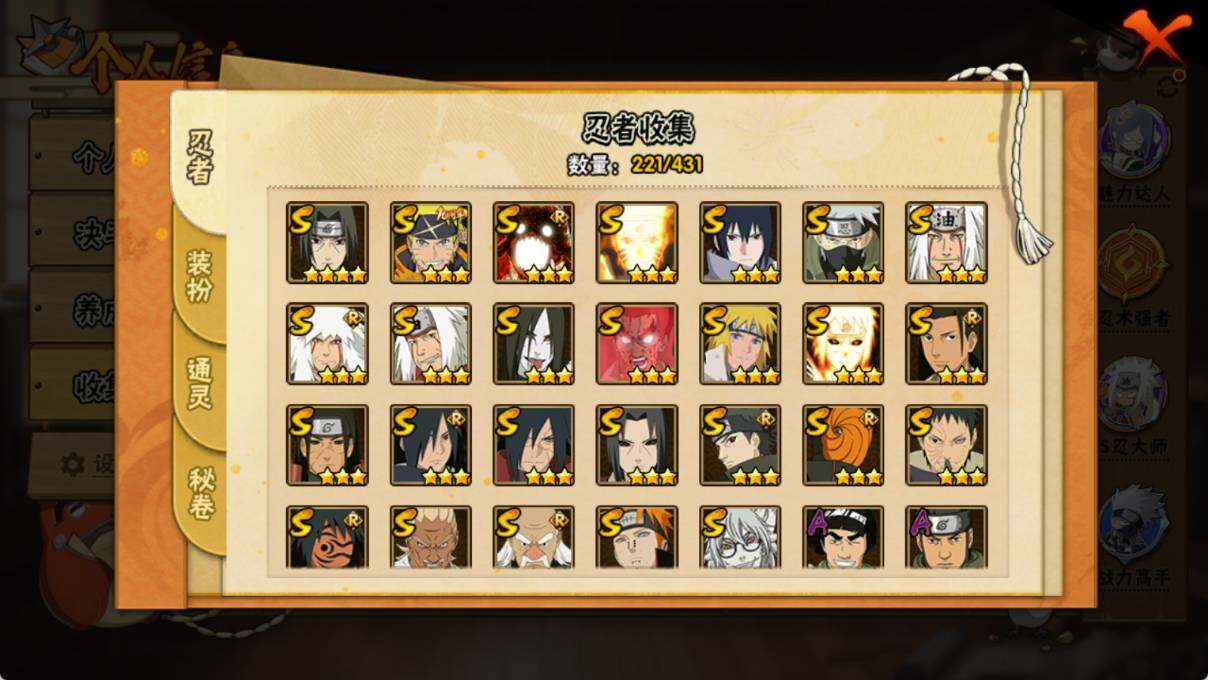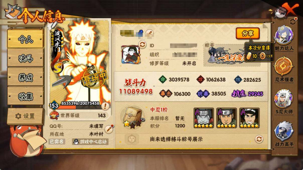 VIP等级V10/战力1108W/S忍数量26/A忍数量47