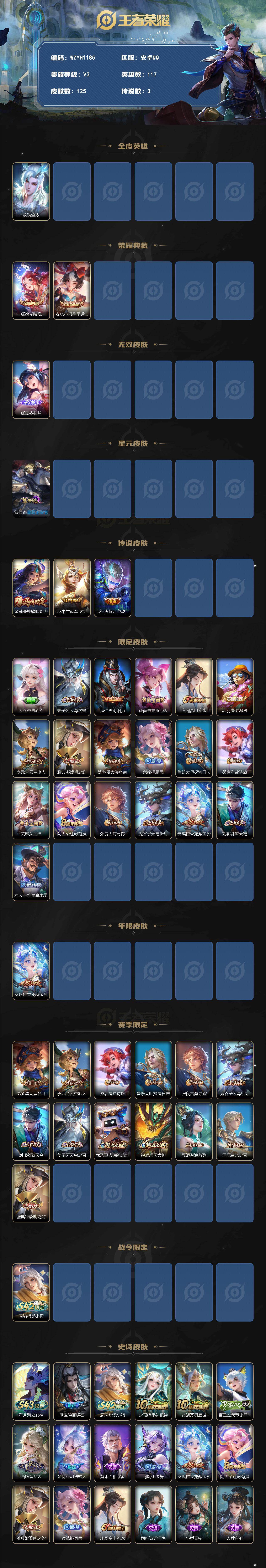【WZYH1185】贵族等级3/荣耀典藏数量2/传说皮肤数量3/史诗皮肤数量35/皮肤数量125/英雄数量117/段位永恒钻石/敖隐全皮/瑶-拾光映像/安琪拉颠倒童话魔镜/瑶-真我赫兹/狄仁杰-星际治安官/朵莉亚神骥鸣幻洲/花木兰-冠军飞将/狄仁杰-超时空战士/大乔-绒语心约/姜子牙-天穹之誓/狄仁杰-阴阳师/孙尚香-蔷薇恋人/庄周-高山流水/项羽-海滩派对/李元芳-云中旅人/雅典娜-黎明之约/沈梦溪-大漠名商/嫦娥-拒霜思/鲁班大师-探海日志/桑启-海盐诗旅/艾琳-女武神/阿古朵-江河有灵/张