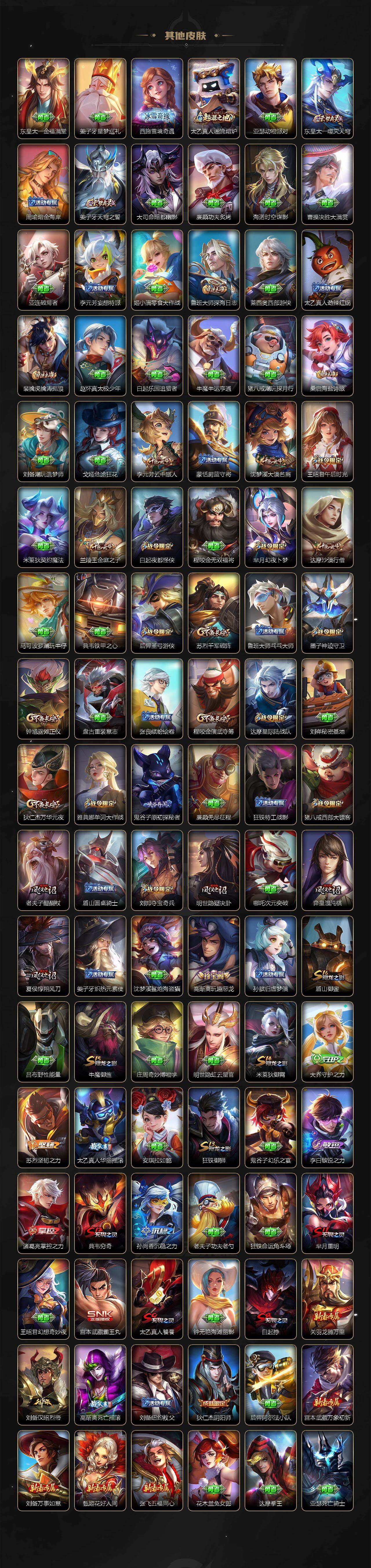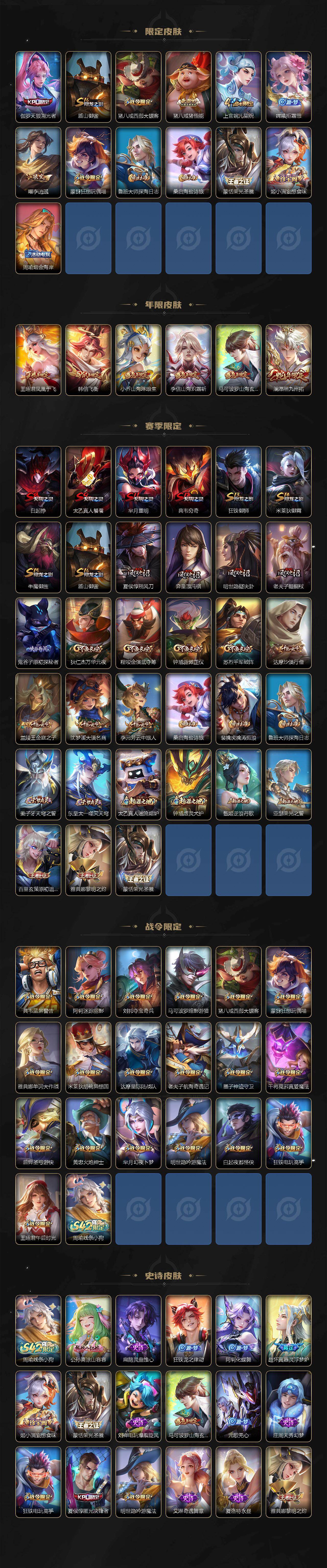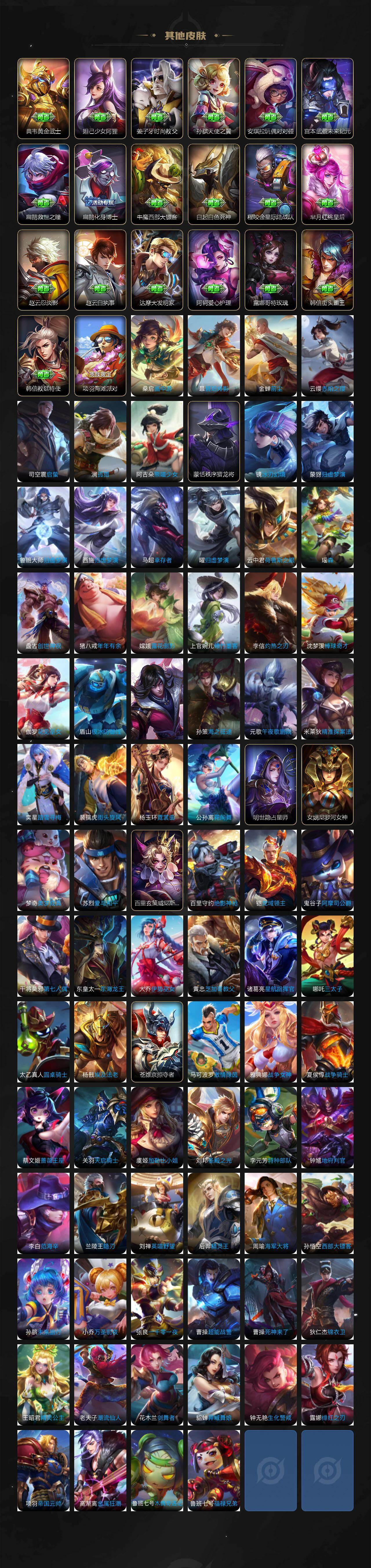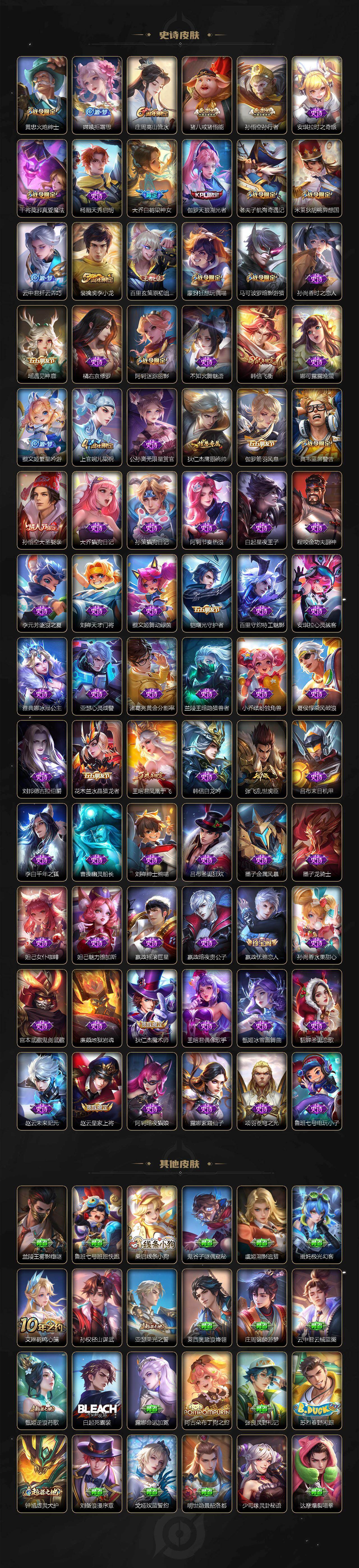 【传说皮肤】:后羿神树通天,澜愿照九州拓,云缨幻光神枪,桑启鸣野蒿,小乔山海琳琅生,李信山海炽霜斩,露娜启示之音,貂蝉遇见胡旋,赵云淬星耀世,西施游龙清影,曜李逍遥 ,周瑜音你心动,小乔音你心动,镜炽阳神光,虞姬启明星使,干将莫邪久胜战神,貂蝉仲夏夜之梦,孙尚香末日机甲,宫本武藏地狱之眼,孙悟空地狱火,武则