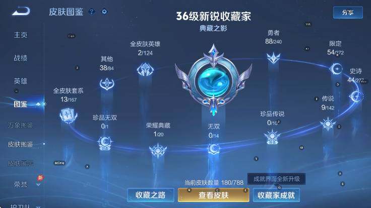 贵族等级7/荣耀典藏数量1/传说皮肤数量9/史诗皮肤数量42/皮肤数量180/英