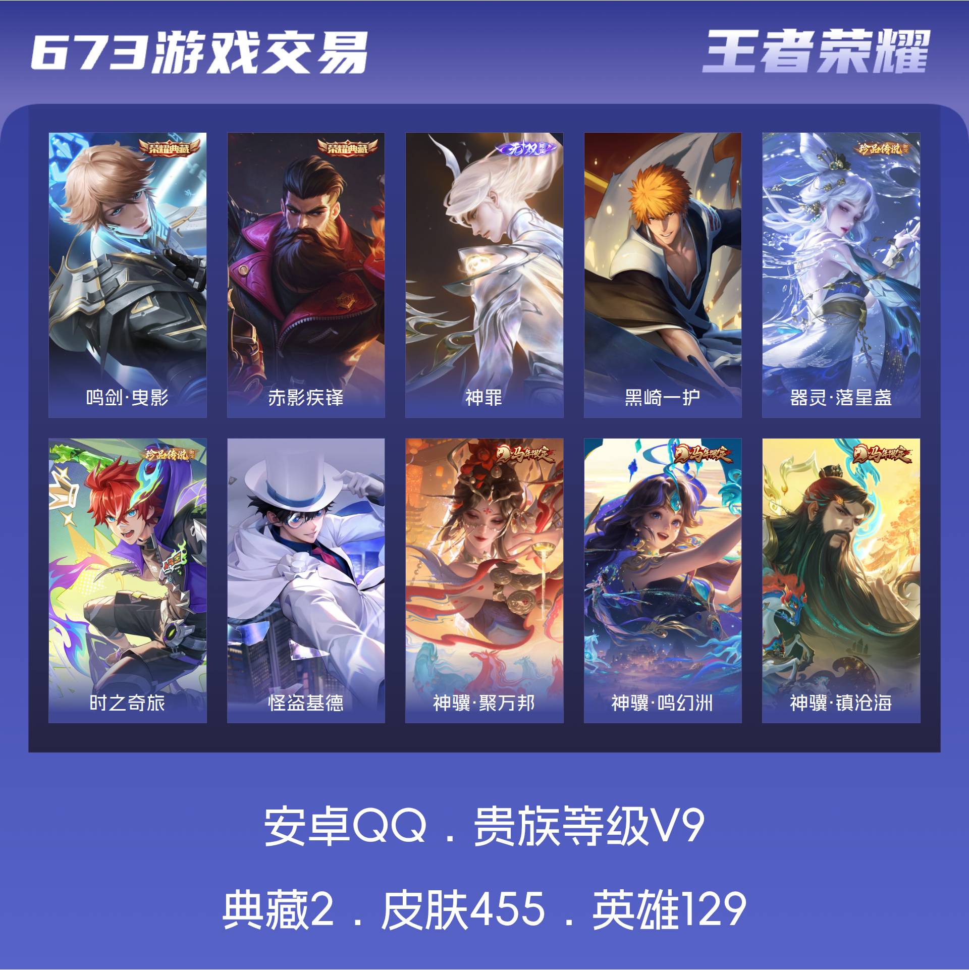 V9 皮肤455 英雄129 至尊星耀 荣耀典藏2 无双皮肤1 珍品传说4 传说42
