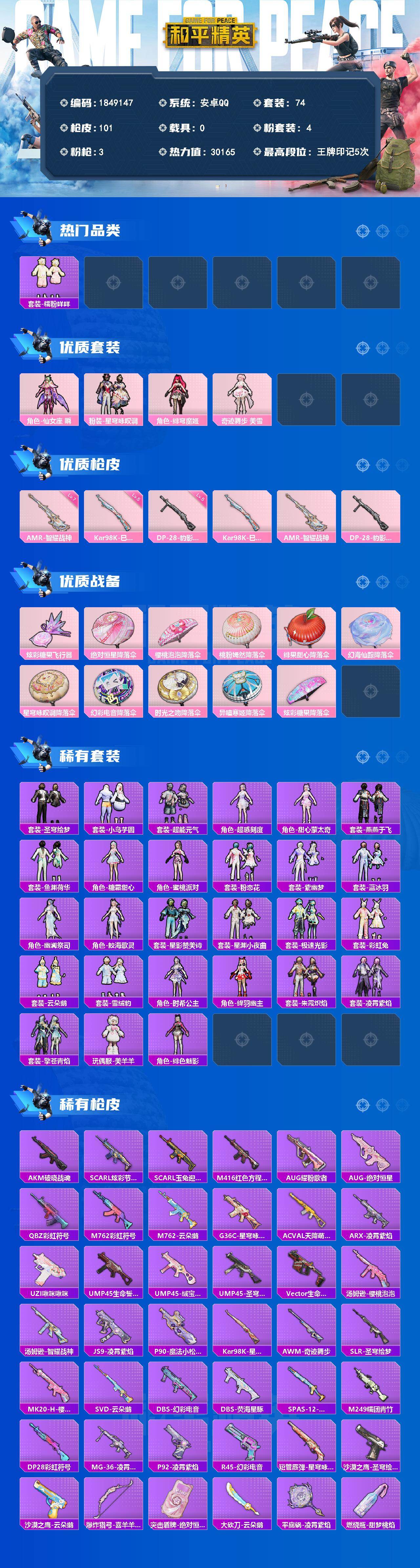 W16524 可立即换绑无需挂单养号 安卓 手Q-4粉装-3特效枪-0载具-1粉色飞行器-30165热力值-5王牌印记-74套装-101枪皮
