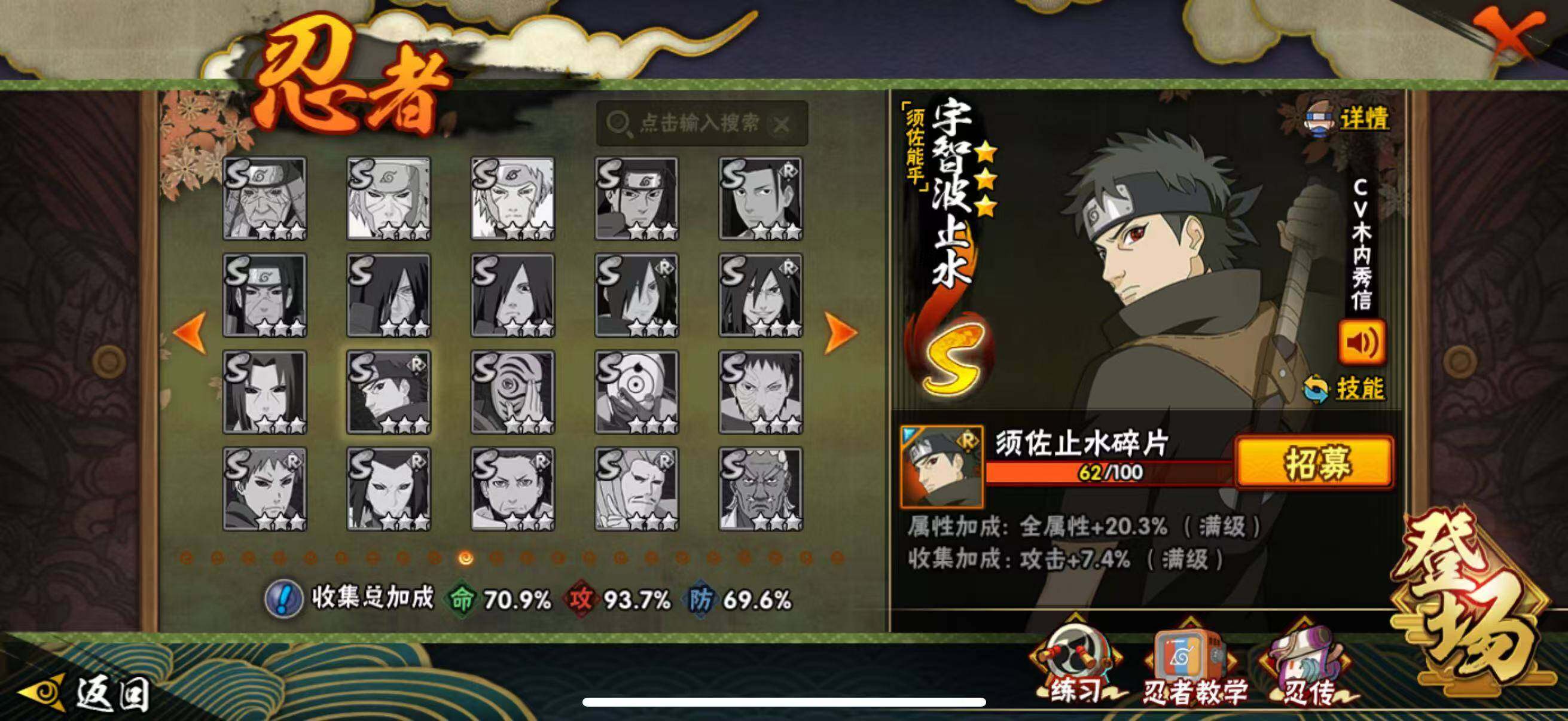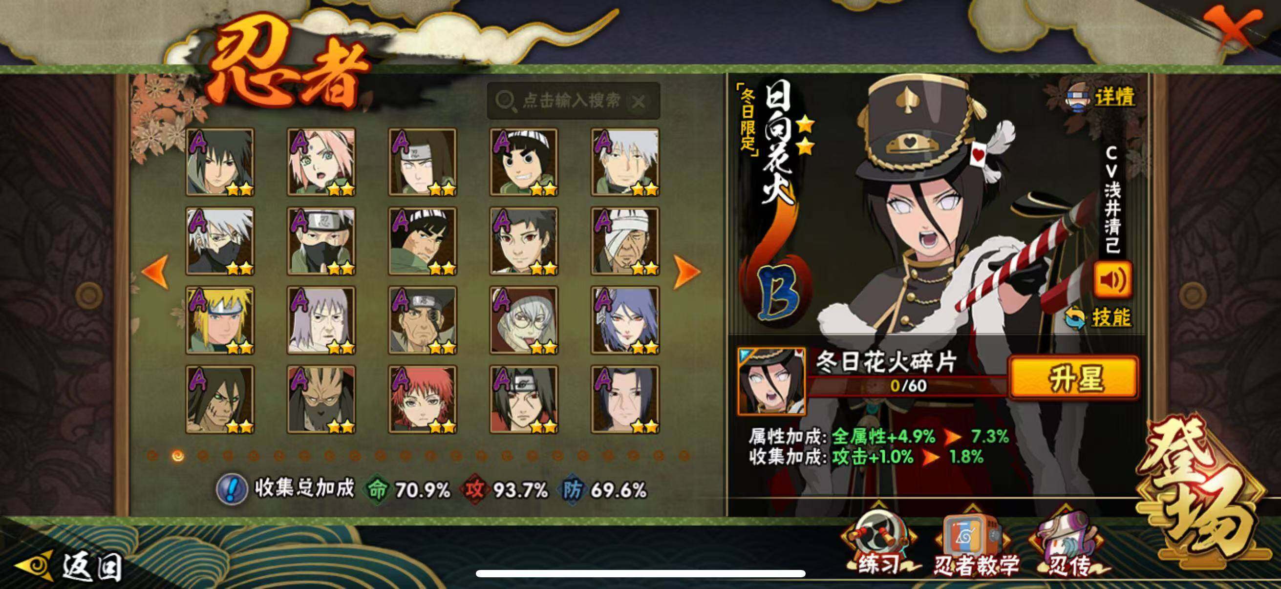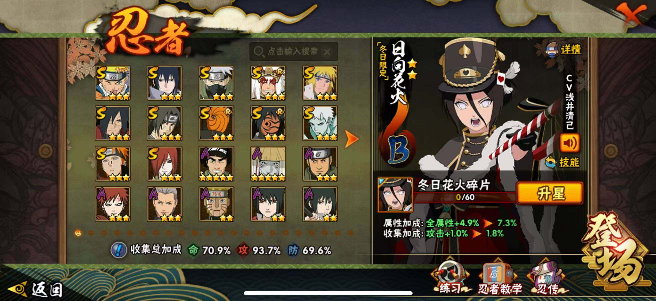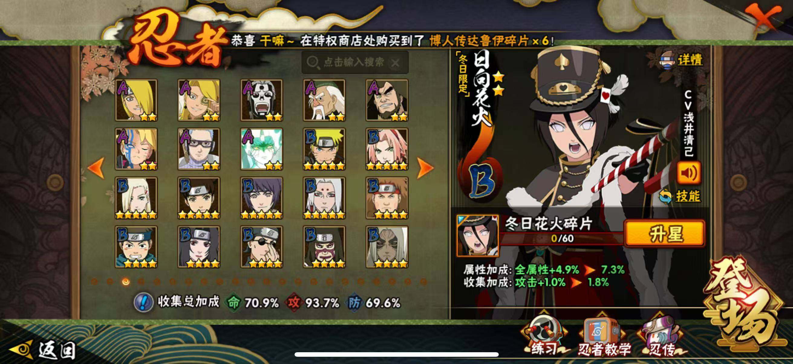 VIP等级V10/战力764W/S忍数量12/A忍数量36/忍