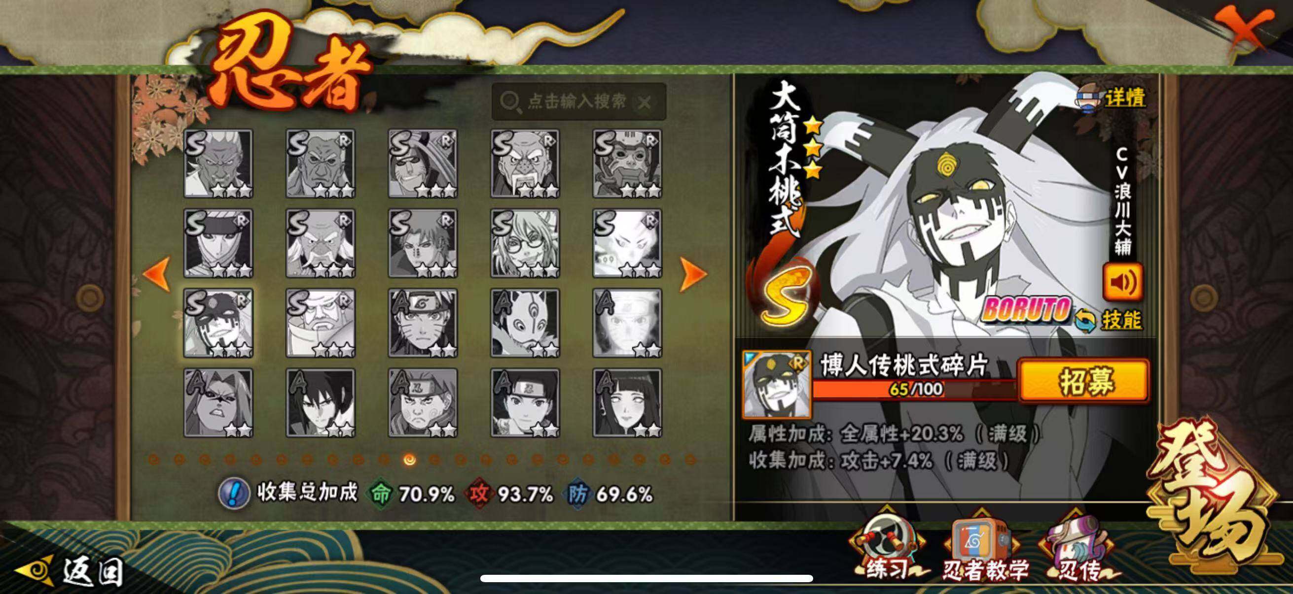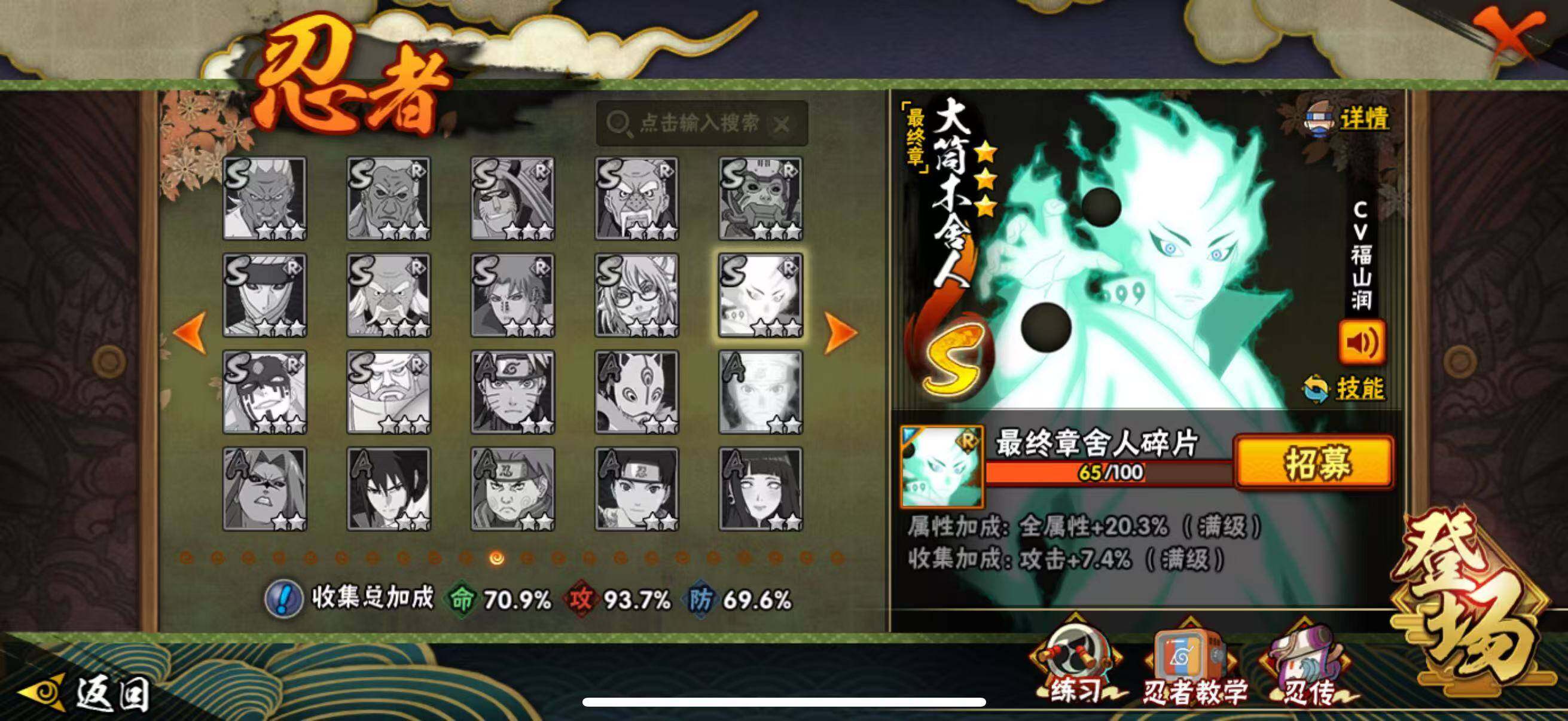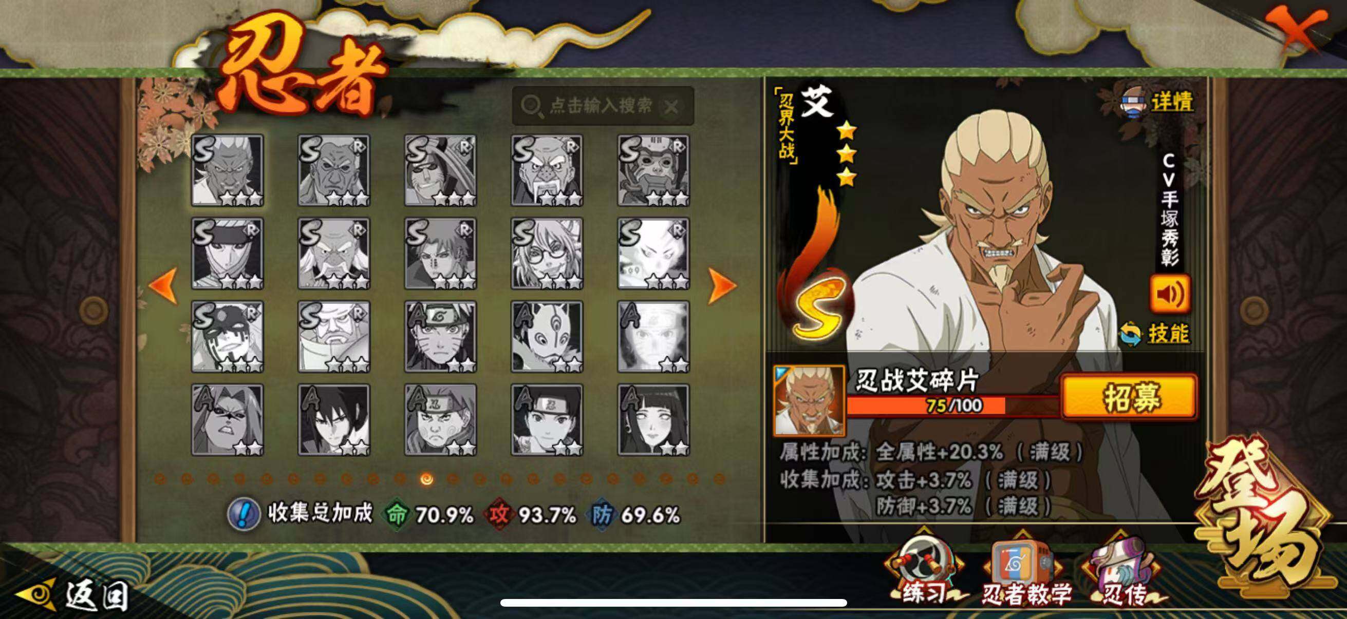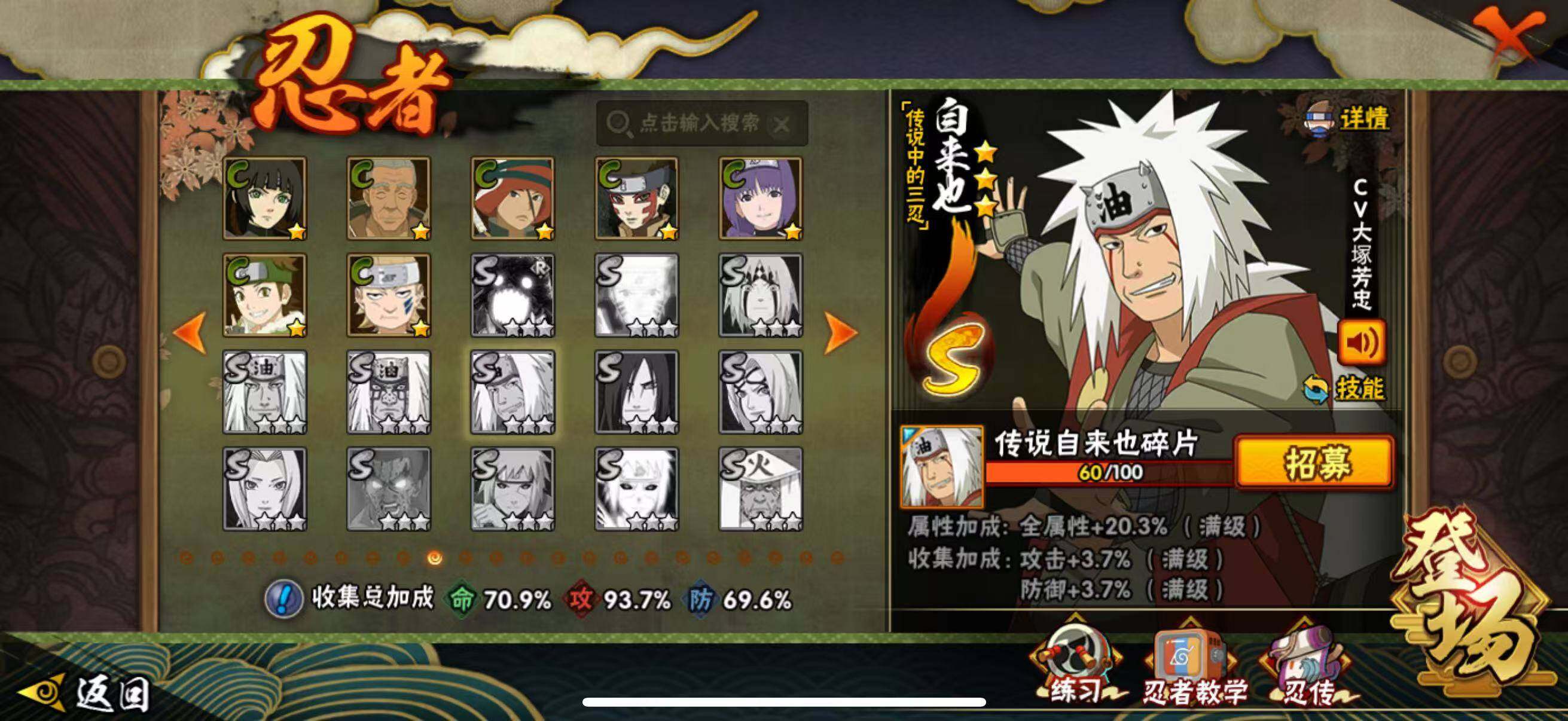 VIP等级V10/战力764W/S忍数量12/A忍数量36/忍
