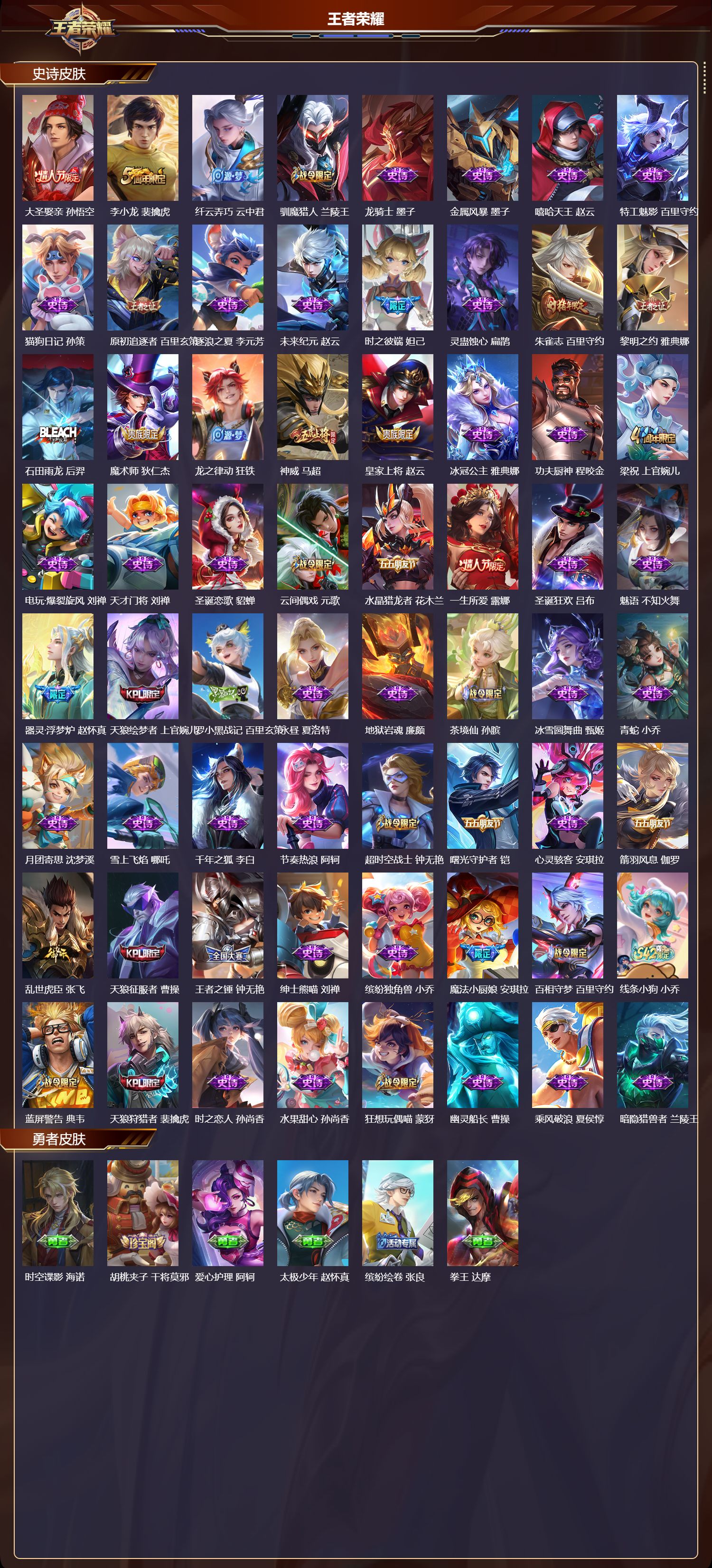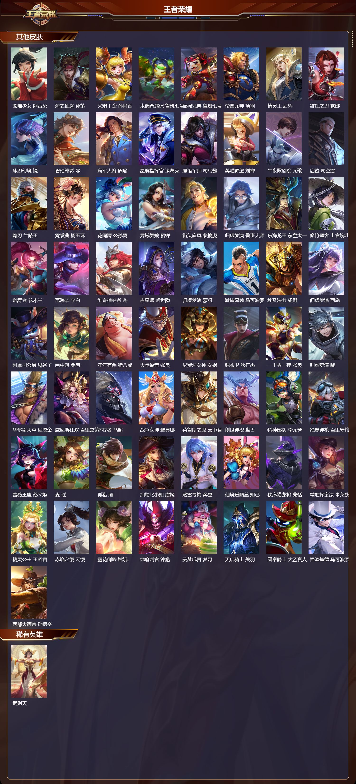 安卓QQ/永恒钻石/342皮肤/129英雄/6典藏/0珍品无双/1无双/1珍品传说/24传说/102史诗/9稀有英雄【1 珍品传说】怪盗基德 马可波罗,【6 典藏皮肤】全息碎影 孙悟空,天鹅之梦 小乔,倪克斯神谕 武则天,弑枪猎影 韩信,无限飓风号 夏侯惇,大秦宣太后 芈月,【1 无双皮肤】器灵·螭龙剑 曜,【24 传说皮肤】武圣 关羽,启明星使 虞姬,云霓雀翎 虞姬,白虎志 百里玄策,云鹰飞将