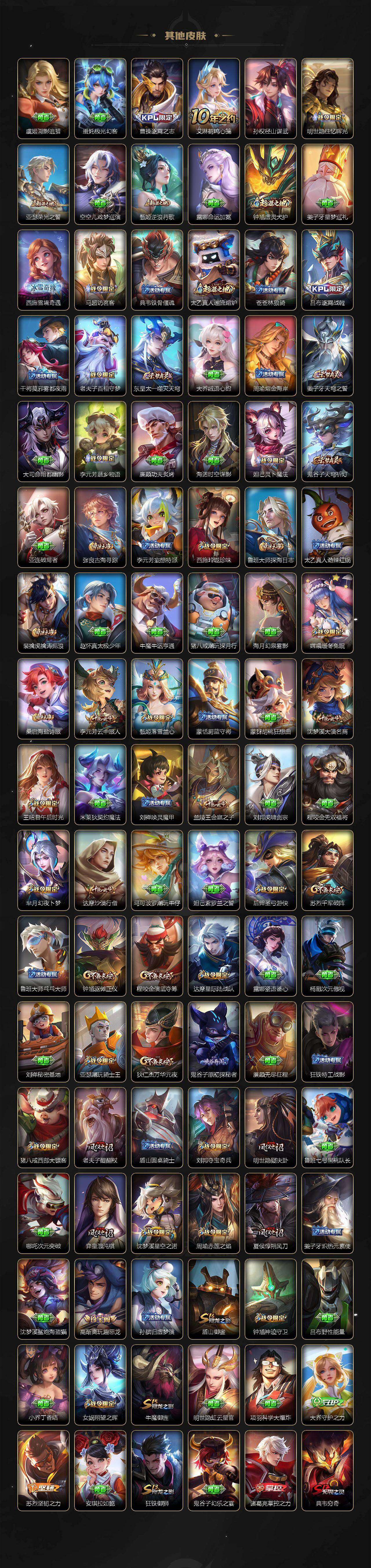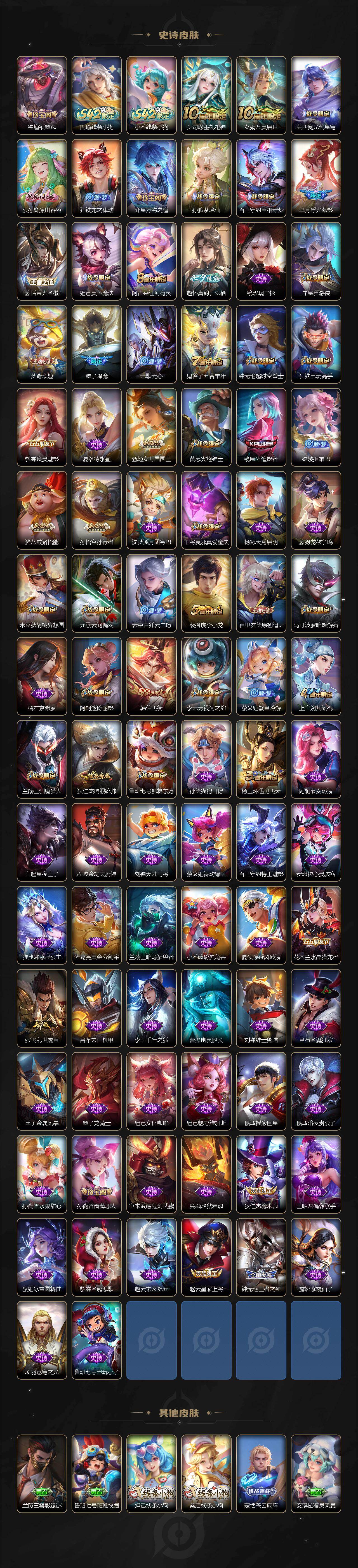 【传说皮肤】:后羿神树通天,嬴政玄雷天君,桑启鸣野蒿,干将莫邪画中仙,花木兰燃星之曲,虞姬无限倾心,项羽无限倾心,伽罗炽翼辉光,孙悟空齐天大圣,吕布怒海麟威,