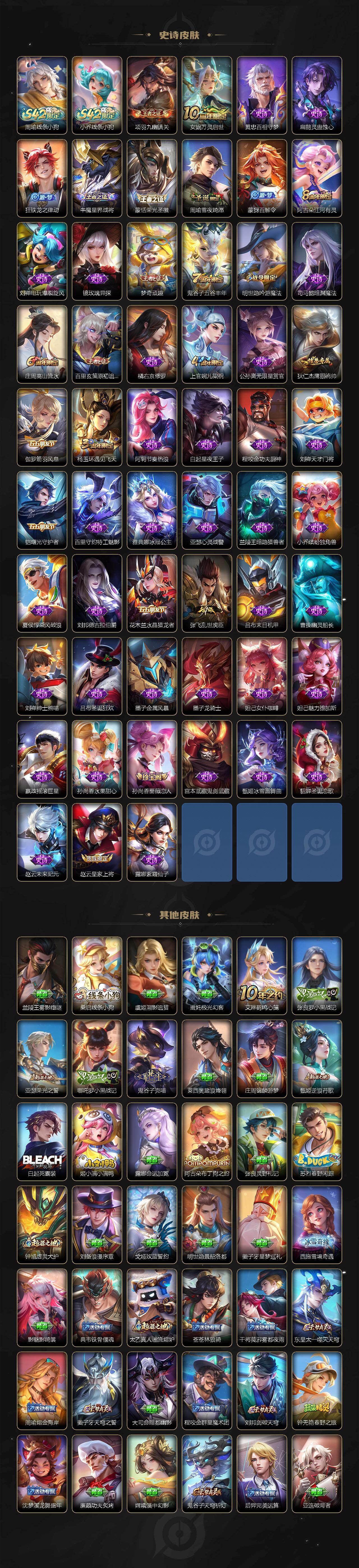 【传说皮肤】:马超神骥逐星野,云缨幻光神枪,桑启鸣野蒿,澜逐花归海,曜山海苍雷引,铠绛天战甲,干将莫邪久胜战神,花木兰冠军飞将,梦奇胖达荣荣,宫本武藏地狱之眼