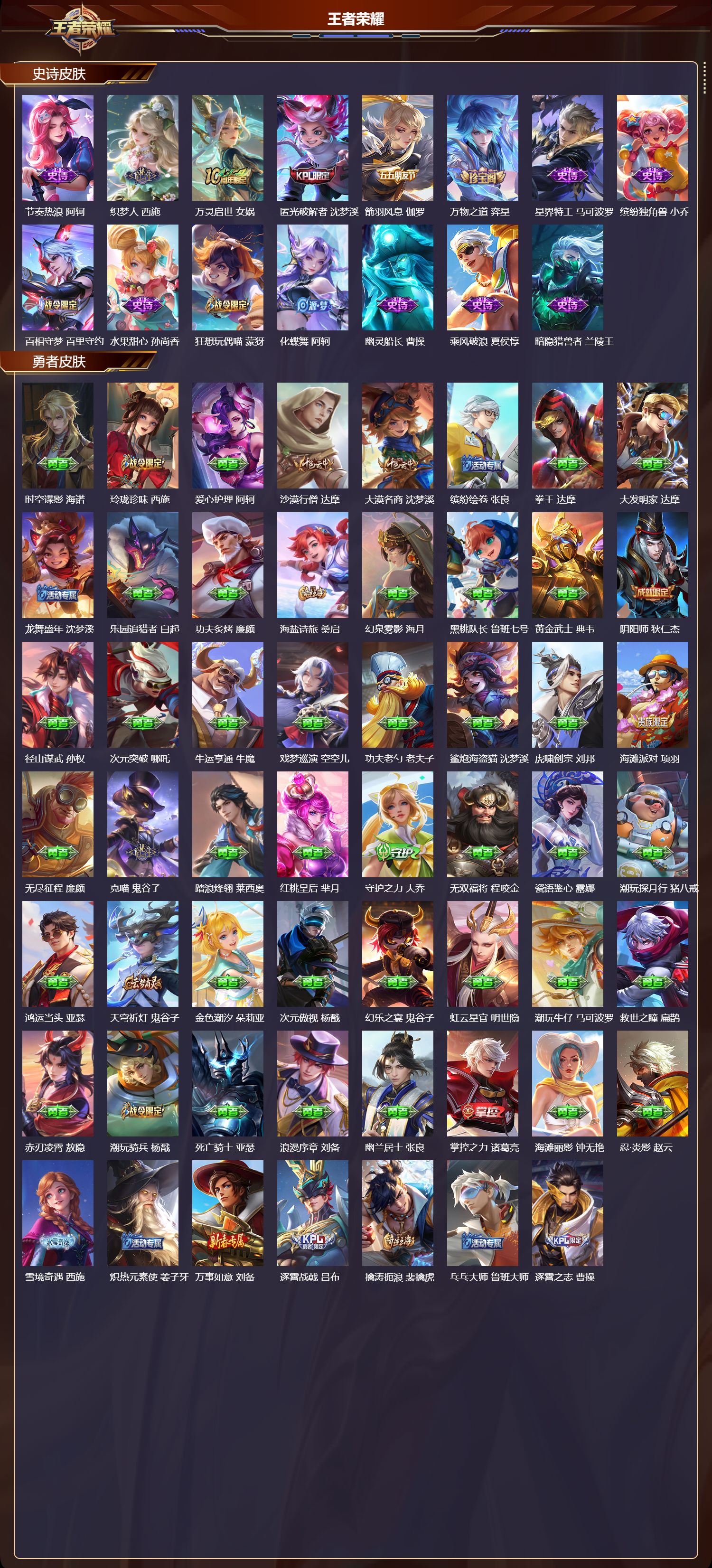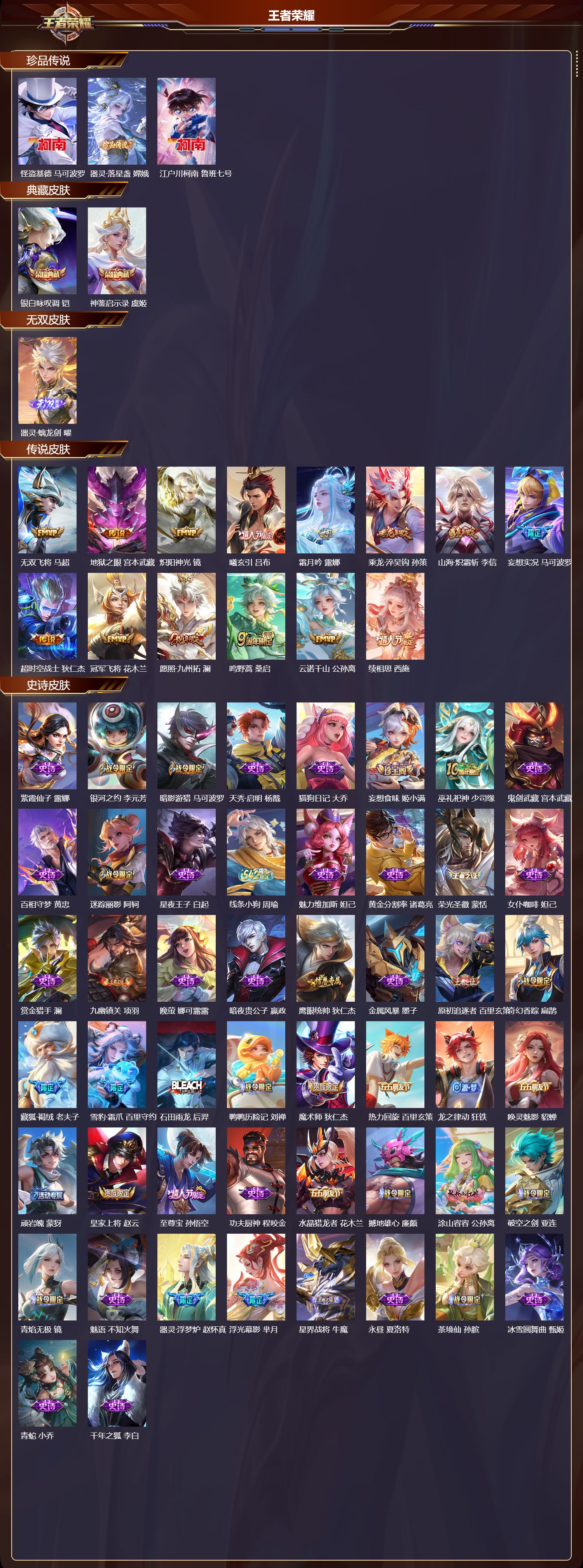 安卓QQ/永恒钻石/232皮肤/129英雄/2典藏/0珍品无双/1无双/3珍品传说/14传说/65史诗/9稀有英雄【3 珍品传说】怪盗基德 马可波罗,器灵·落星盏 嫦娥,江户川柯南 鲁班七号,【2 典藏皮肤】银白咏叹调 铠,神鉴启示录 虞姬,【1 无双皮肤】器灵·螭龙剑 曜,【14 传说皮肤】无双飞将 马超,地狱之眼 宫本武藏,炽阳神光 镜,曦玄引 吕布,霜月吟 露娜,乘龙·淬吴钩 孙策,山海·炽