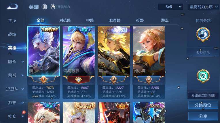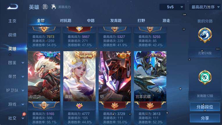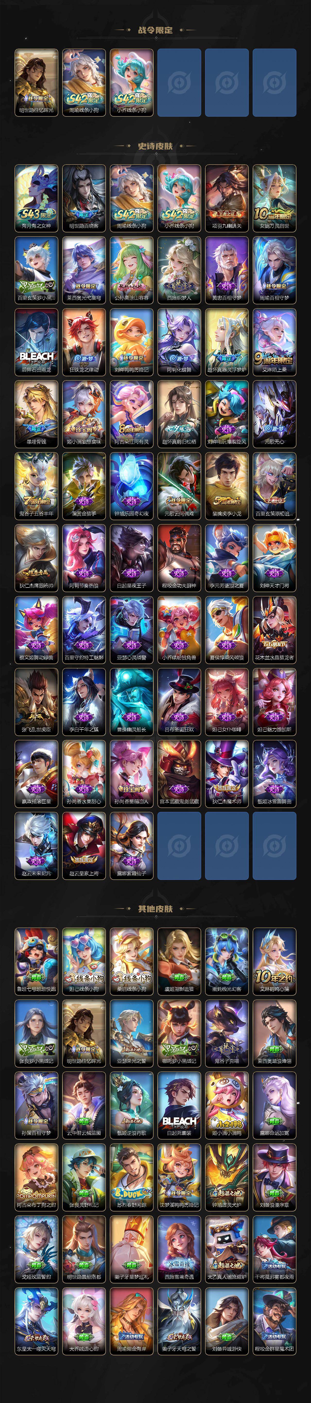 贵族等级7/荣耀典藏数量1/传说皮肤数量15/史诗皮肤数量55/皮肤数量179/英雄数量129/段位永恒钻石/敖隐全皮/澜全皮/赵怀真全皮/神鉴启示录 虞姬/器灵·螭龙剑 曜/伽罗沧流箭/云缨神骥越千峰/神树通天 后羿/九山相柳 司马懿/愿照·九州拓 澜/幻光神枪 云缨/鸣野蒿 桑启/逐花归海 澜/妄想实况 马可波罗/电玩·雷克斯 澜/齐天大圣 孙悟空/绛天战甲 铠/久胜战神 干将莫邪/胖达荣