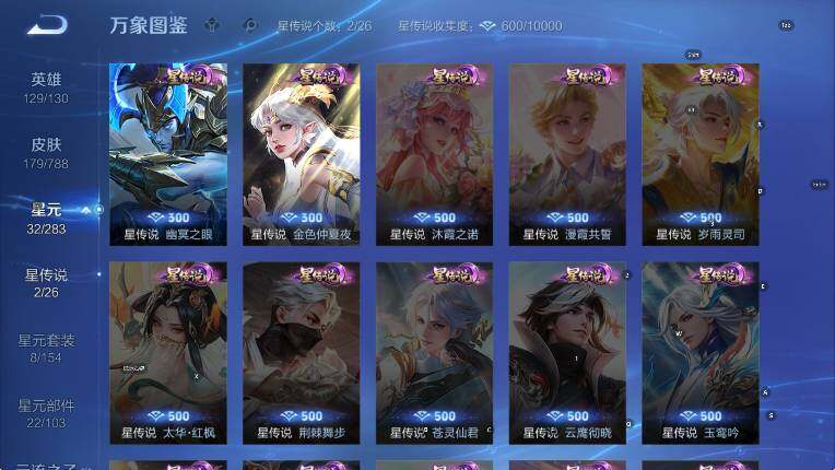 贵族等级7/荣耀典藏数量1/传说皮肤数量15/史诗皮肤数量55/皮肤数量179/