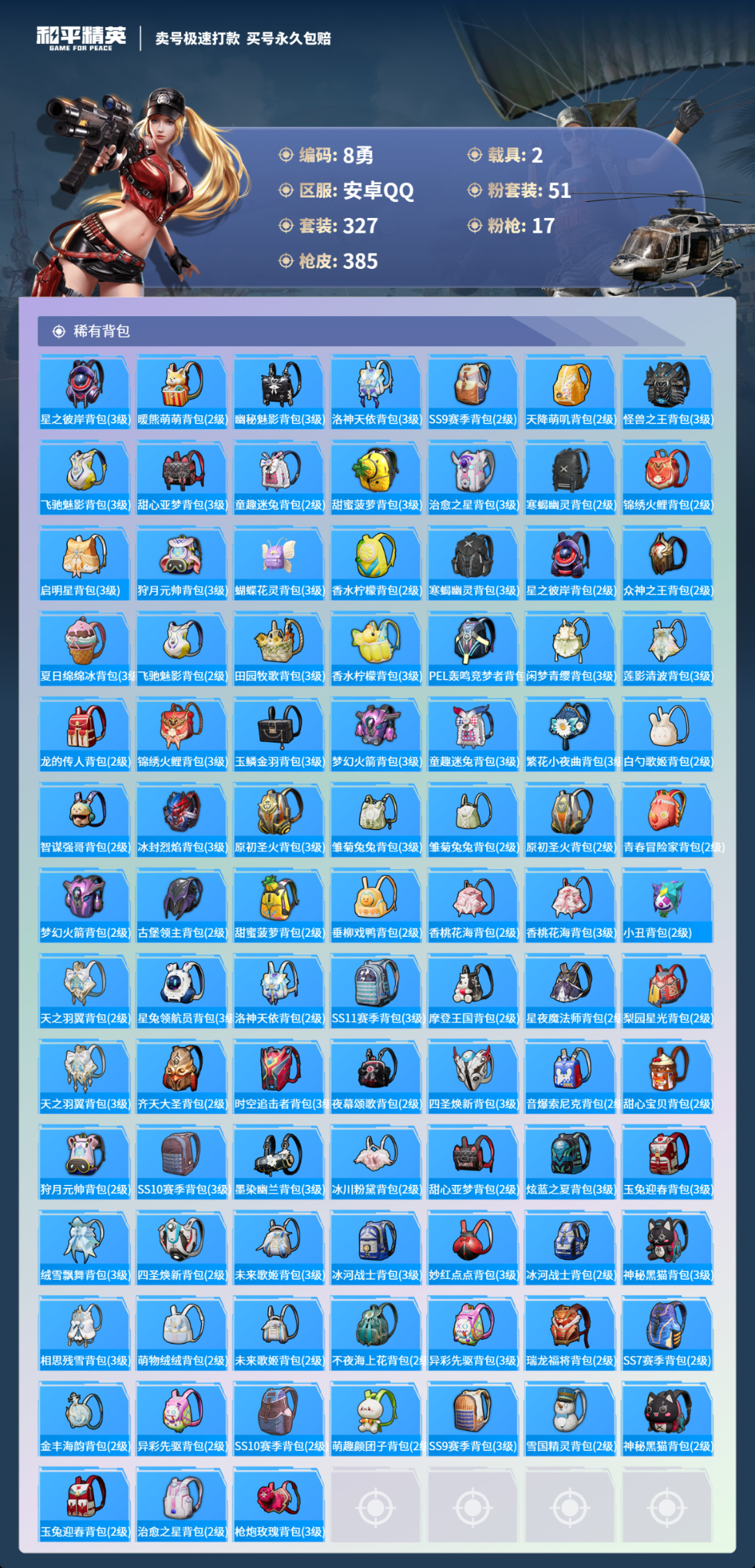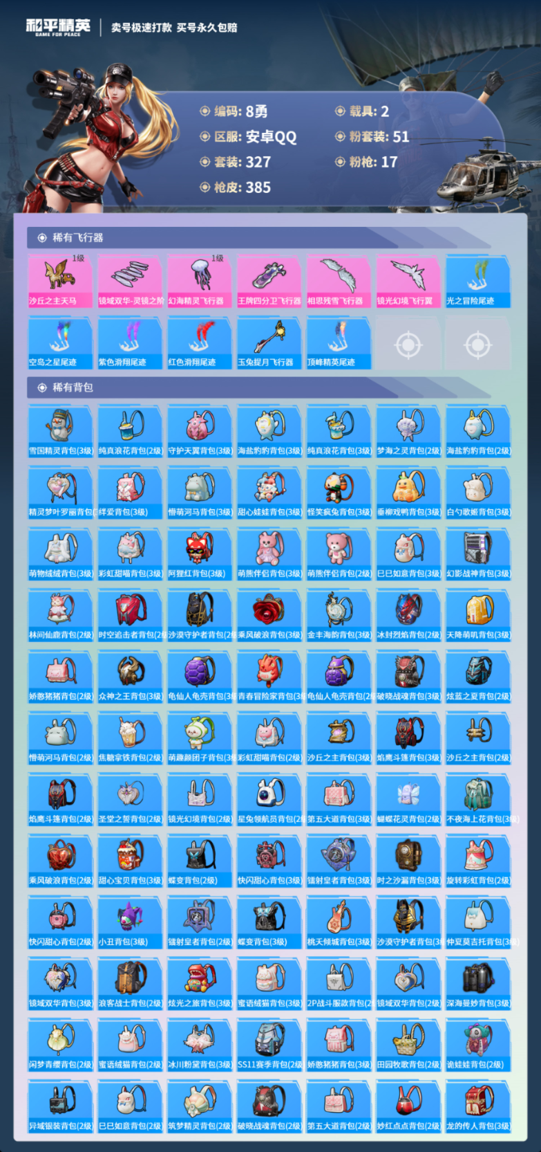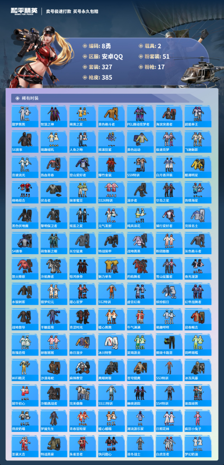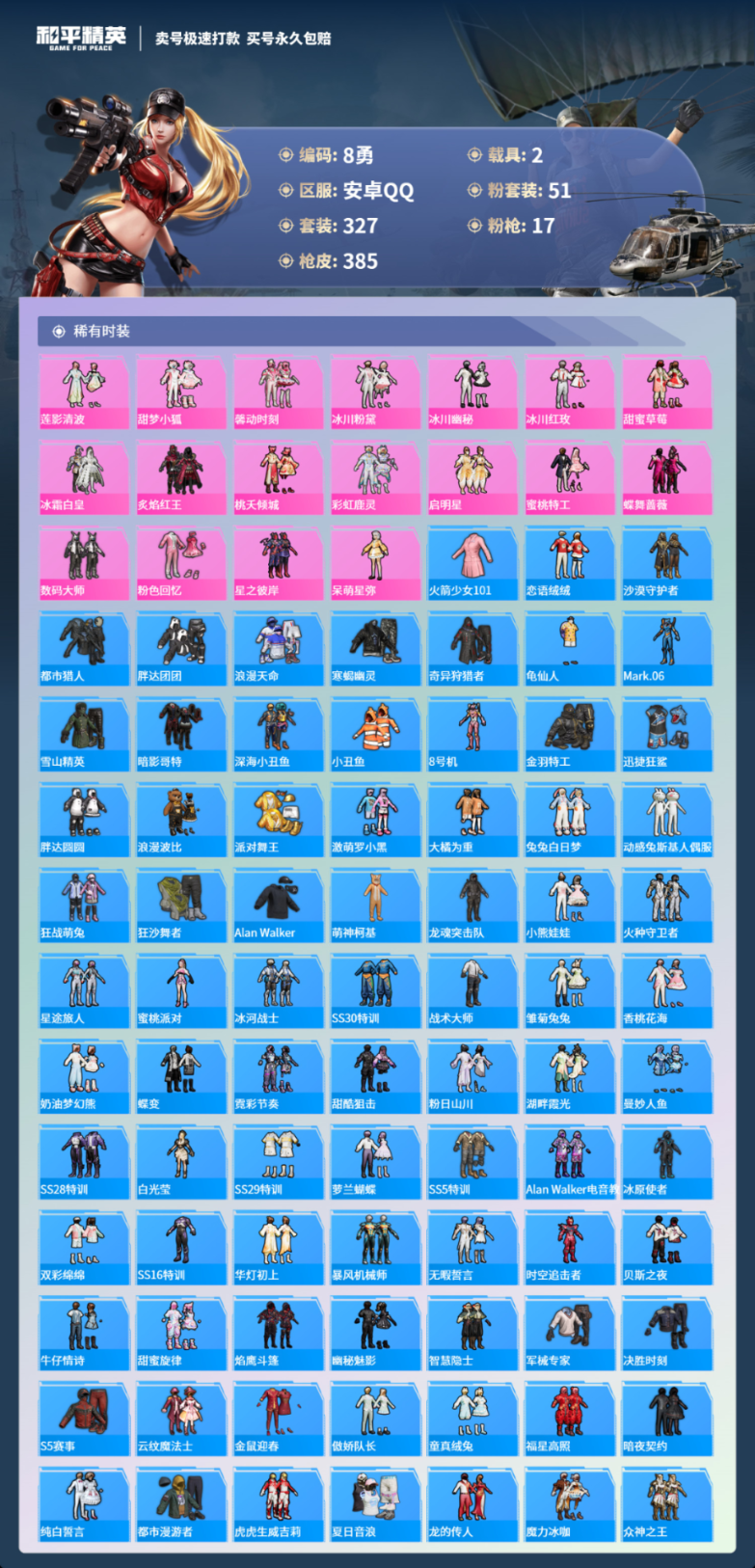 2载具327套装-385枪皮-安卓手Q-24王牌印记-51粉装-17特效枪-2载具-热力值-327套装-385枪皮-3卓越印记-2传奇印记