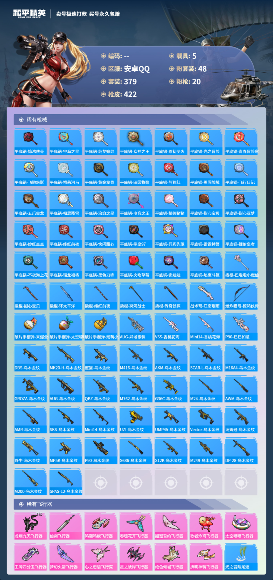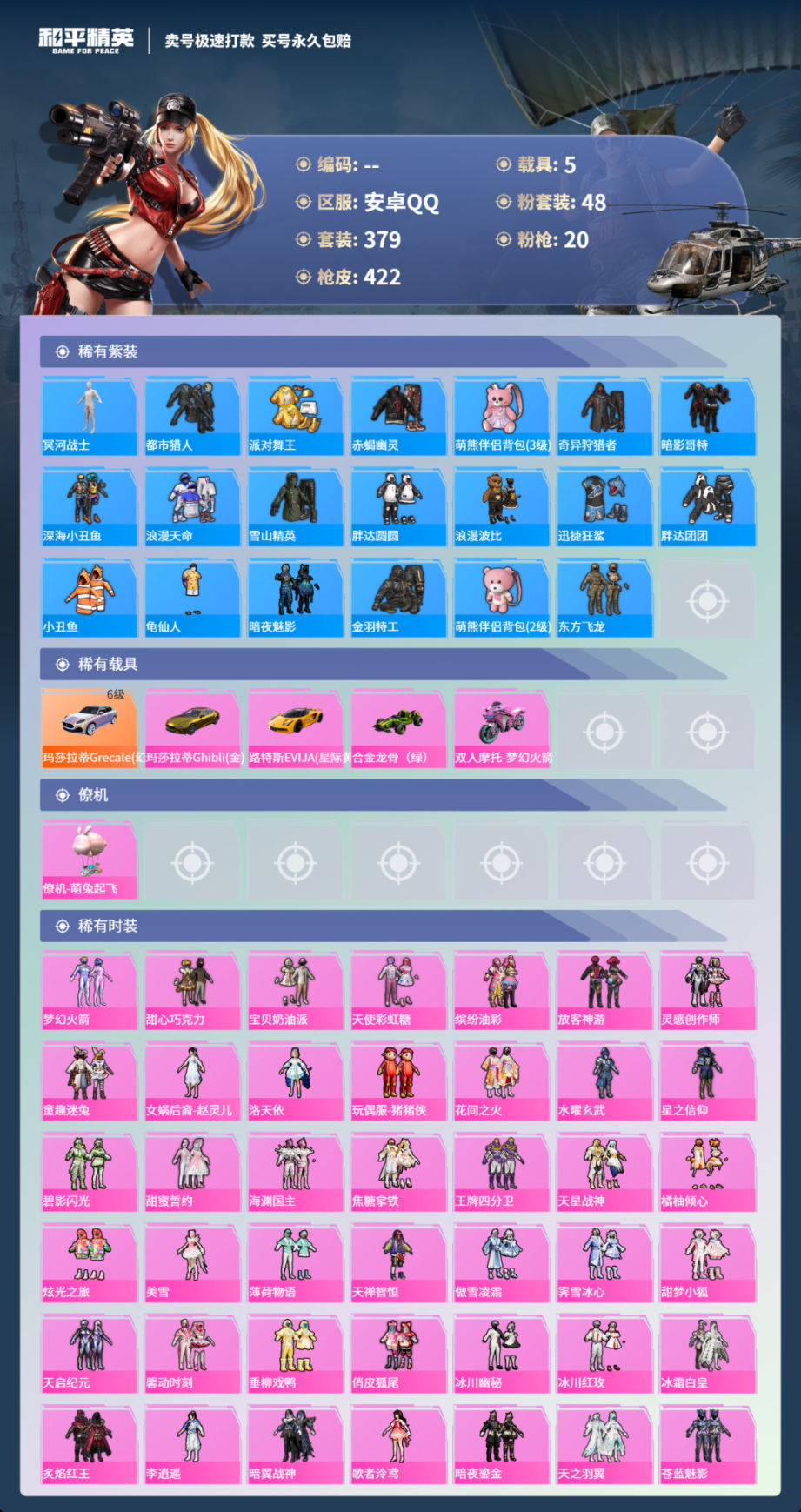 5载具379套装-422枪皮-安卓手Q-19王牌印记-有战神框-48粉装-20特效枪-5载具-热力值-379套装-422枪皮-6卓越印记-5传奇印记