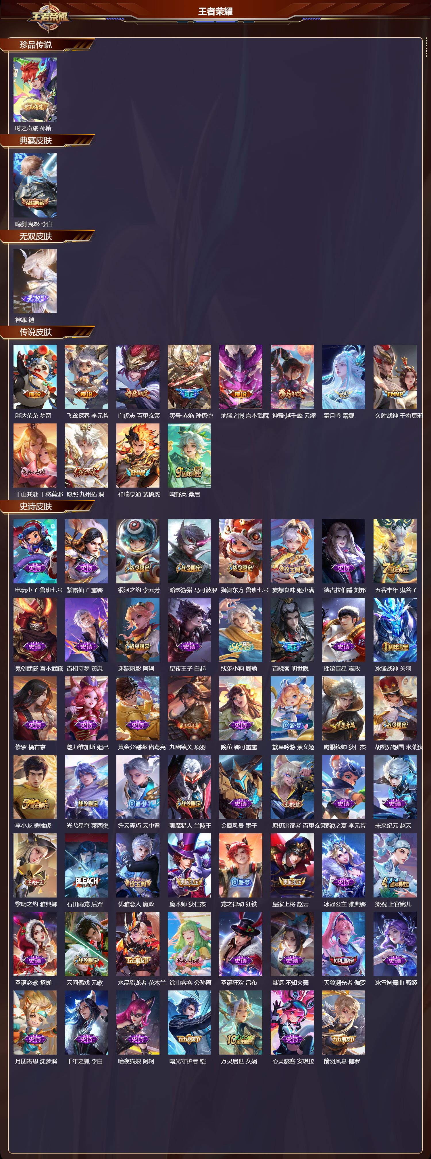 安卓QQ/至尊星耀/235皮肤/128英雄/1典藏/0珍品无双/1无双/1珍品传说/12传说/65史诗/8稀有英雄【1 珍品传说】时之奇旅 孙策,【1 典藏皮肤】鸣剑·曳影 李白,【1 无双皮肤】神罪 铠,【12 传说皮肤】胖达荣荣 梦奇,飞鸢探春 李元芳,白虎志 百里玄策,零号·赤焰 孙悟空,地狱之眼 宫本武藏,神骥·越千峰 云缨,霜月吟 露娜,久胜战神 干将莫邪,千山共赴 干将莫邪,愿照·九州
