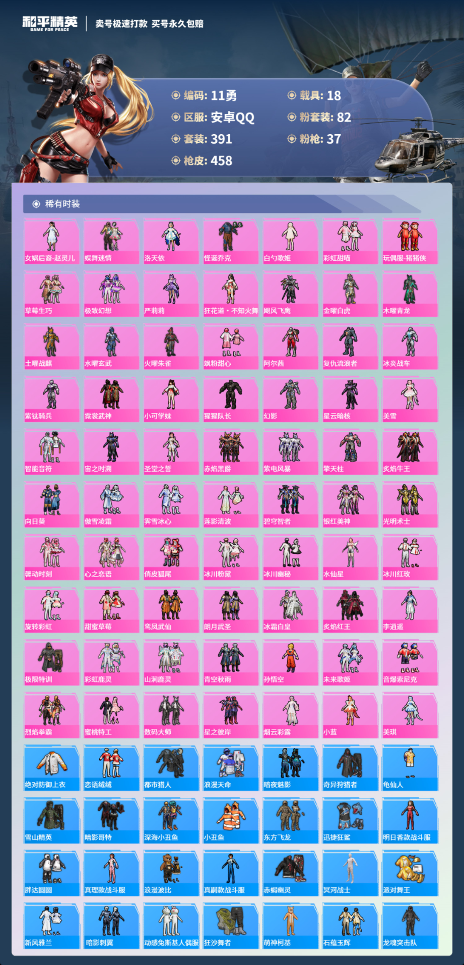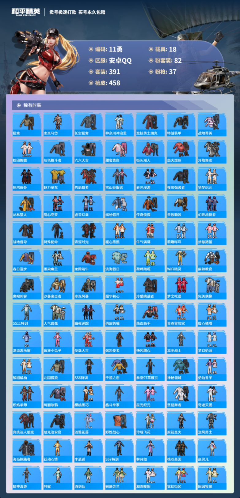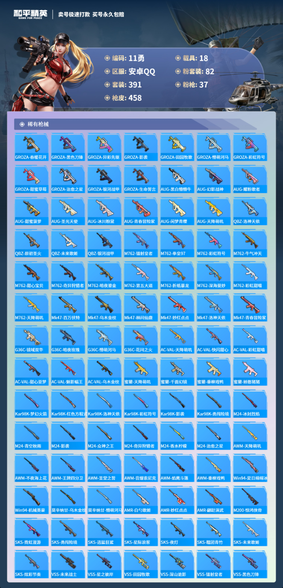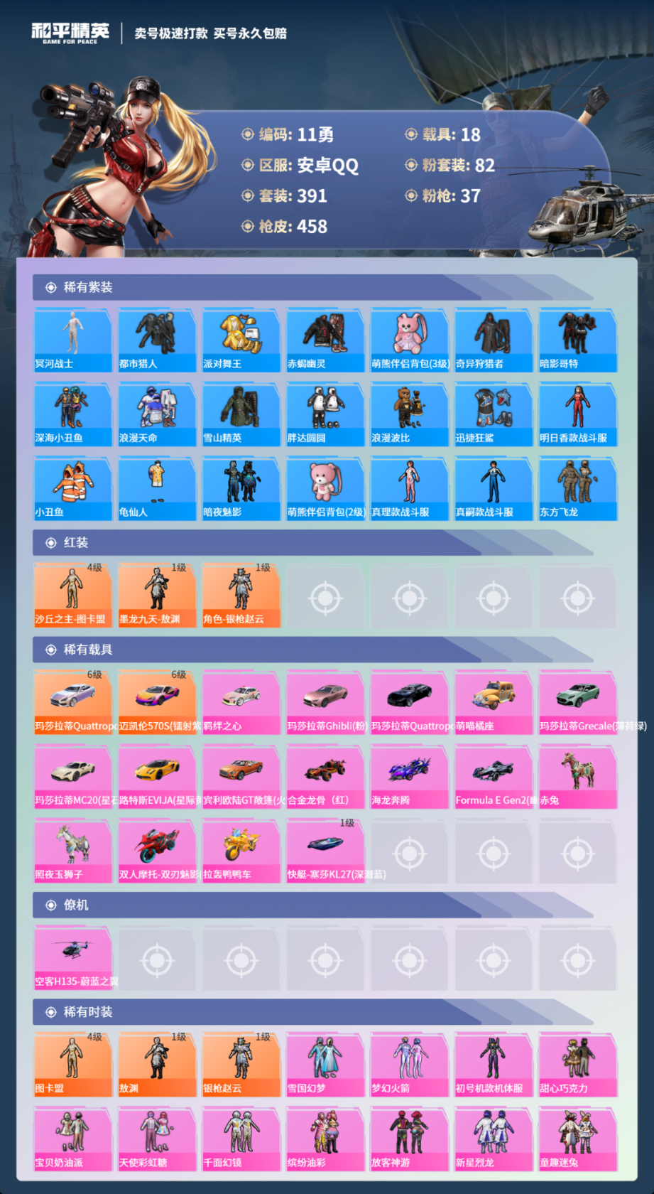 18载具391套装-458枪皮-安卓手Q-19王牌印记-有战神框-82粉装-37特效枪-18载具-热力值-391套装-458枪皮-4卓越印记-2传奇印记