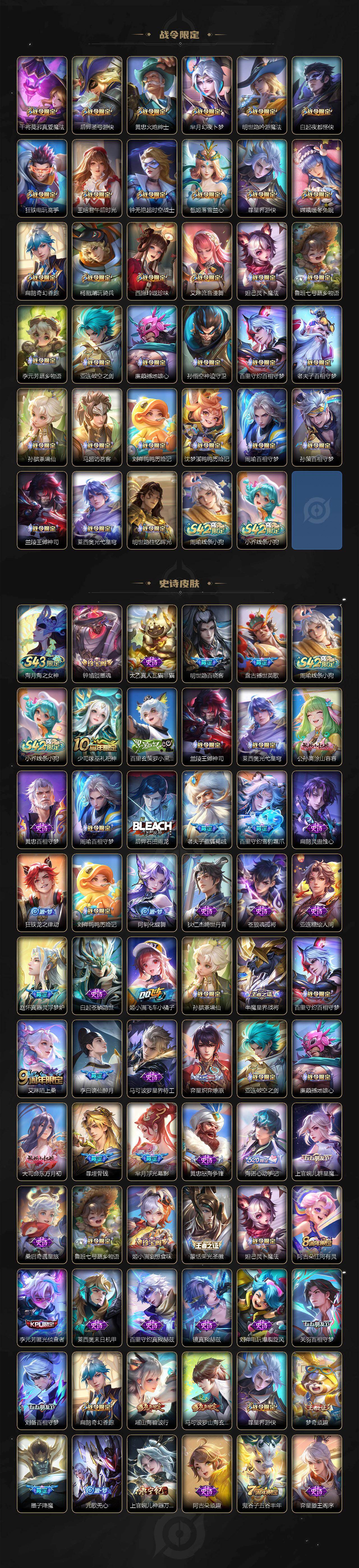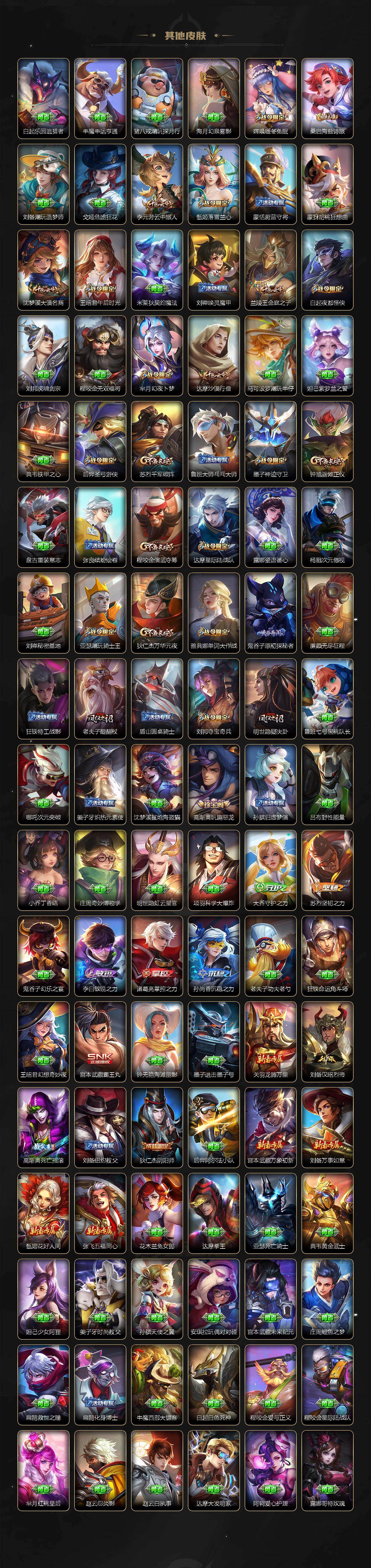 【英雄全皮】:廉颇全皮,刘禅全皮,马可波罗全皮,刘邦全皮,孙权全皮,苍全皮,鬼谷子全皮,黄忠全皮,苏烈全皮,百里守约全皮,云中君全皮,大司命全皮,敖隐全皮,曜全皮,蒙恬全皮,阿古朵全皮,桑启全皮,夏洛特全皮,莱西奥全皮,空空儿全皮,影全皮