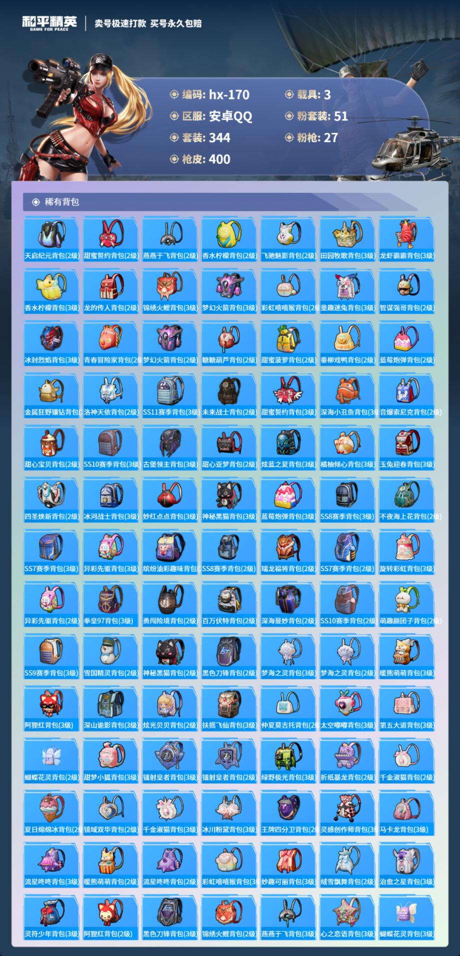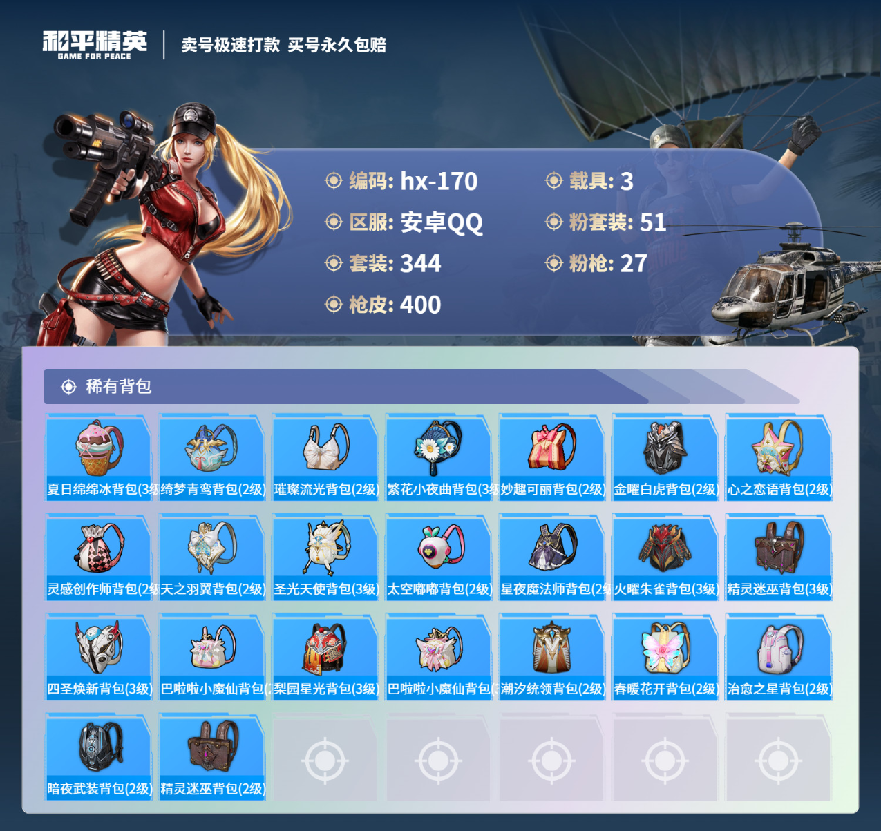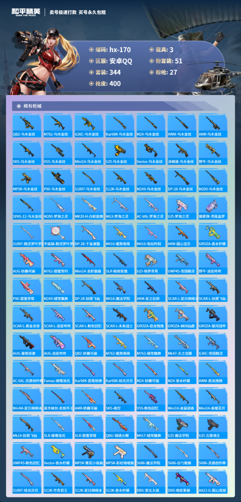 3载具344套装-400枪皮-安卓手Q-27王牌印记-有战神框-51粉装-27特效枪-3载具-热力值-344套装-400枪皮-4卓越印记-1传奇印记