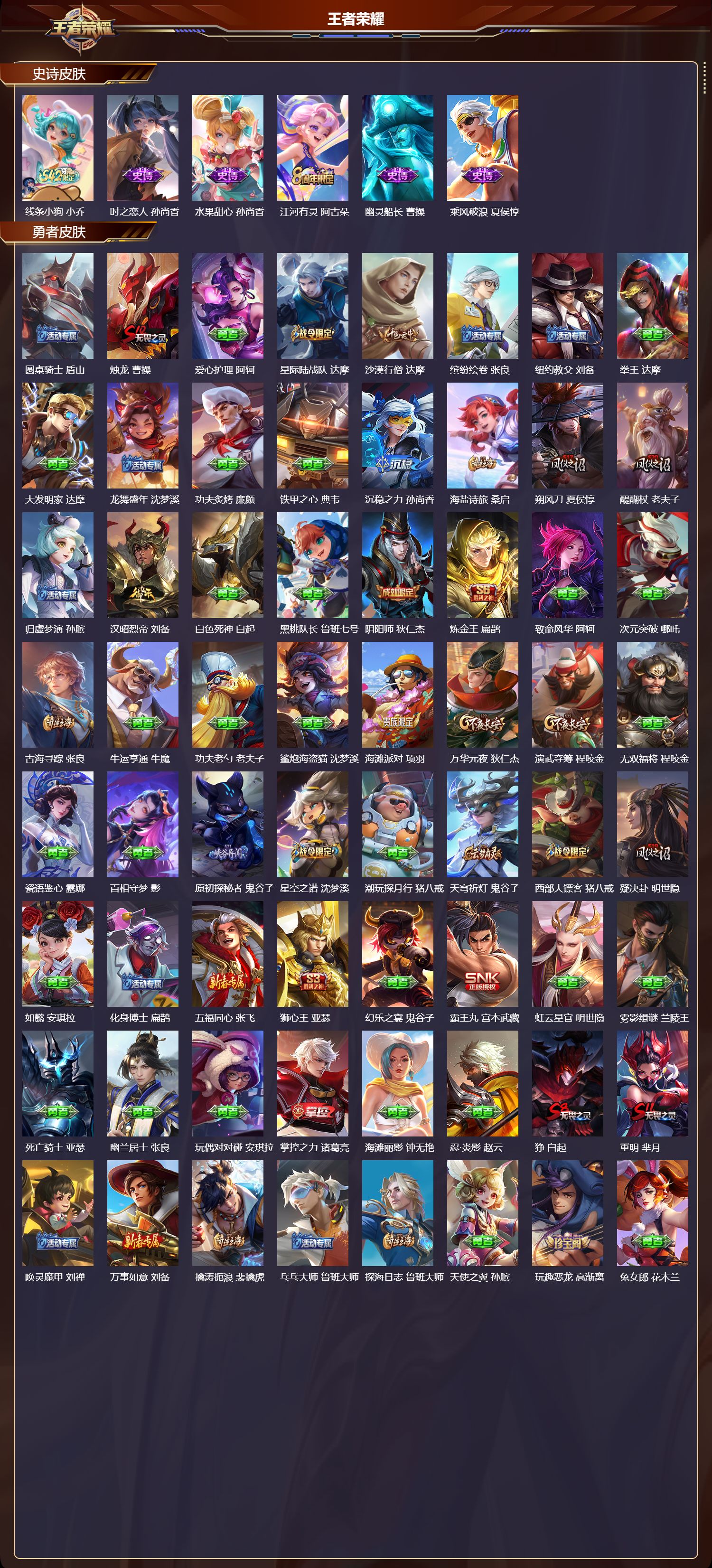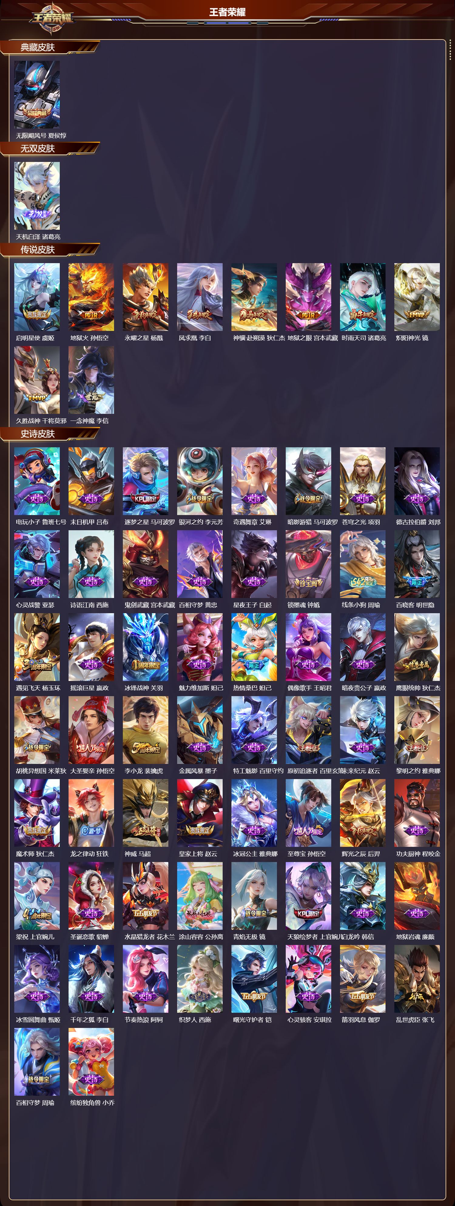 苹果QQ/永恒钻石/220皮肤/128英雄/1典藏/0珍品无双/1无双/0珍品传说/10传说/64史诗/8稀有英雄【1 典藏皮肤】无限飓风号 夏侯惇,【1 无双皮肤】天机白泽 诸葛亮,【10 传说皮肤】启明星使 虞姬,地狱火 孙悟空,永曜之星 杨戬,凤求凰 李白,神骥·赴朔漠 狄仁杰,地狱之眼 宫本武藏,时雨天司 诸葛亮,炽阳神光 镜,久胜战神 干将莫邪,一念神魔 李信,【64 史诗皮肤】电玩小子