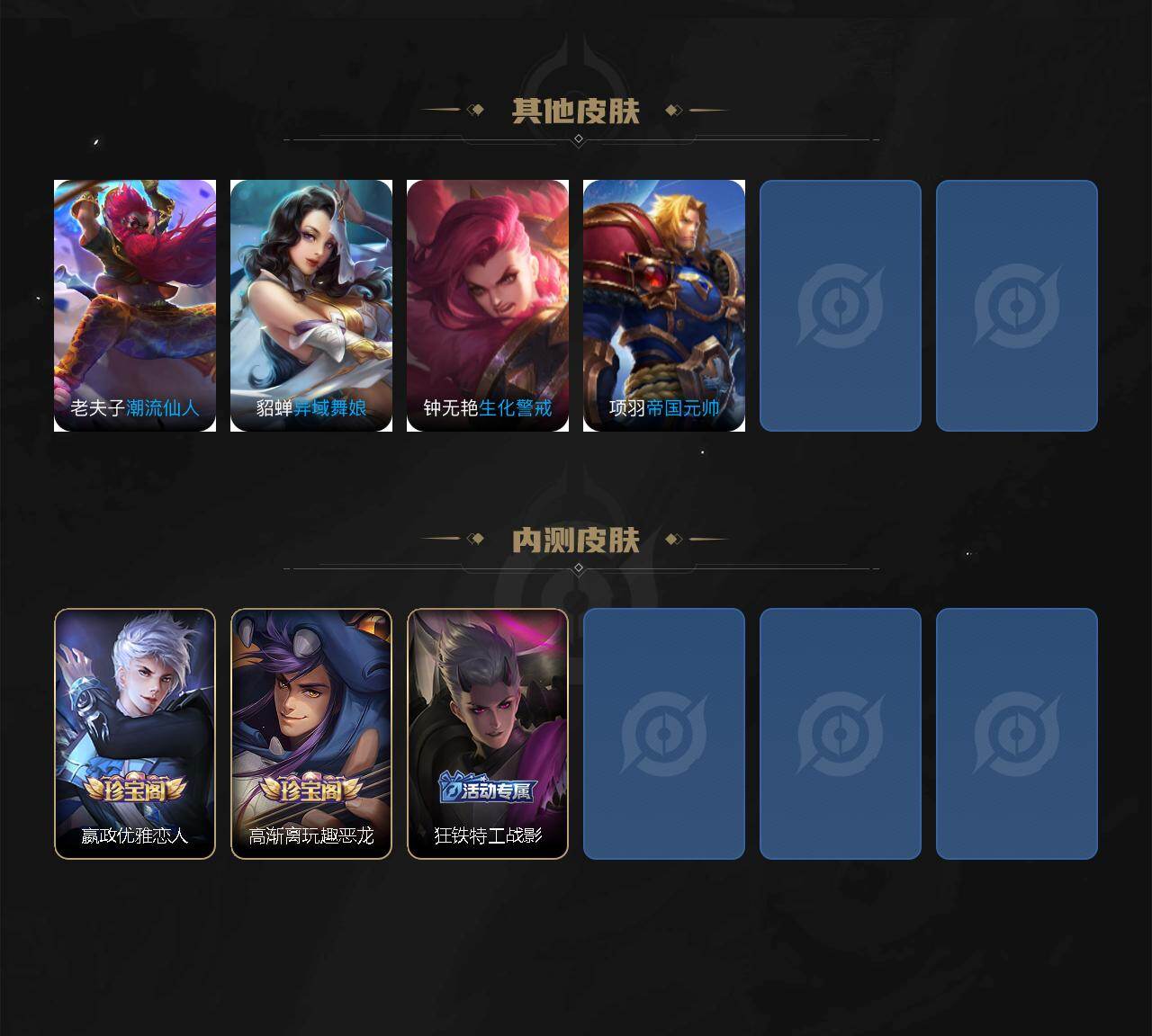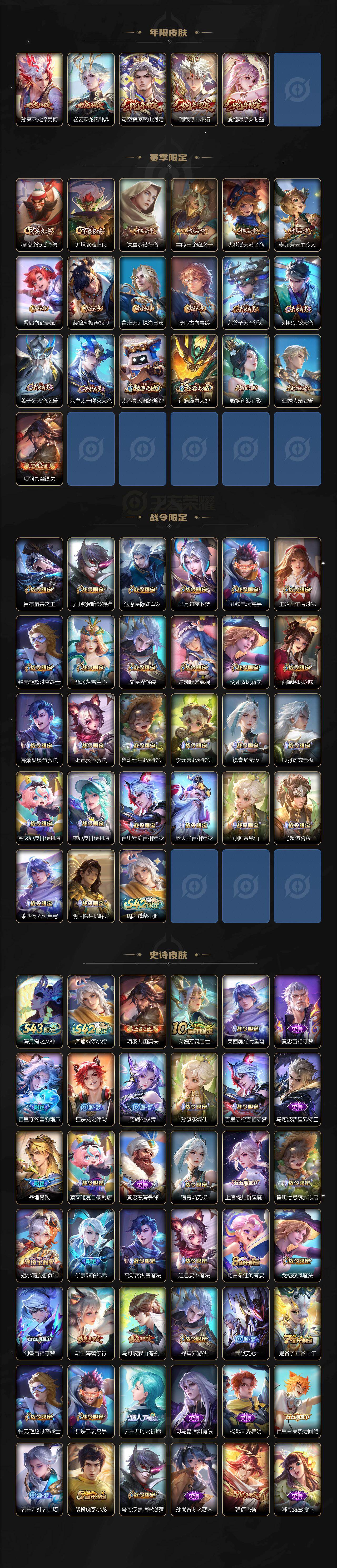 【限定皮肤】:暃埋骨钱,蔡文姬夏日便利店,虞姬夏日便利店,姜子牙天穹之誓,狄仁杰阴阳师,小乔山海琳琅生,赵云皇家上将,