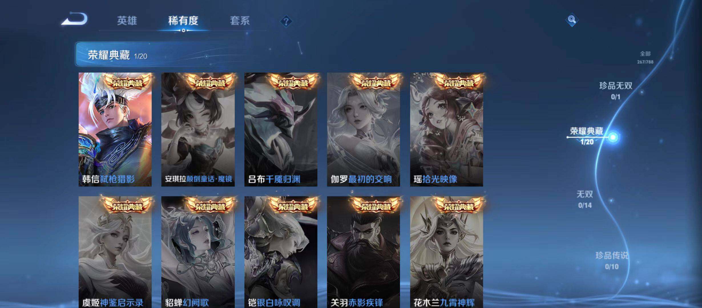 267皮肤1典藏18传说/弑枪猎影/马超琥珀纪元/山海苍雷引/山海炽霜斩/愿照山河定/愿照九州拓/愿照岁时盈/云中君群星魔术团/乘龙淬吴钩/乘龙铭钟鼎/齐天大圣/山海琳琅生/炽阳神光/一念神魔/刘备时之恋人/黄金狮子座/地狱之眼/幻光神枪/鸣野蒿