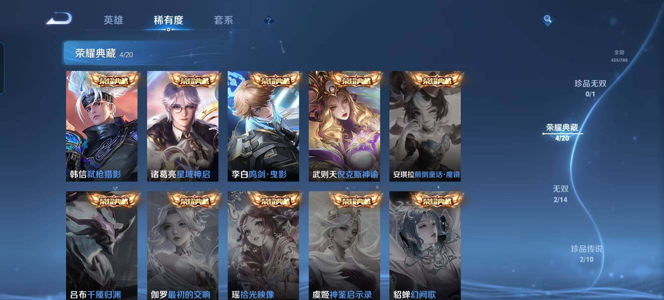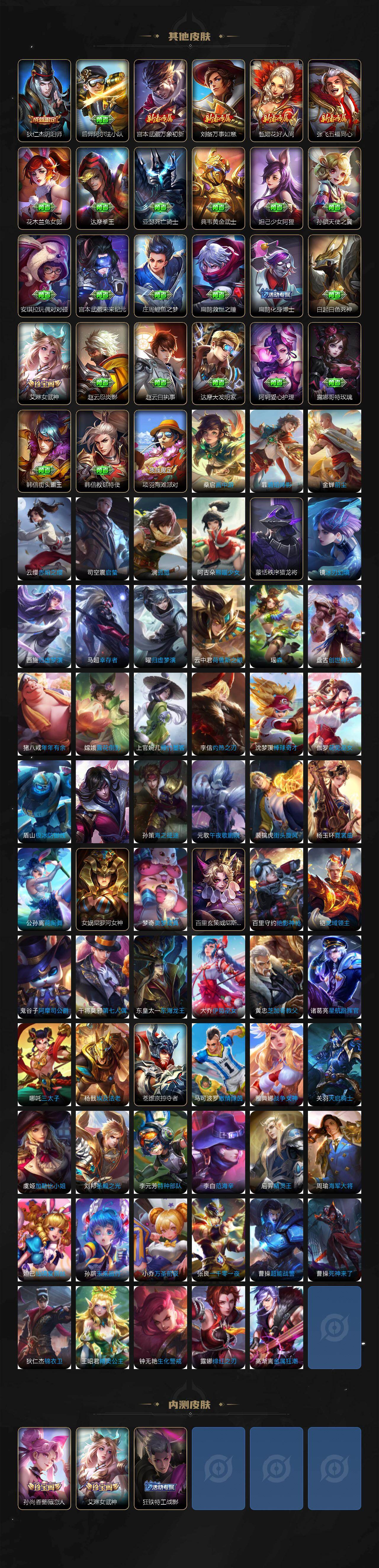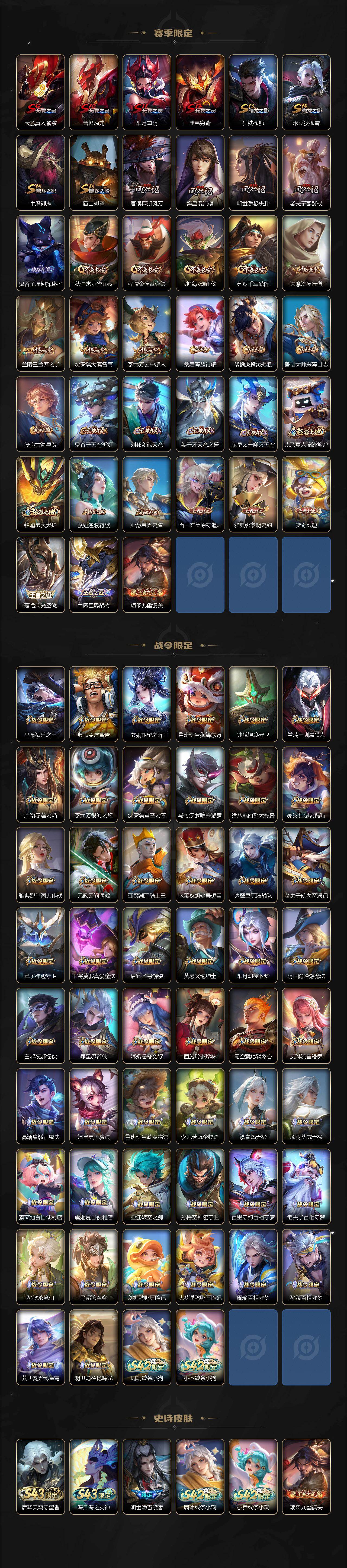全能大师/诸葛亮满皮/金标万战狄仁杰/金标万战元流之子/万战女娲/万战杨玉环/万战嫦娥/万战敖隐/金标曹操/金标云缨/金标武则天/435皮肤5典藏2无双2珍品传说31传说/武则天+幻海之心/倪克斯神谕/鸣剑曳影/星域神启/弑枪猎影