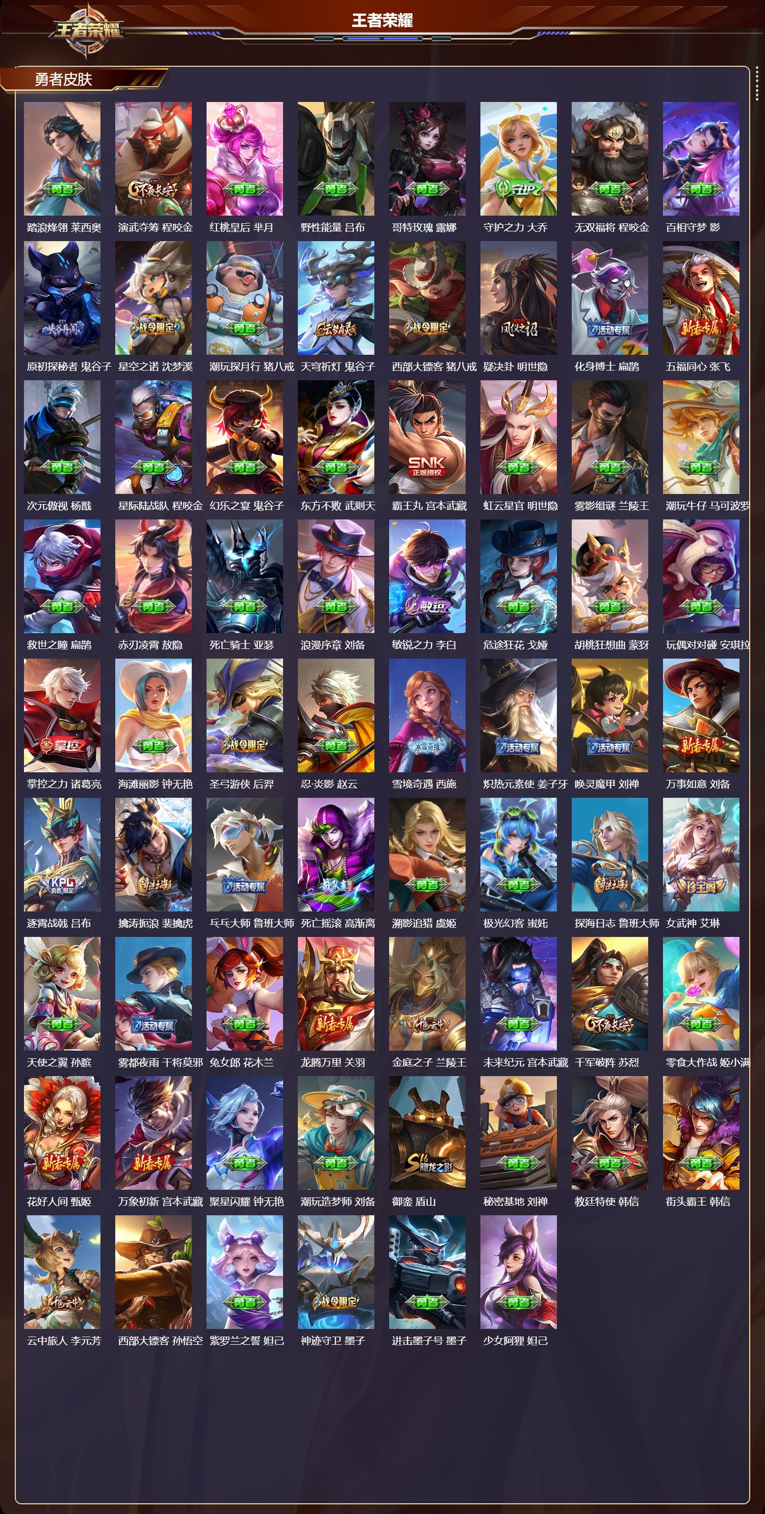 安卓QQ/至尊星耀/290皮肤/129英雄/1典藏/0珍品无双/0无双/1珍品传说/13传说/87史诗/9稀有英雄【1 珍品传说】怪盗基德 马可波罗,【1 典藏皮肤】最初的交响 伽罗,【13 传说皮肤】零号·赤焰 孙悟空,遇见胡旋 貂蝉,仲夏夜之梦 貂蝉,神骥·聚万邦 貂蝉,地狱之眼 宫本武藏,武陵仙君 诸葛亮,黄金射手座 后羿,久胜战神 干将莫邪,淬星耀世 赵云,绛天战甲 铠,冠军飞将 花木兰,