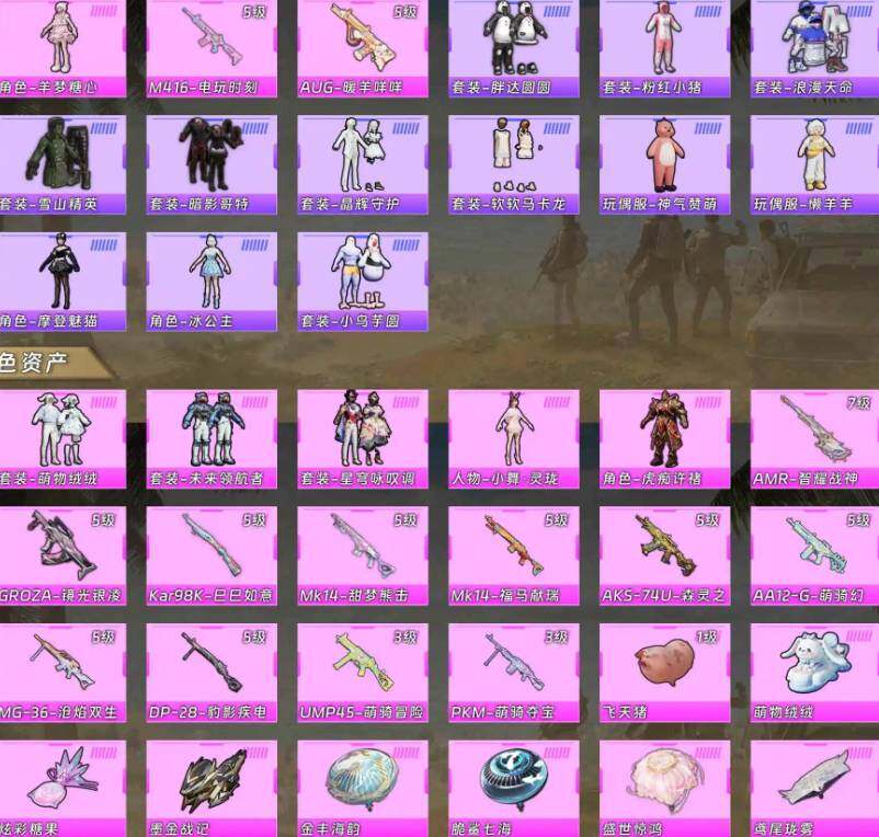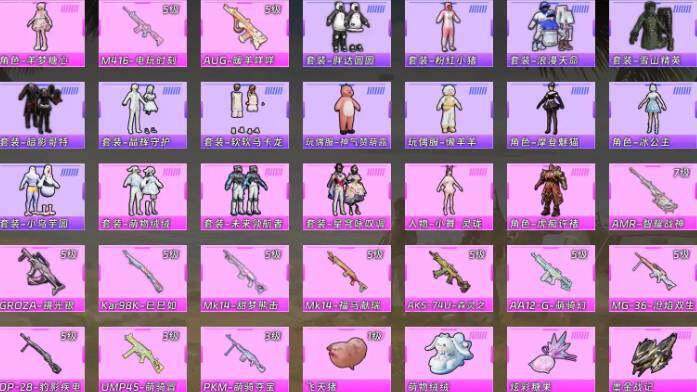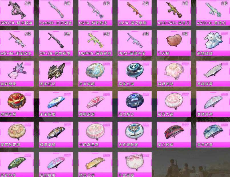 【粉色枪皮等级】:M416-电玩时刻(五级),GROZA-镜光银凌(五级),AUG-暖羊咩咩(五级),UMP45-萌骑冒险(三级),AKS-74U-森灵之息