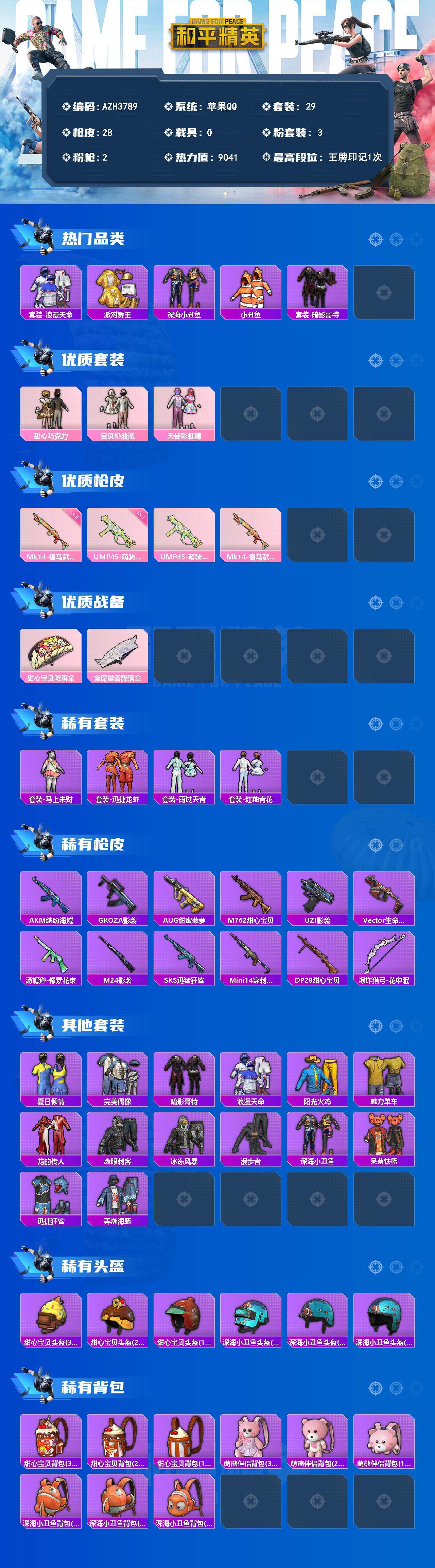 【AZH3789】苹果手Q【巧克力三姐妹金靴子暗影哥特 粉熊背包】3粉装-2特效枪-9041热力值-1王牌印记-29套装-28枪皮