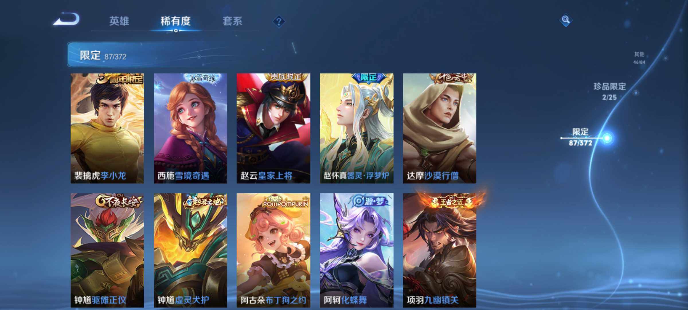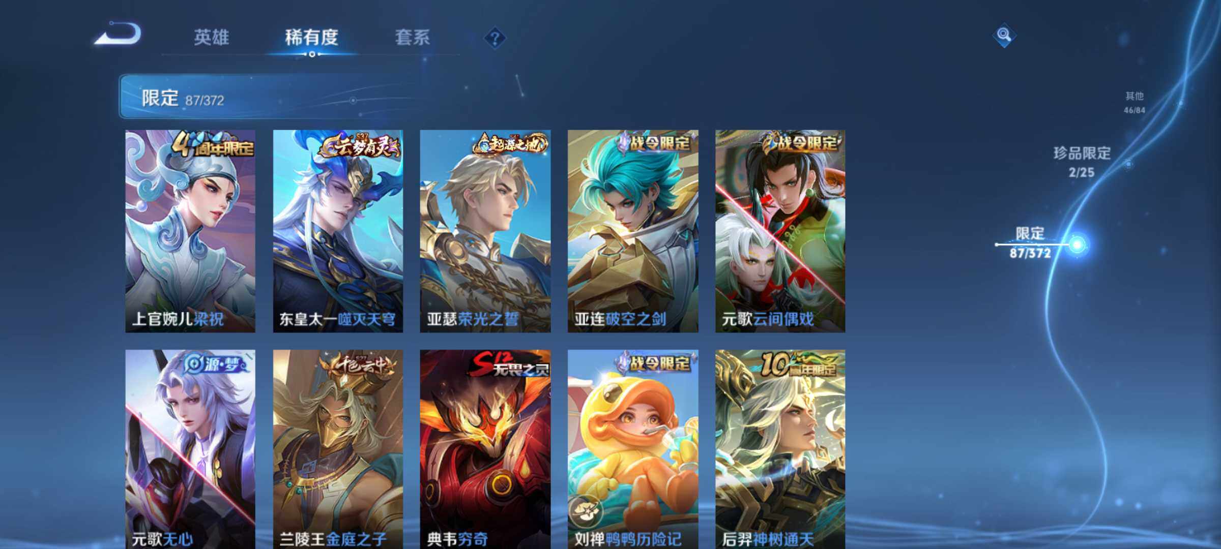 账号亮点:诸葛亮星域神启 曜器灵螭龙剑,韩信群星魔术团 马超神骥逐星野,后羿神树