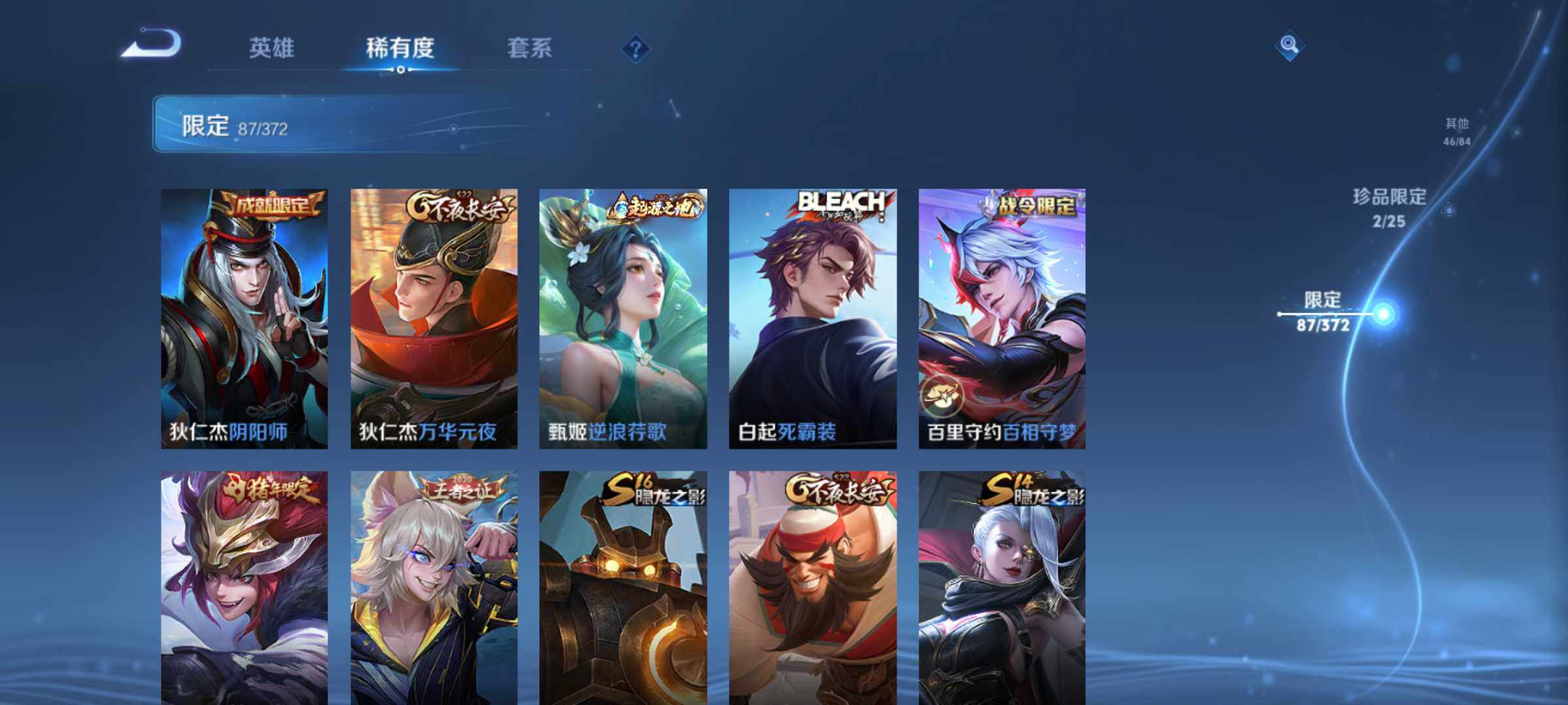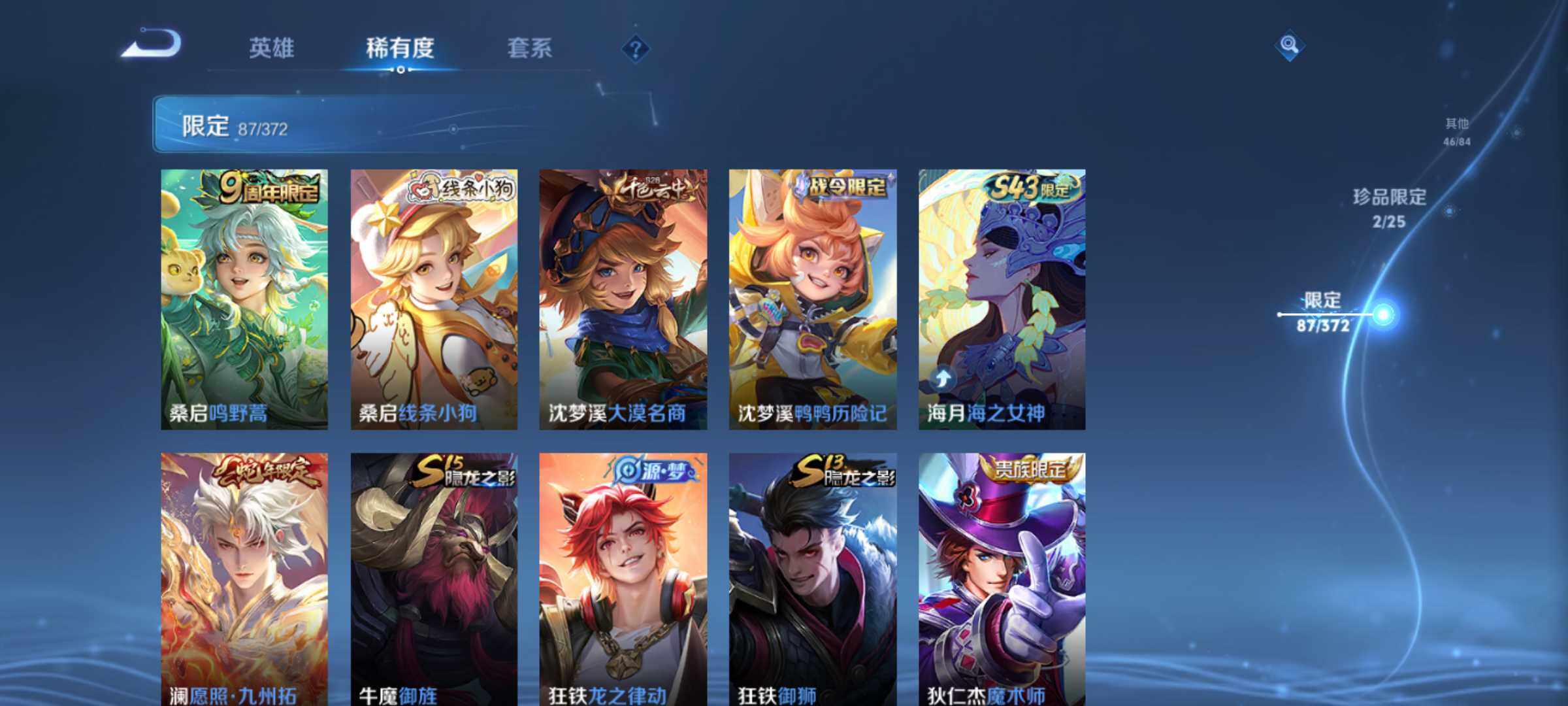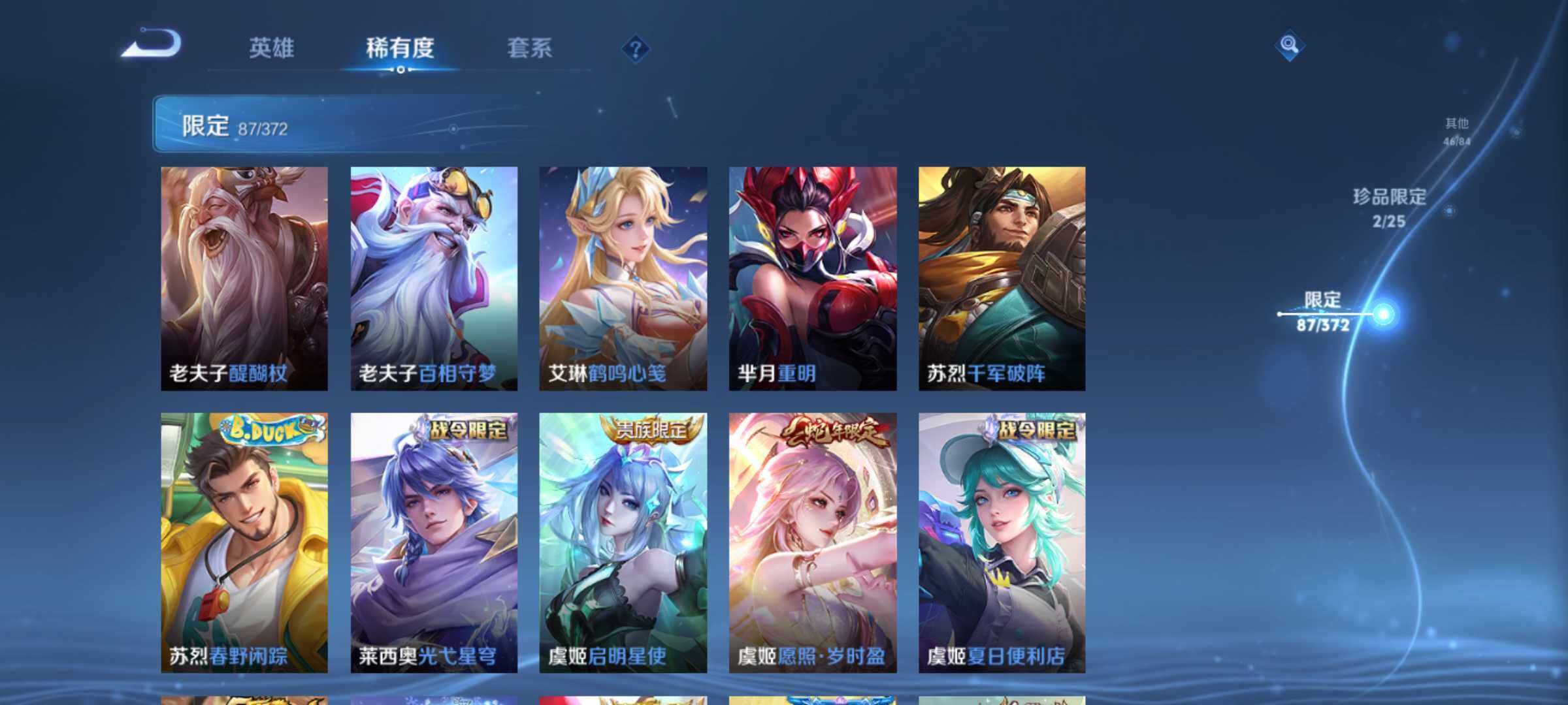账号亮点:诸葛亮星域神启 曜器灵螭龙剑,韩信群星魔术团 马超神骥逐星野,后羿神树通天,澜愿照九州拓,虞姬愿照岁时盈,云缨幻光神枪,桑启鸣野蒿,马可波罗妄想实况,马可波罗深海之息,赵云淬星耀世,王昭君乞巧织情,虞姬启明星使,李信一念神魔,干将莫邪久胜战神,达摩黄金狮子座,百里玄策白虎志,后羿黄金射手座,貂蝉仲夏夜之梦,孙尚香末日机甲,宫本武藏地狱之眼595