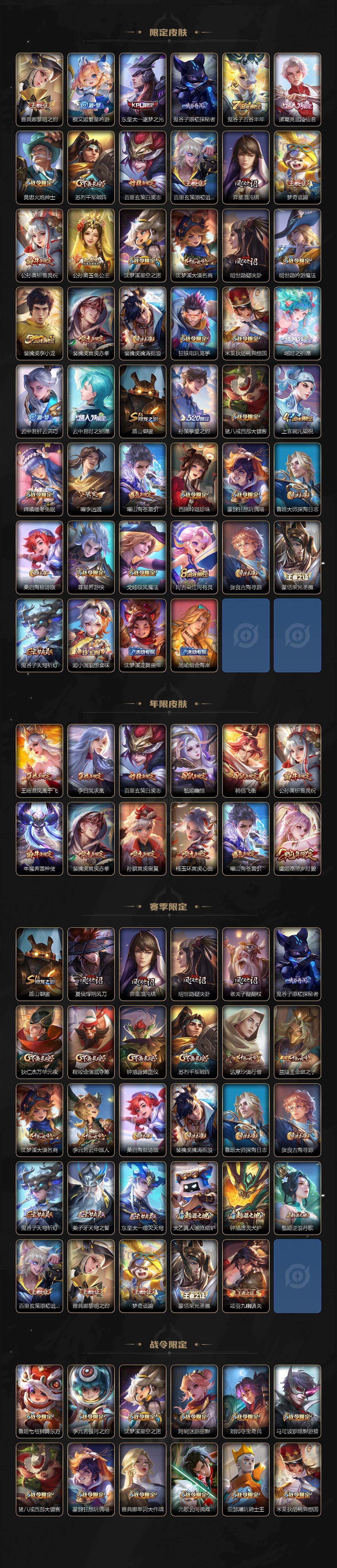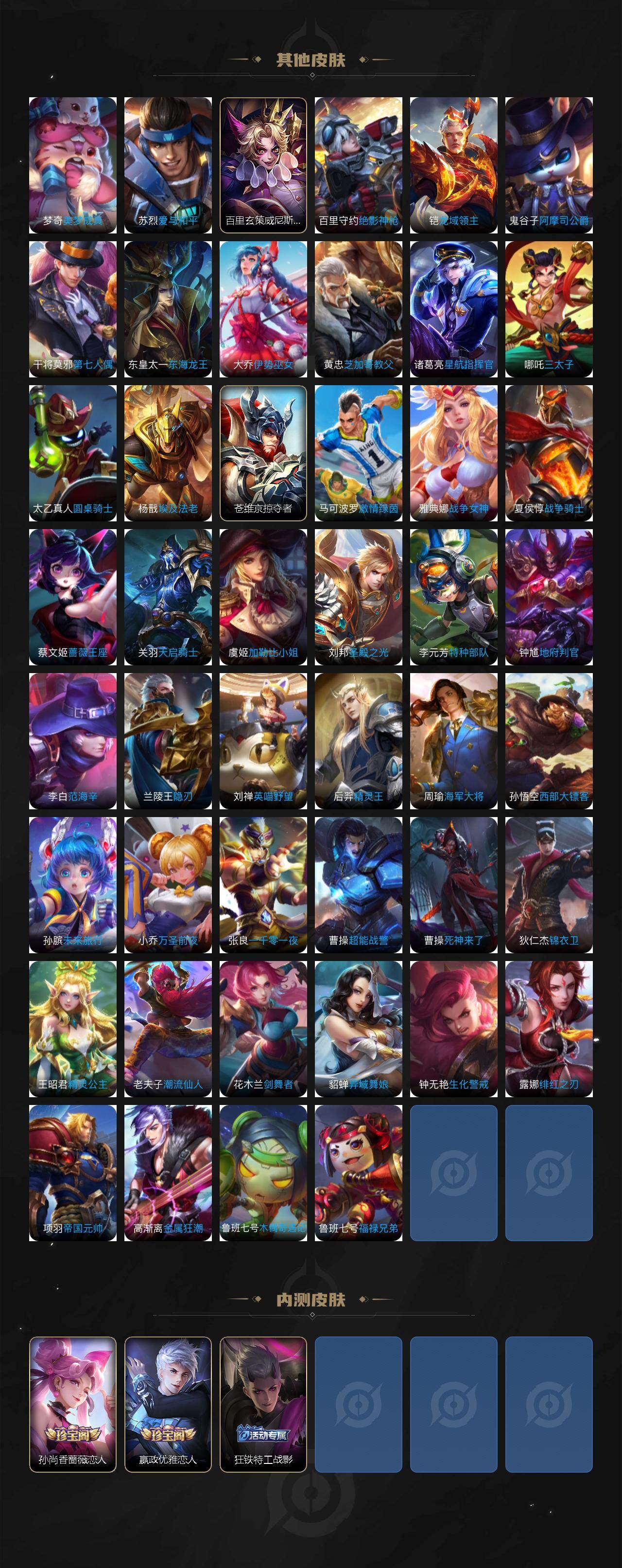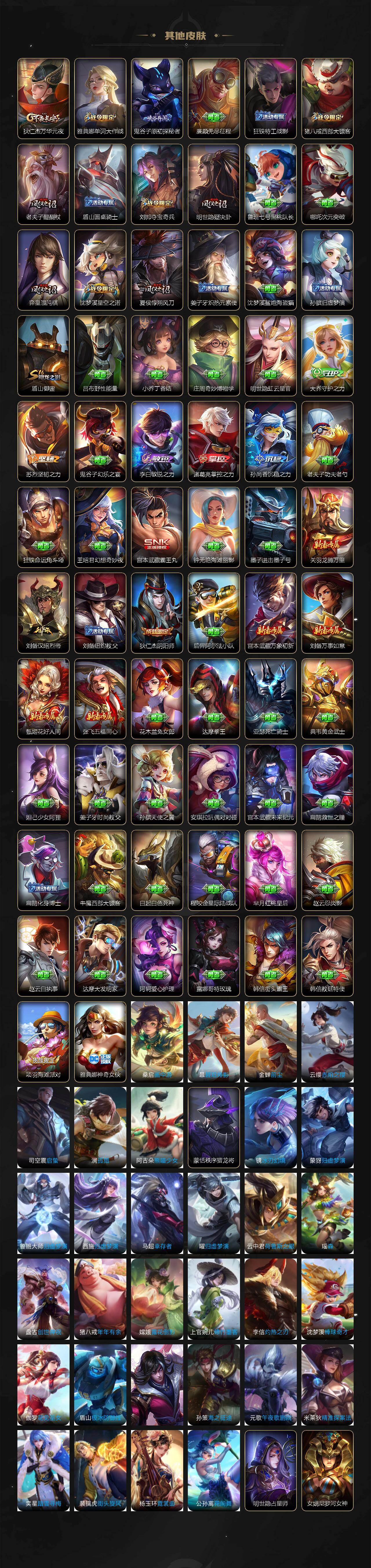 【传说皮肤】:虞姬愿照岁时盈,桑启鸣野蒿,公孙离记忆之芯,曜山海苍雷引,马超无双飞将,孙策挚爱之约,露娜启示之音,女娲补天,瑶时之祈愿,裴擒虎寅虎赤拳,王昭君乞巧织情,曜李逍遥 ,公孙离祈雪灵祝,铠绛天战甲,镜炽阳神光,虞姬启明星使,孙悟空零号赤焰,关羽武圣,达摩黄金狮子座,百里玄策白虎志,花木兰冠军飞将,后羿黄金射手座,诸葛亮武陵仙君,貂蝉