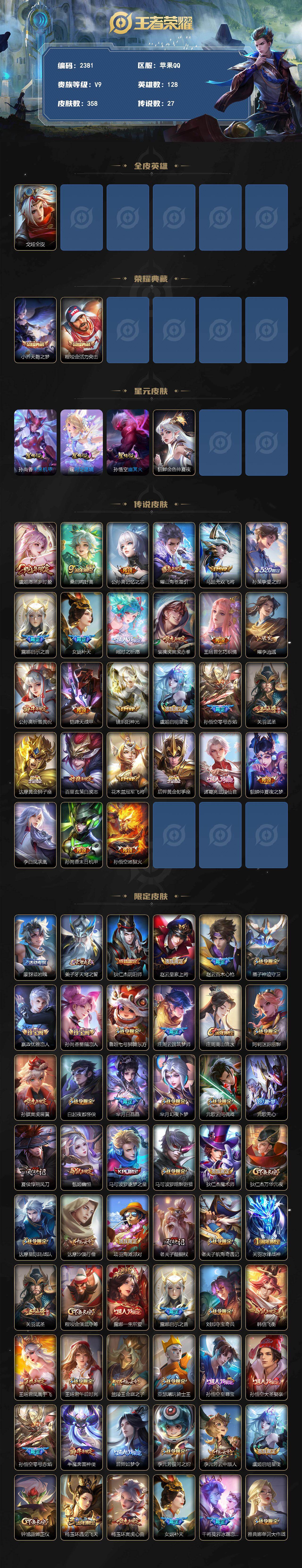 苹果Q-V9-永恒钻石I段位-128英雄-358皮肤-2典藏皮肤-27传说-10