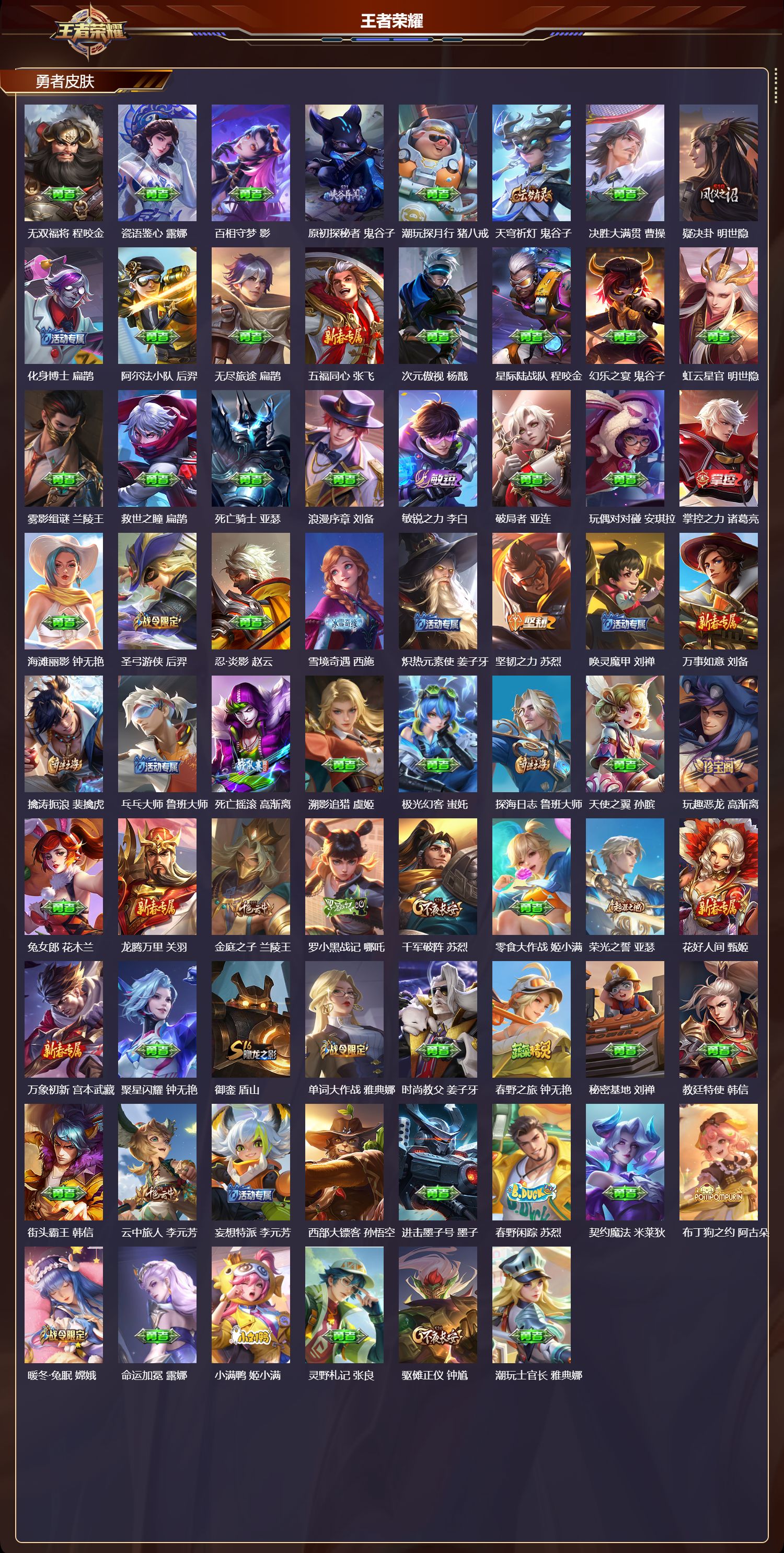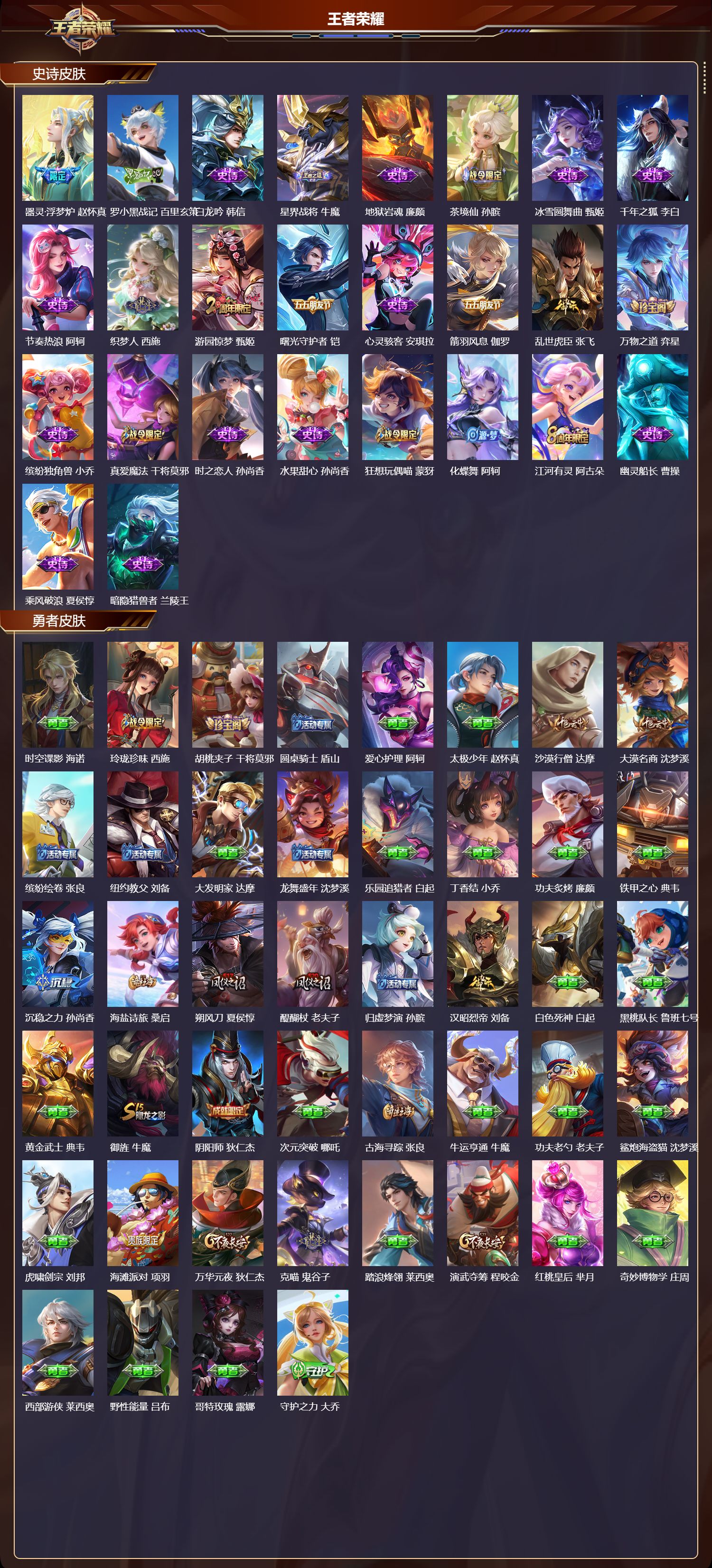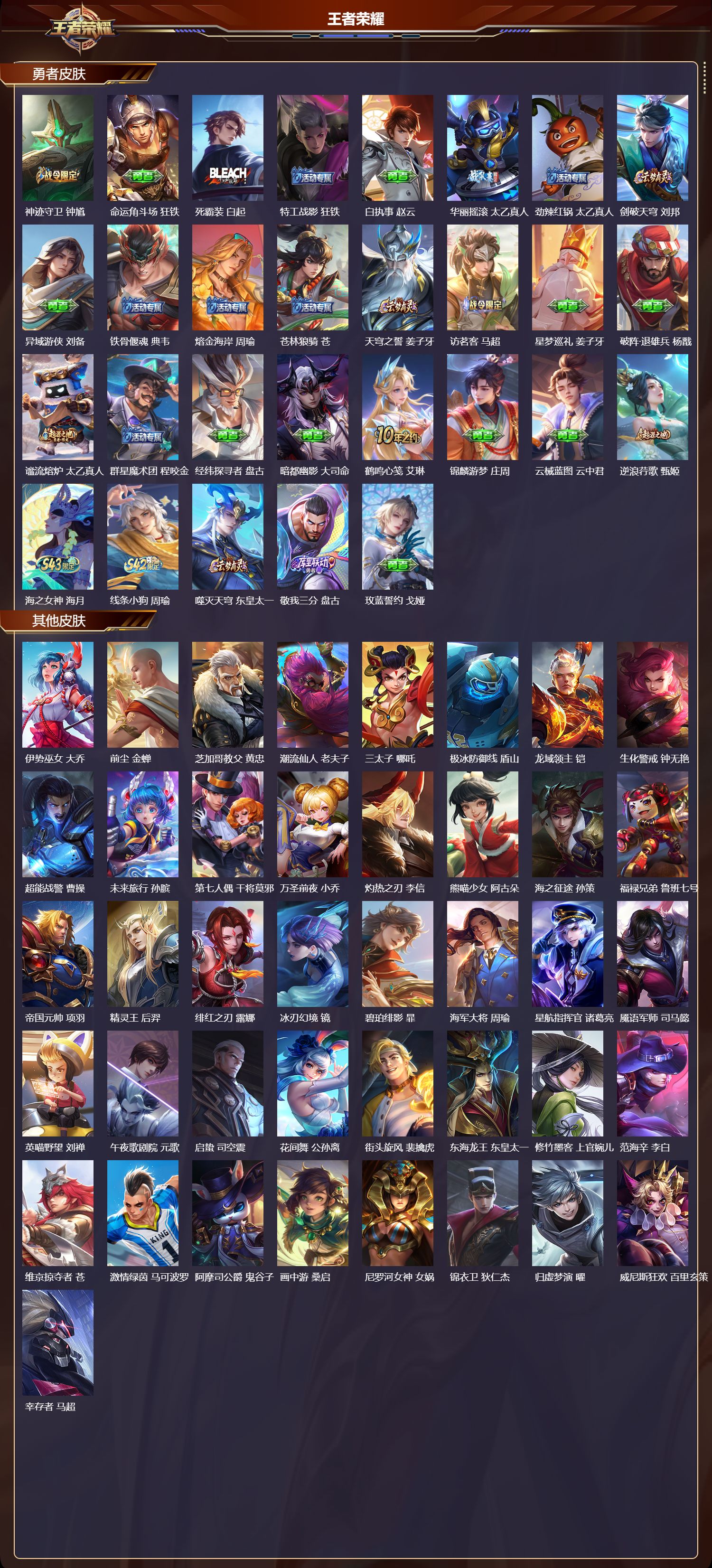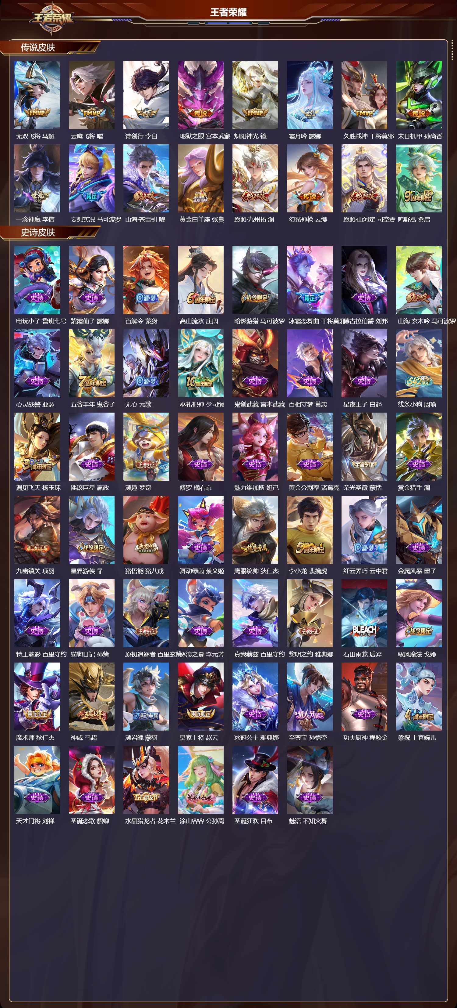 安卓QQ/至尊星耀/293皮肤/128英雄/0典藏/0珍品无双/0无双/0珍品传说/16传说/80史诗/8稀有英雄【16 传说皮肤】无双飞将 马超,云鹰飞将 曜,诗剑行 李白,地狱之眼 宫本武藏,炽阳神光 镜,霜月吟 露娜,久胜战神 干将莫邪,末日机甲 孙尚香,一念神魔 李信,妄想实况 马可波罗,山海·苍雷引 曜,黄金白羊座 张良,愿照·九州拓 澜,幻光神枪 云缨,愿照·山河定 司空震,鸣野蒿 桑