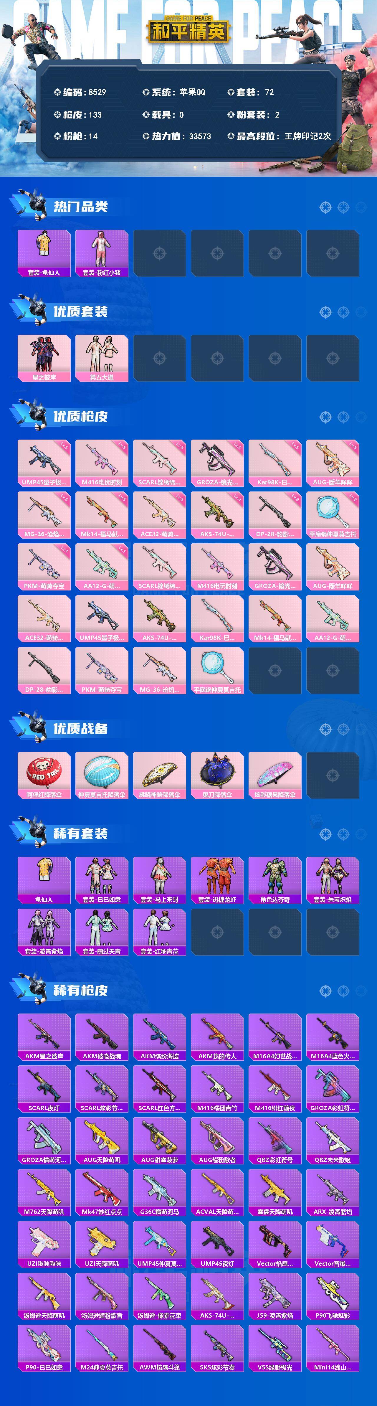 【8529】2粉装-14特效枪-0载具-0粉色飞行器-33573热力值-2王牌印记-72套装-133枪皮