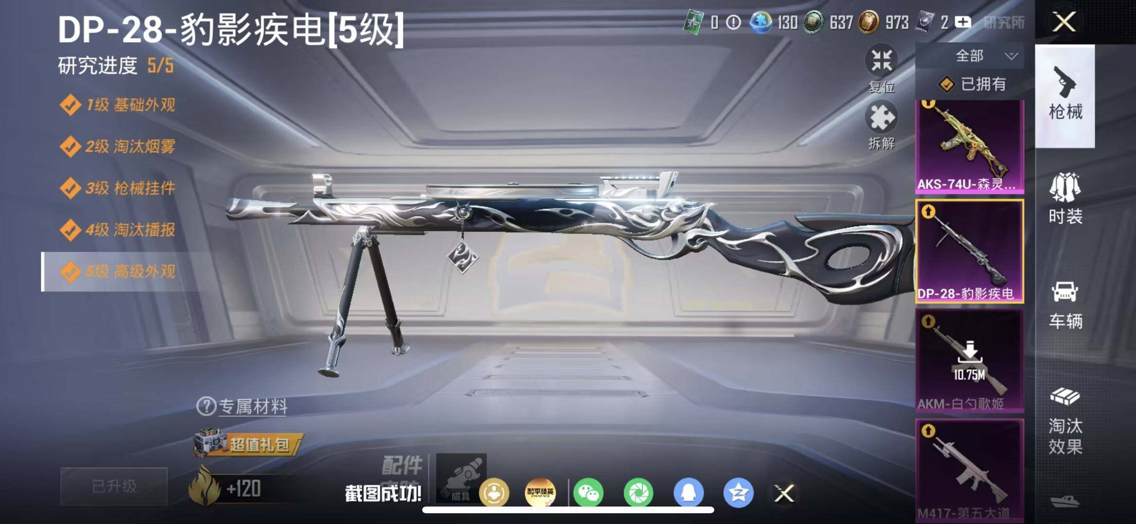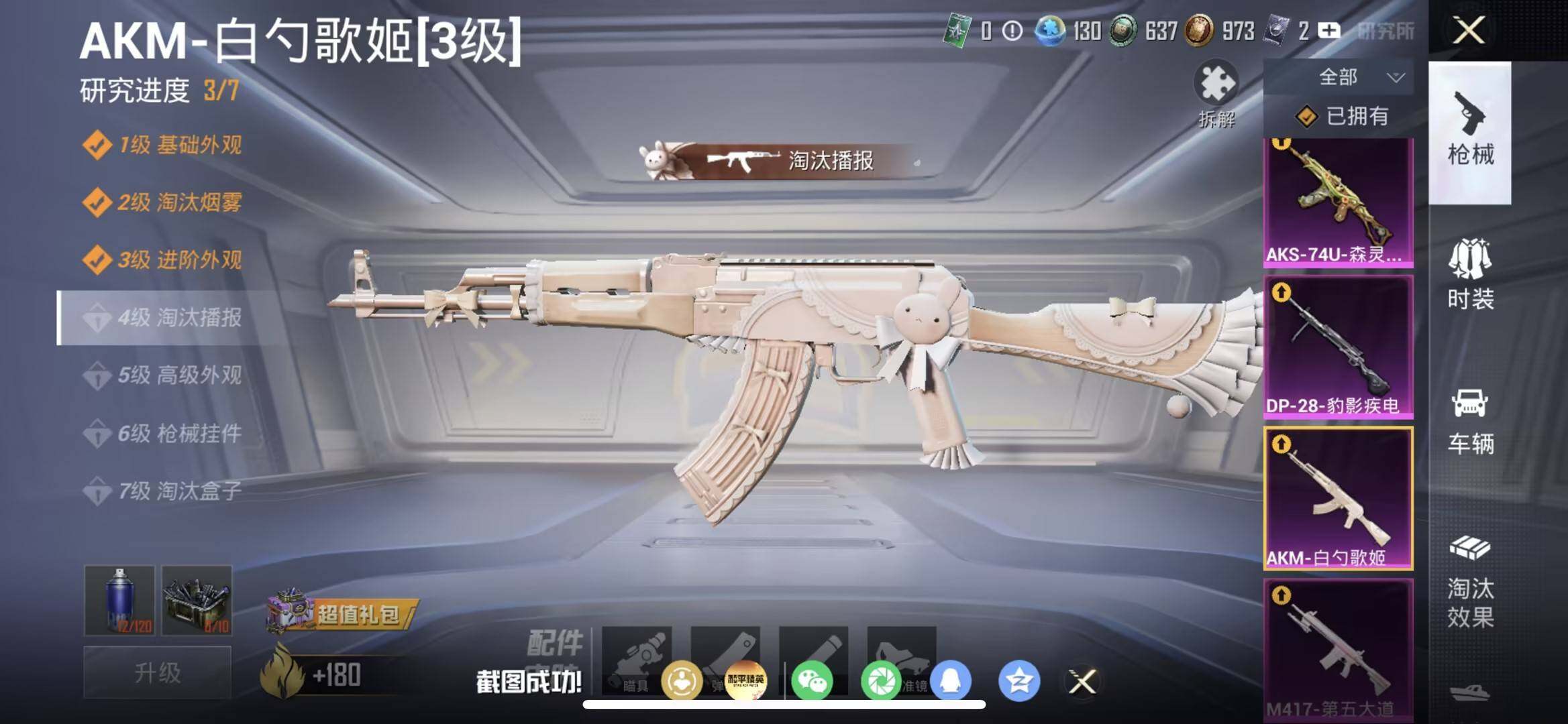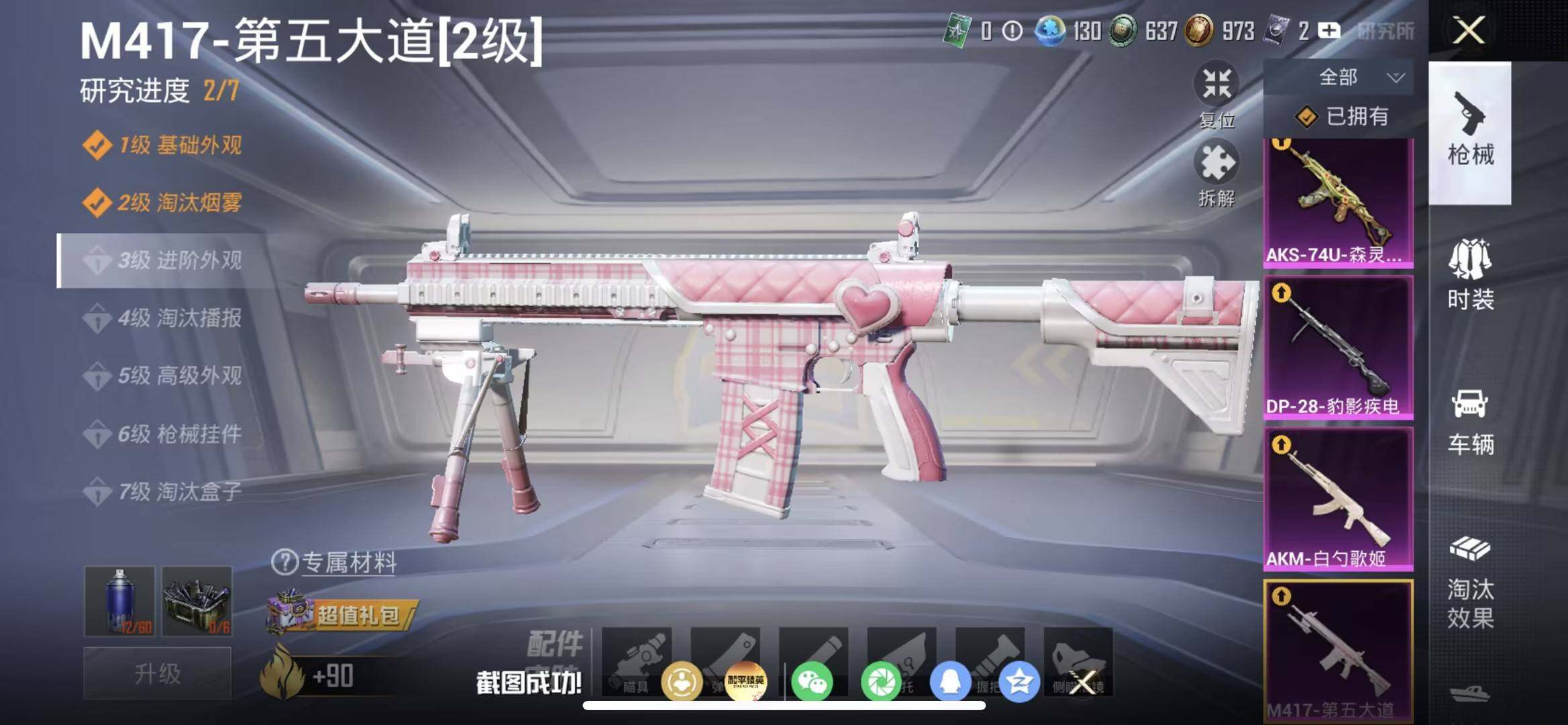 【粉色枪皮等级】:AKM-白勺歌姬(三级),UMP45-萌骑冒险(二级),AKS-74U-森灵之息(五级),Mk14-福马献瑞(四级),M417-第五大道(二级),DP-28-豹影疾电(五级),D