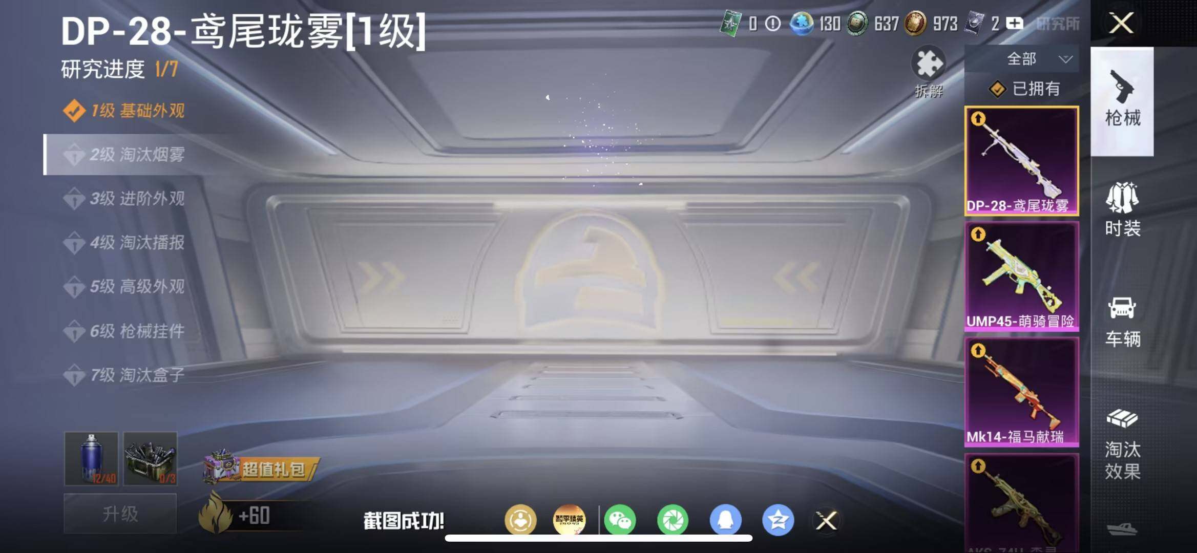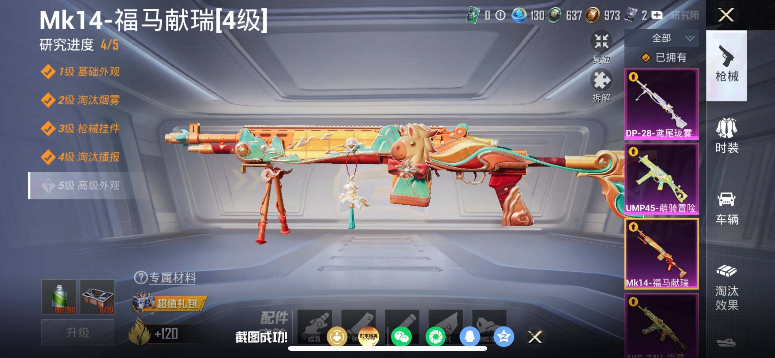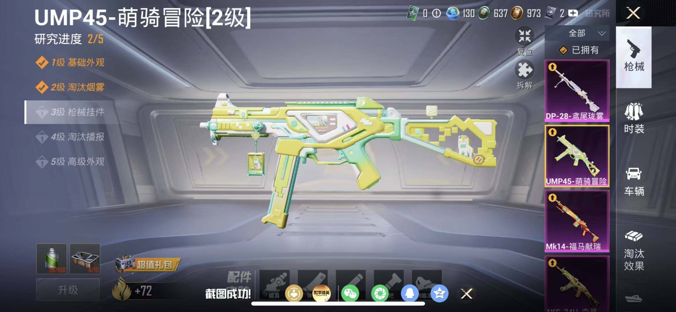 【粉色枪皮等级】:AKM-白勺歌姬(三级),UMP45-萌骑冒险(二级),AKS-74U-森灵之息(五级),Mk14-福马献瑞(四级),M417-第五大道(二级),DP-28-豹影疾电(五级),D