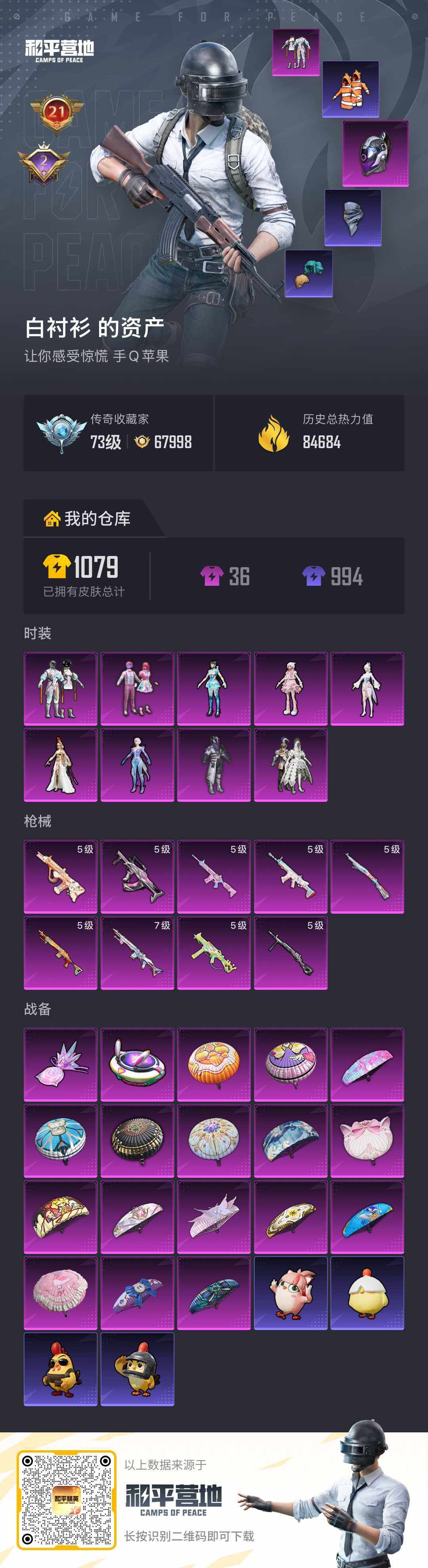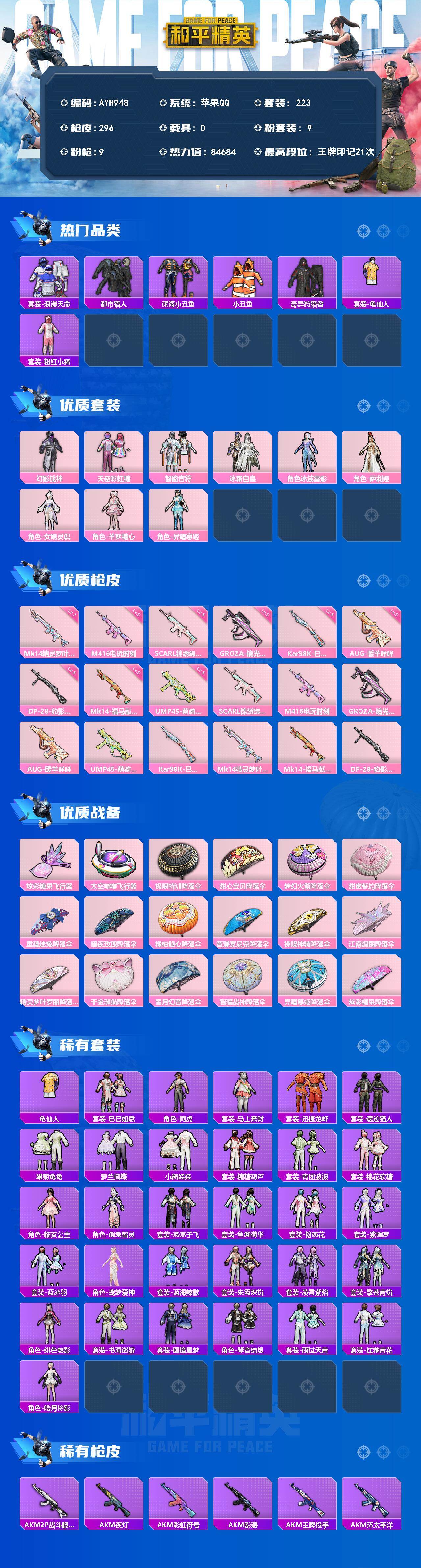 苹果 手Q-9粉装-9特效枪-0载具-2粉色飞行器-84684热力值-21王牌印记-223套装-296枪皮