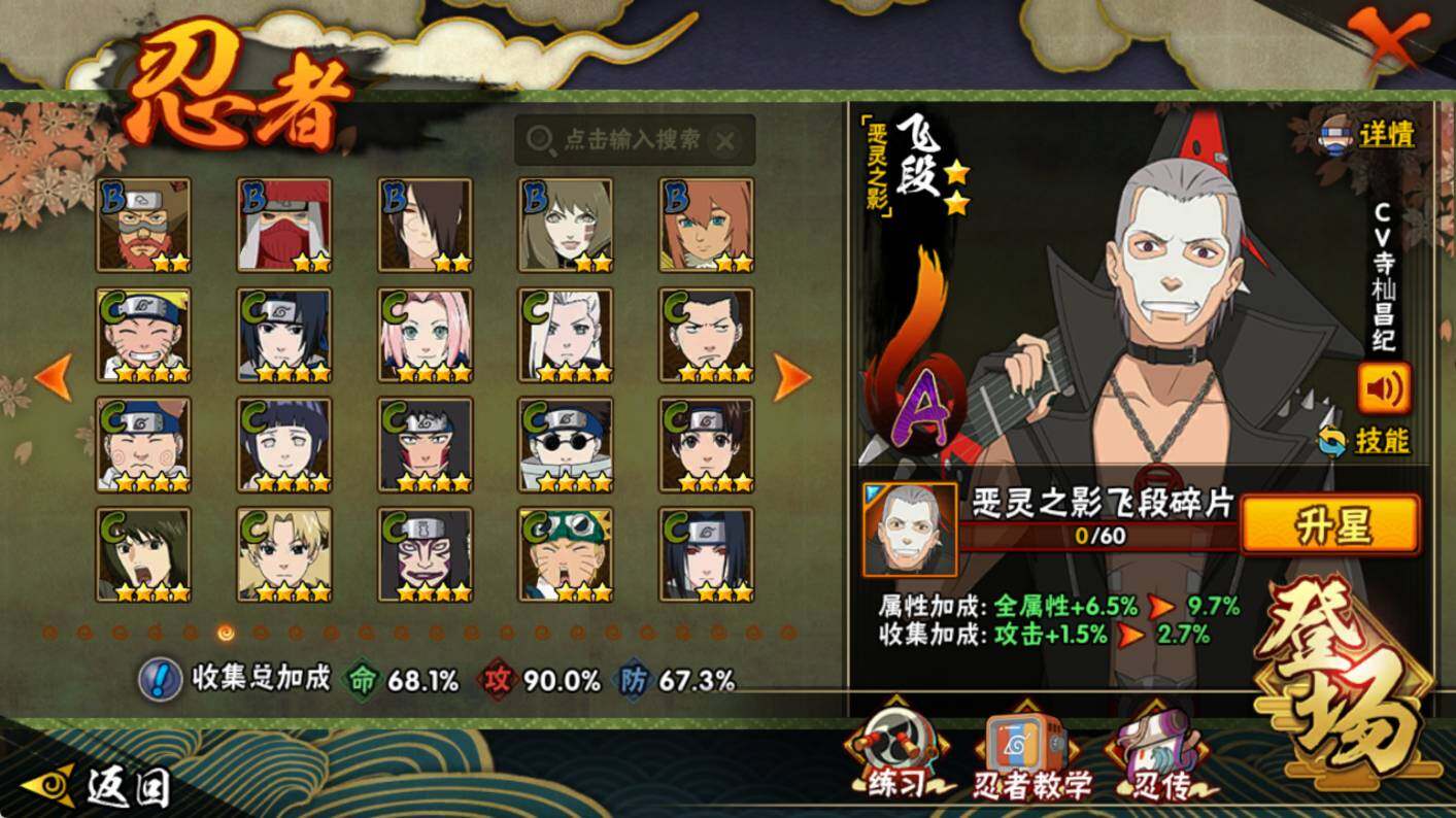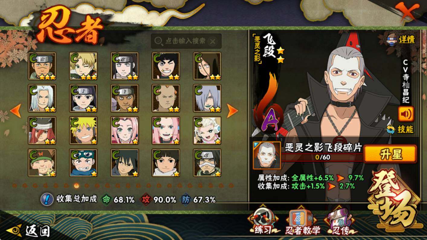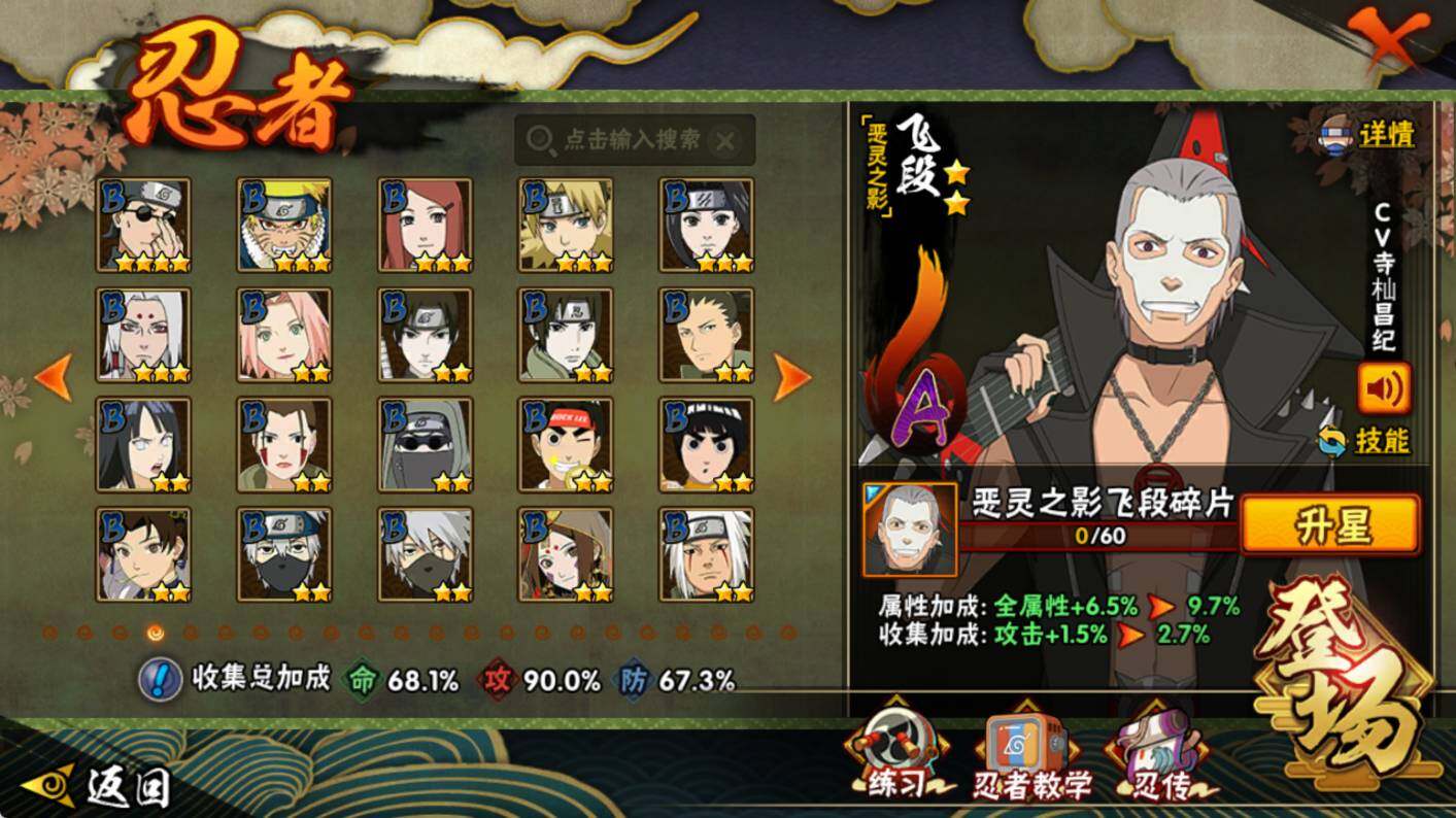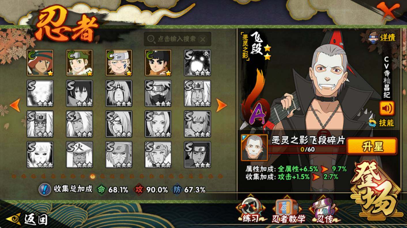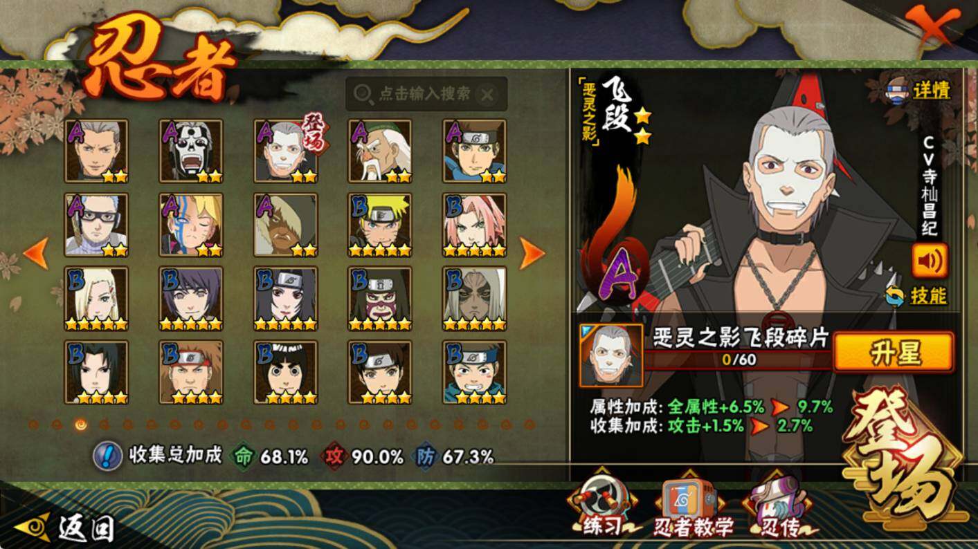 【S级忍者】:猿飞日斩「秽土转生」(3星),大野木「忍界大战」(3星),宇智波鼬「须佐能乎」(3星),自来也「舞之豪杰」(3星),大蛇丸(3星),波风水门(3星),迈特凯「死门」(3星),佩恩「天道」(3星),宇智波斑 「白面具」(3星宇智波斑「白面具」),漩涡鸣人·宇智波佐助(3星)