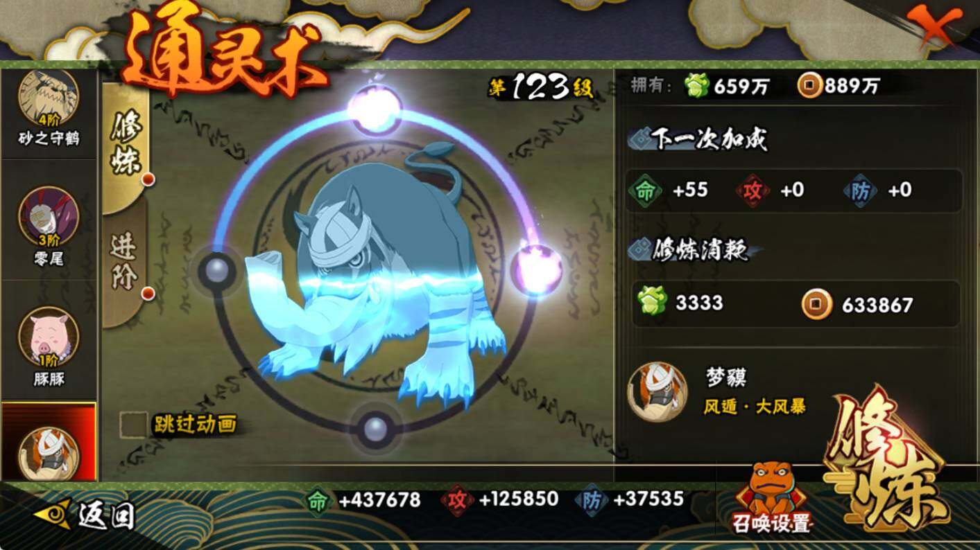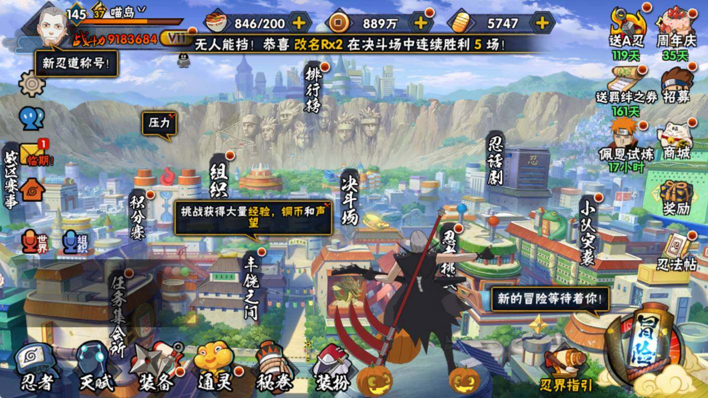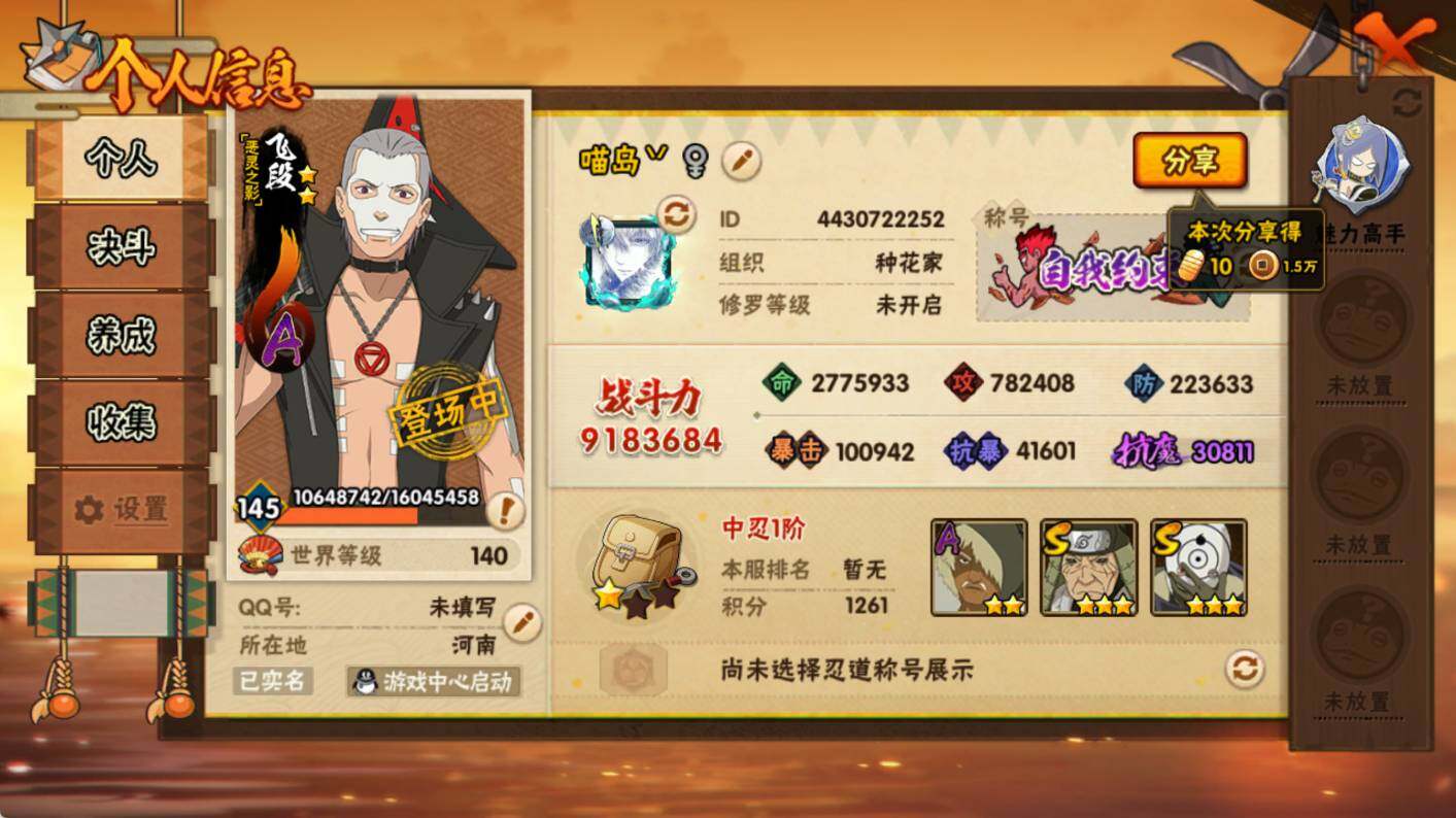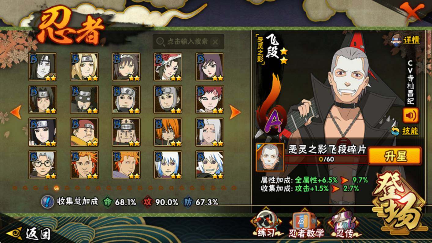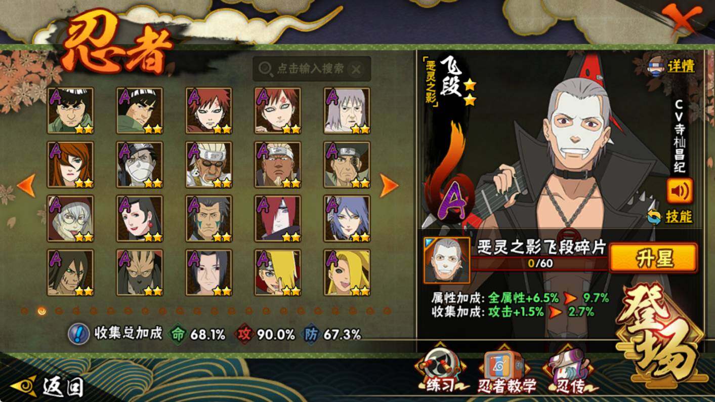 【S级忍者】:猿飞日斩「秽土转生」(3星),大野木「忍界大战」(3星),宇智波鼬「须佐能乎」(3星),自来也「舞之豪杰」(3星),大蛇丸(3星),波风水门(3星),迈特凯「死门」(3星),佩恩「天道」(3星),宇智波斑 「白面具」(3星宇智波斑「白面具」),漩涡鸣人·宇智波佐助(3星)
