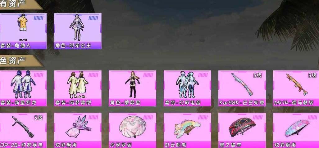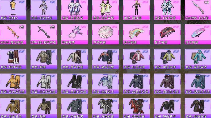 【粉色枪皮等级】:Kar98K-巳巳如意(五级),Mk14-福马献瑞(五级),DP-28-豹影疾电(五级)