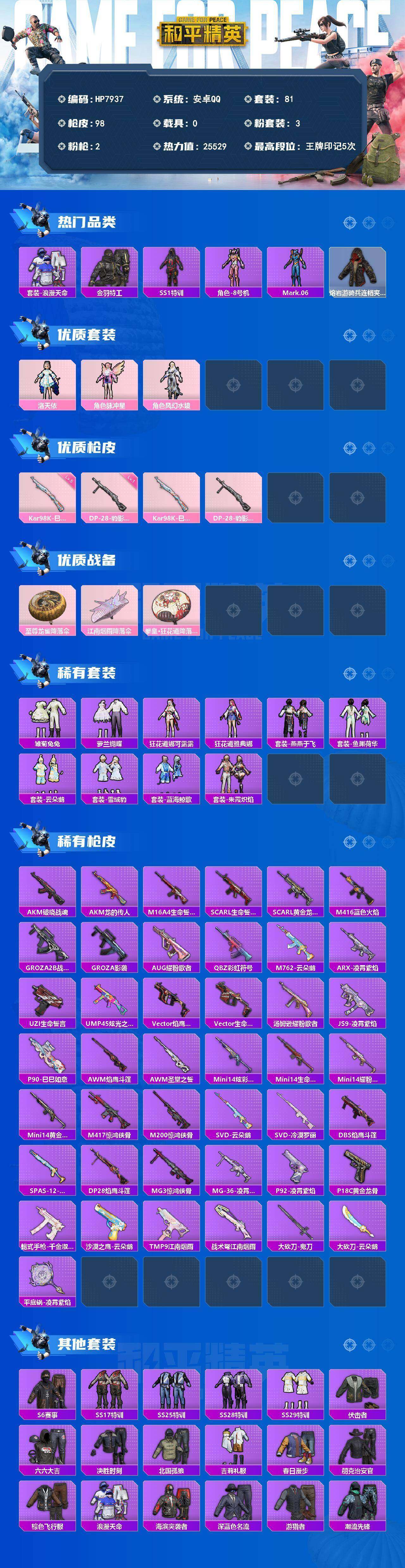 法斗尖角面罩/8号机/蓝螳螂/熔岩游骑兵面罩/浪漫天命/冷酷挑战者/卖崽青蛙/白光莹/金羽特工/SS1特训/熔岩游骑兵连帽夹克/洛天依/脉冲星/风幻水境/98k巳巳如意5级/DP28豹影疾电 没战神框(3粉装2粉枪)HP7937-0载具-0粉色飞行器-25529热力值-5王牌印记-81套装-98枪皮