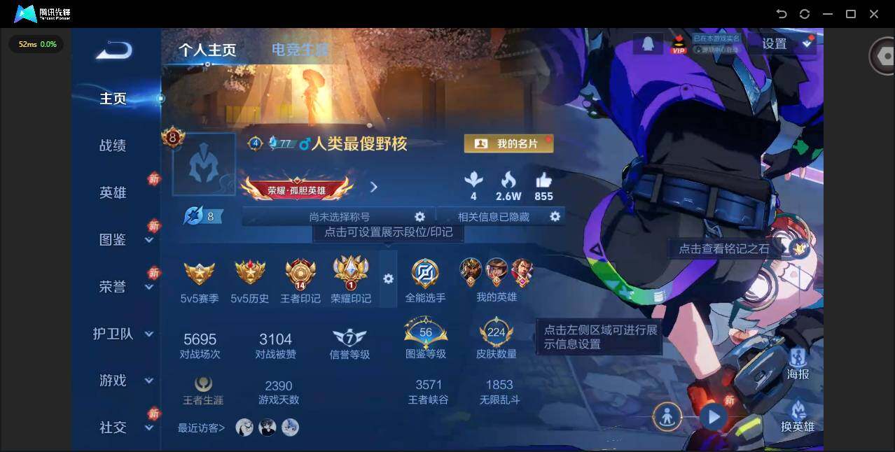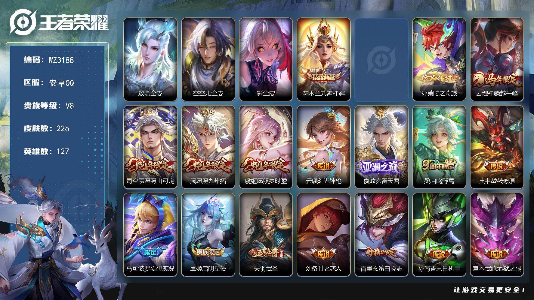 【秒换绑】安卓Q-V8-最强王者段位-127英雄-226皮肤-1典藏皮肤-1珍